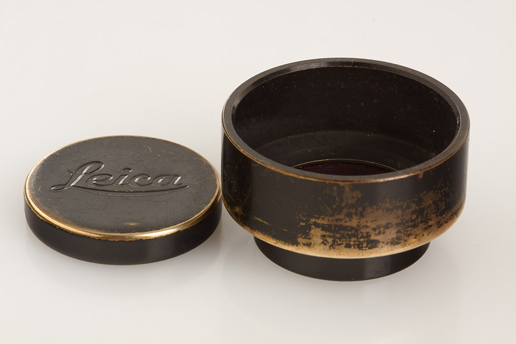 black/nickel version with good lenses, both original caps and hood and a small beige soft bag marked 'E.Leitz Wetzlar' in condenser logo