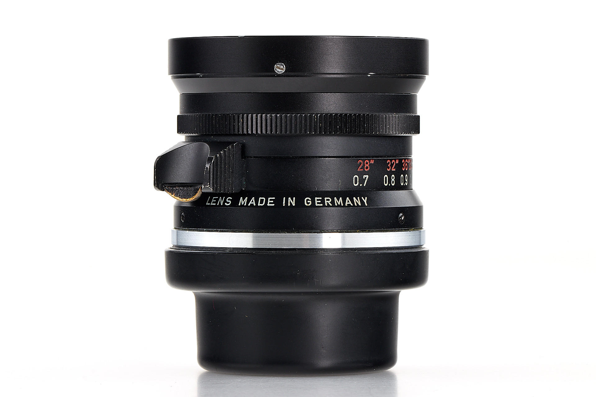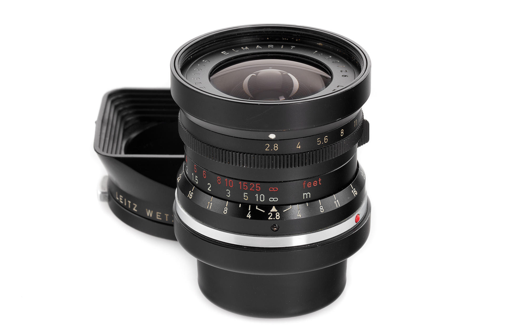 early and rare first type Wetzlar Elmarit 28mm (9-element), in excellent condition, black painted infinity lock, very good optics, with rear cap and 12501 hood