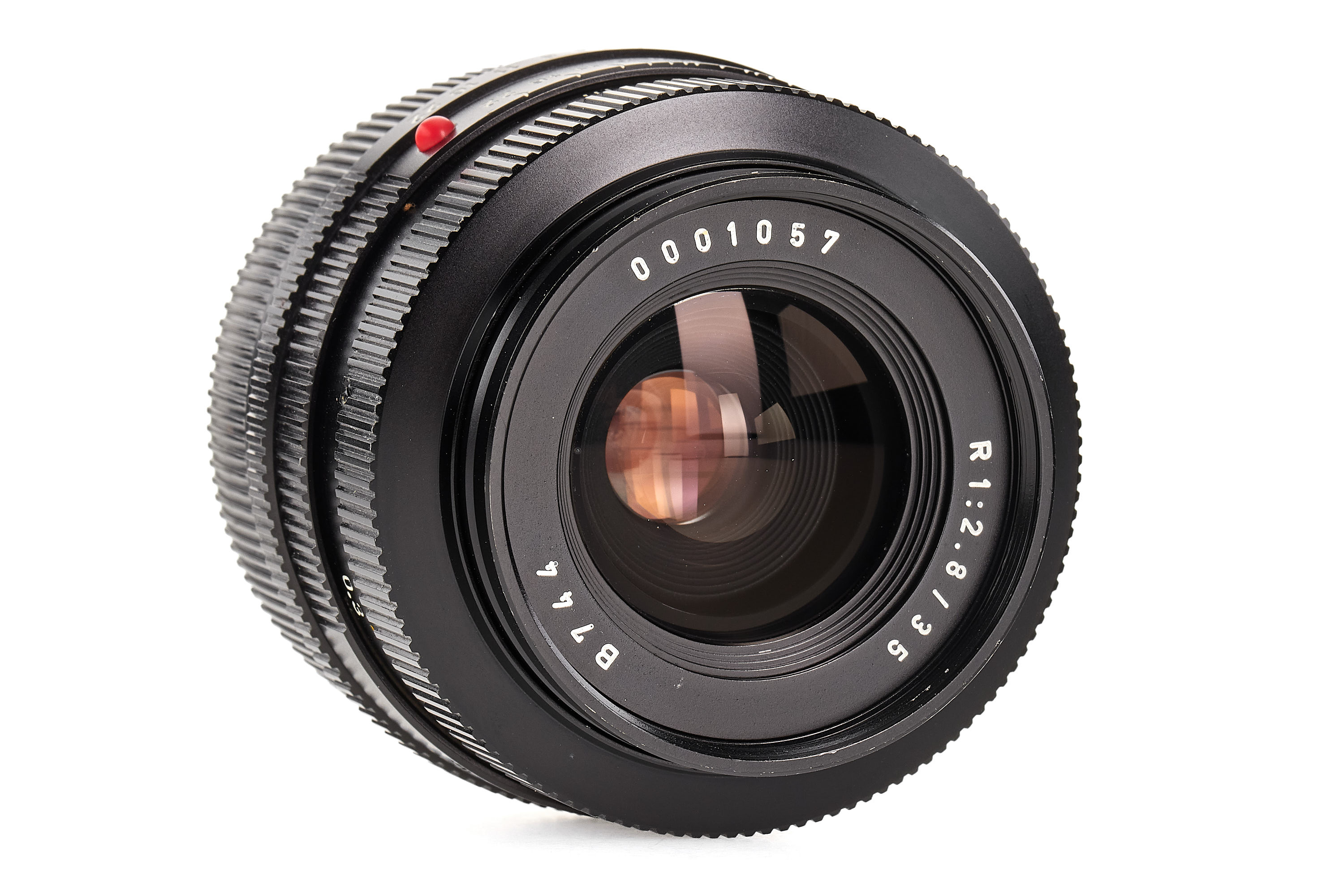 A very rare original Elmarit-R 2.8/35mm prototype, special serial number no.0001057 and optical formula 'B744' engraved on the front ring but without Elmarit-R mention, 3-cam mount, note the slightly shorter front rim, in almost mint condition, optics showing some scratches on the rear element, with rear lens cap.