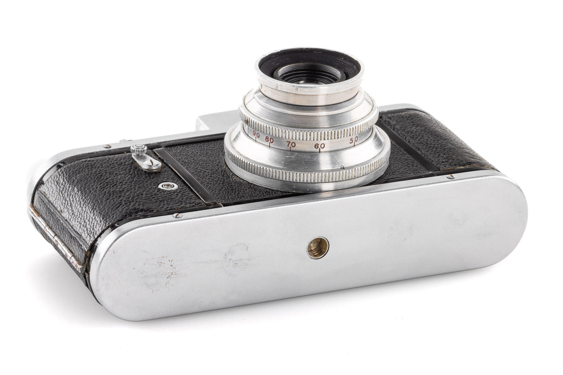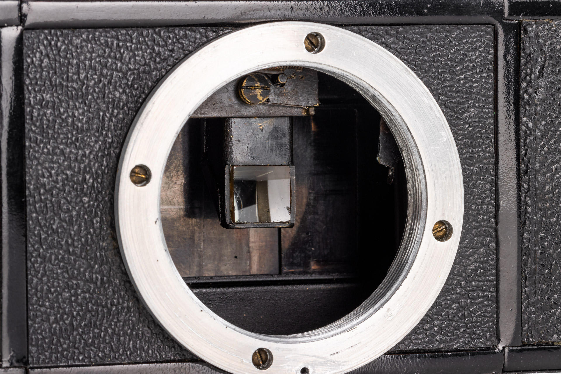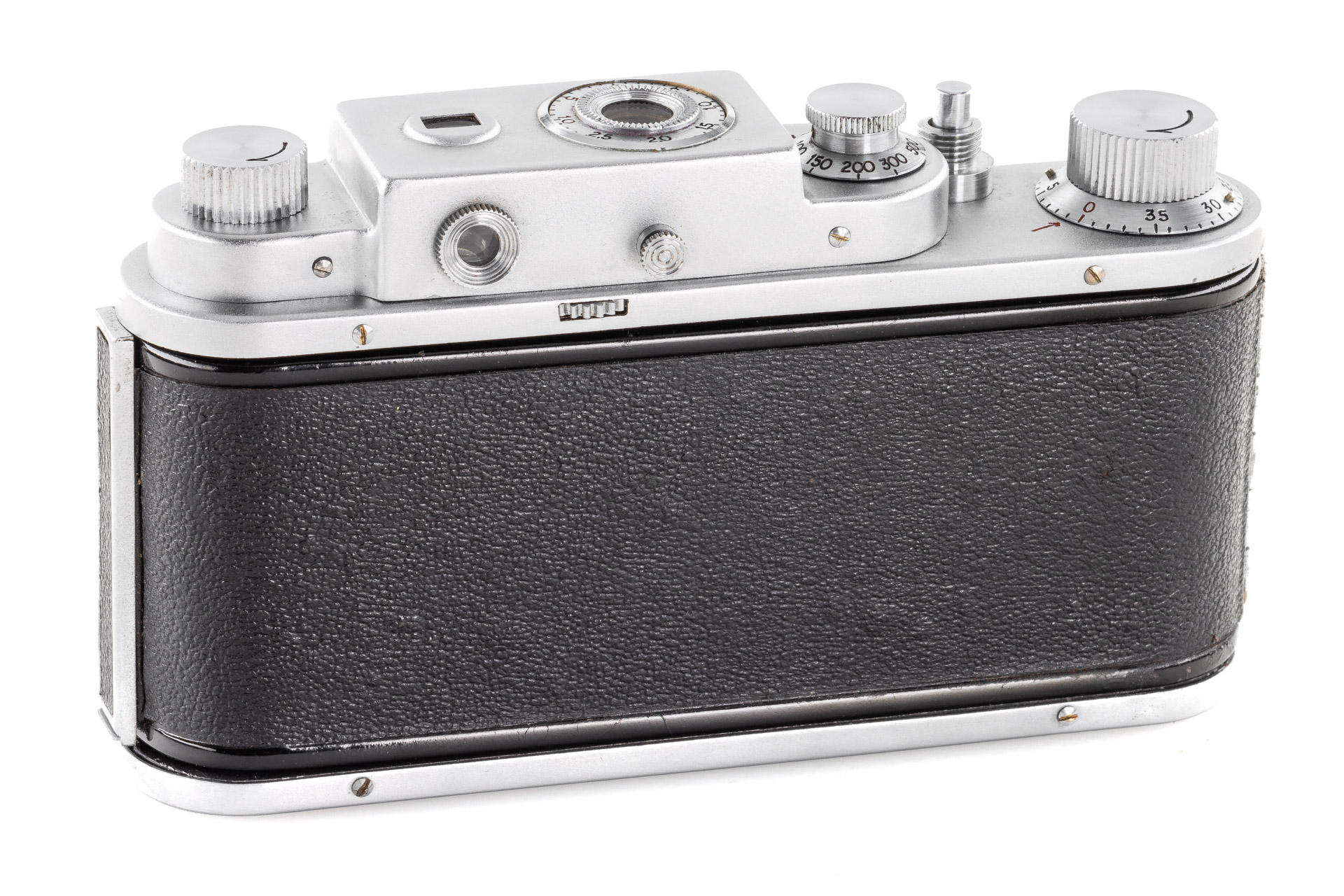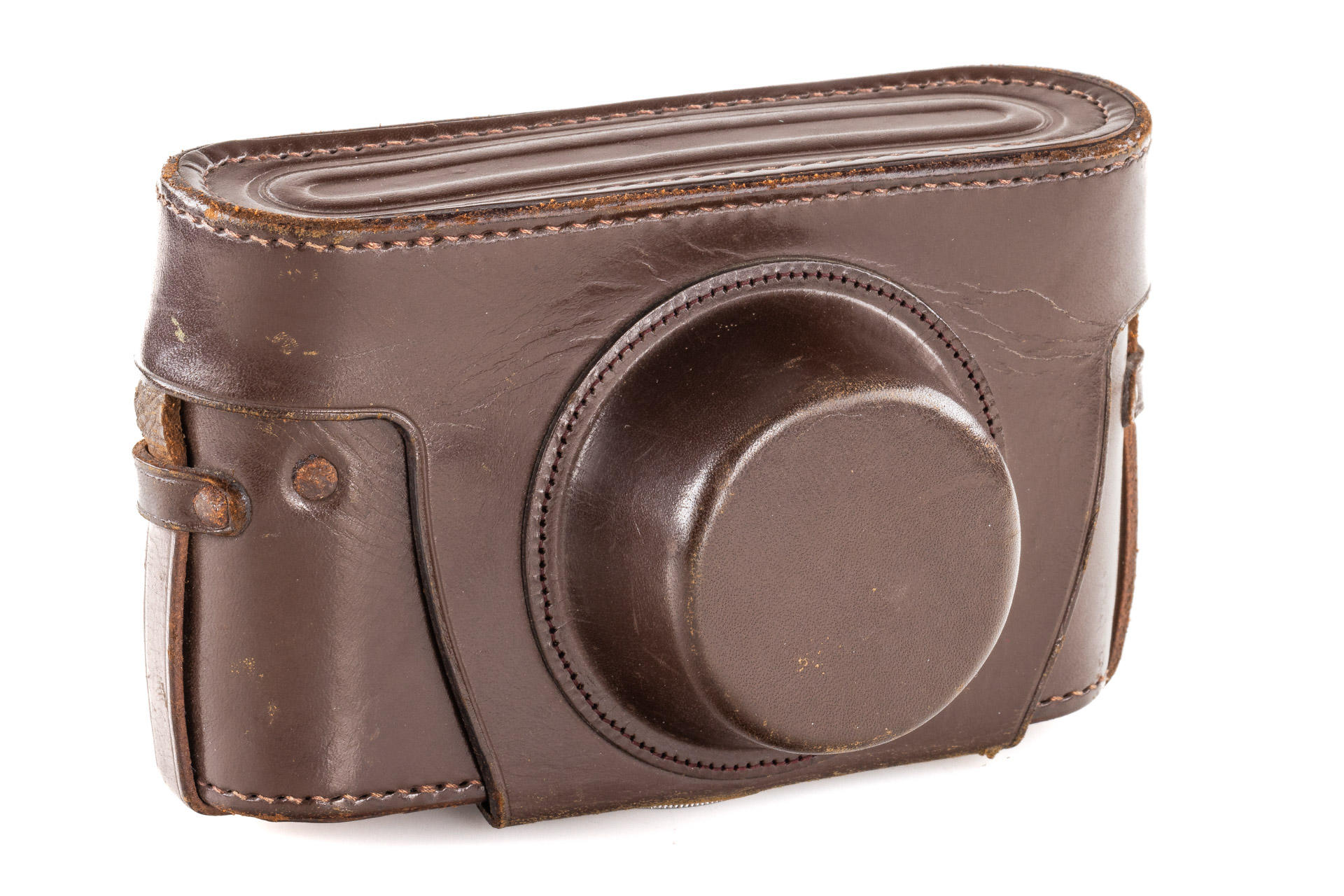 One of the rarest Leica copies in existence, the Eltina is a Japanese 35mm camera, designed and made by Shinjiro Ehira (founder of the Ehira Optical Works). This special camera incorporates a unique periscope focusing system, viewfinder with parallax correction and interchangeable lenses. It is for sure one of the most interesting and technically advanced Leica copies in existence. The offered model is in beautiful, near-mint condition and working order; comes with an unmarked lens and leather case. Another prototype Eltina (slightly different, already engraved with the camera name) is illustrated in 'The Collector's Guide to Japanese Cameras' on page 160.