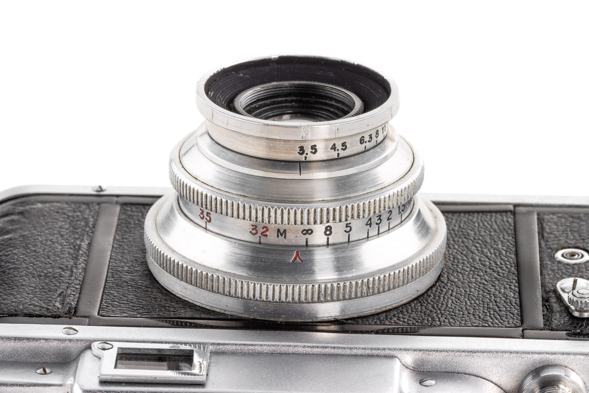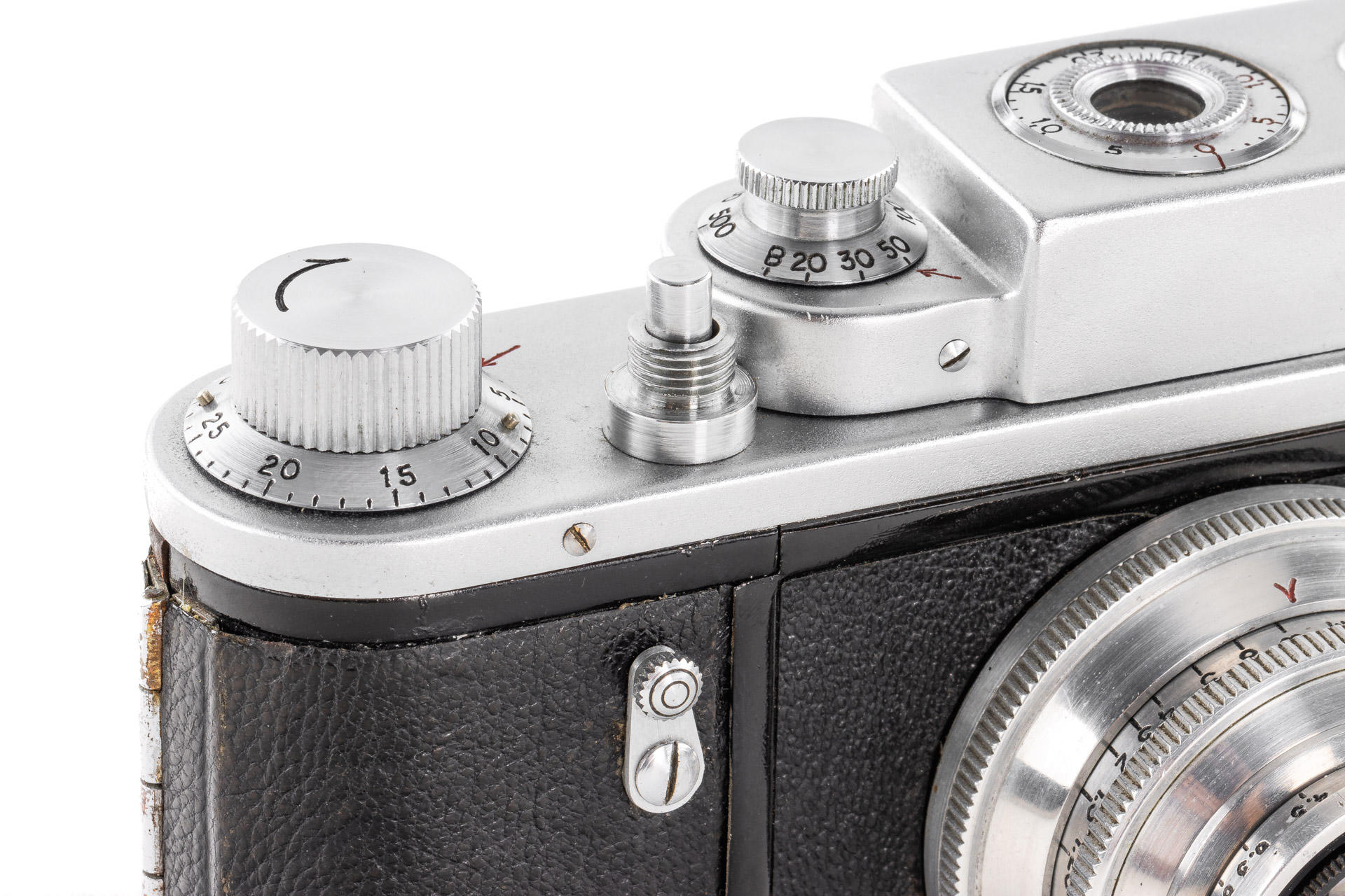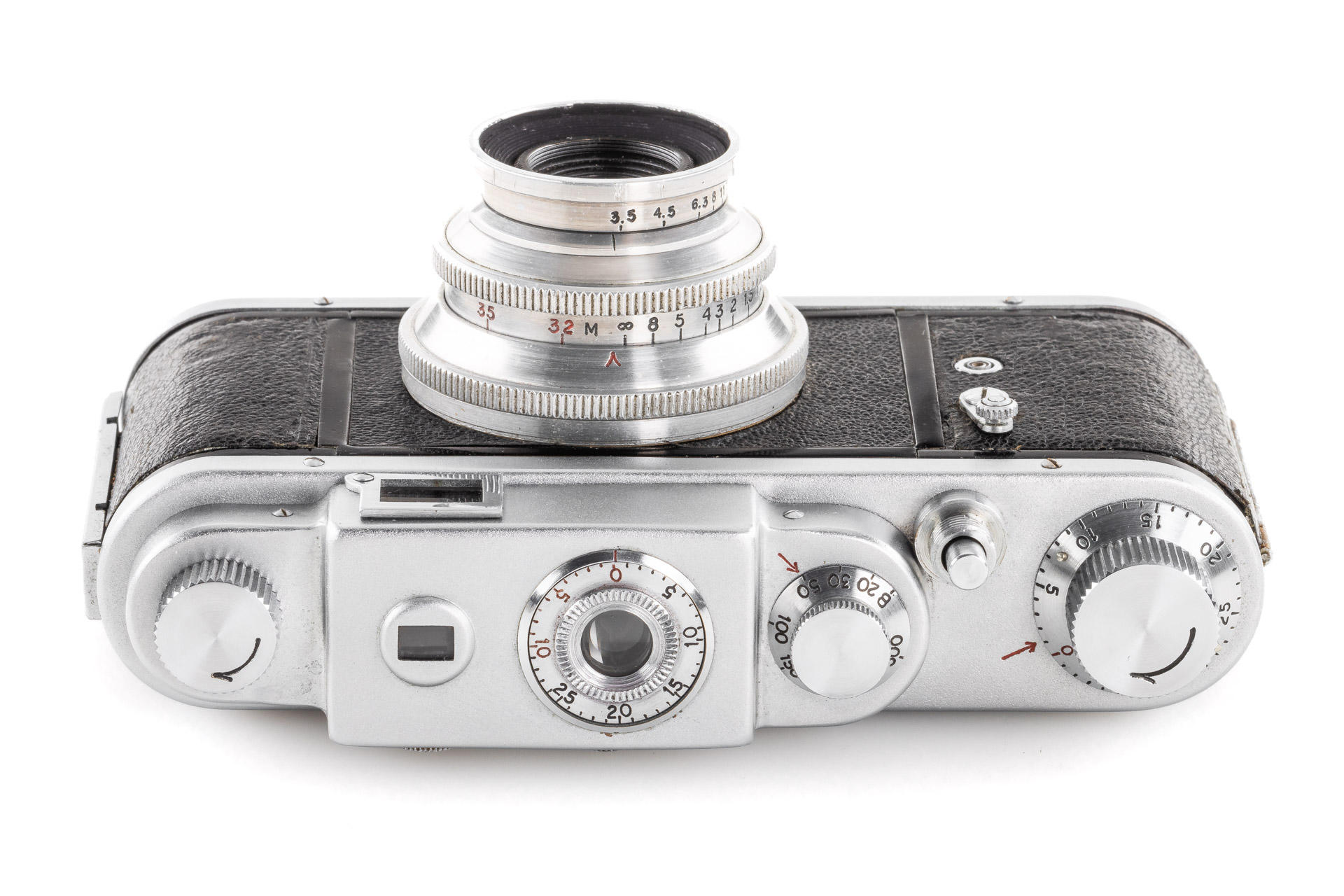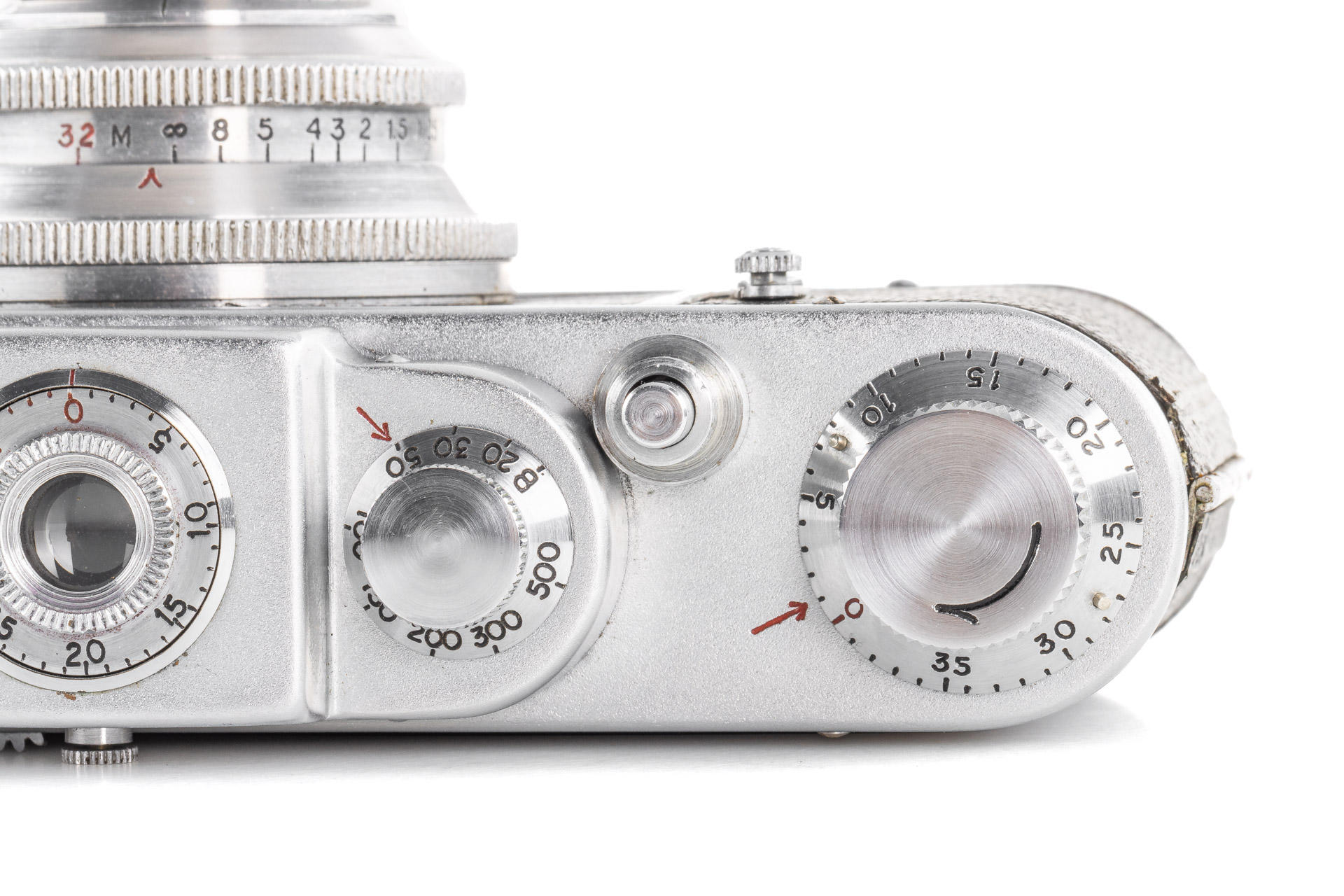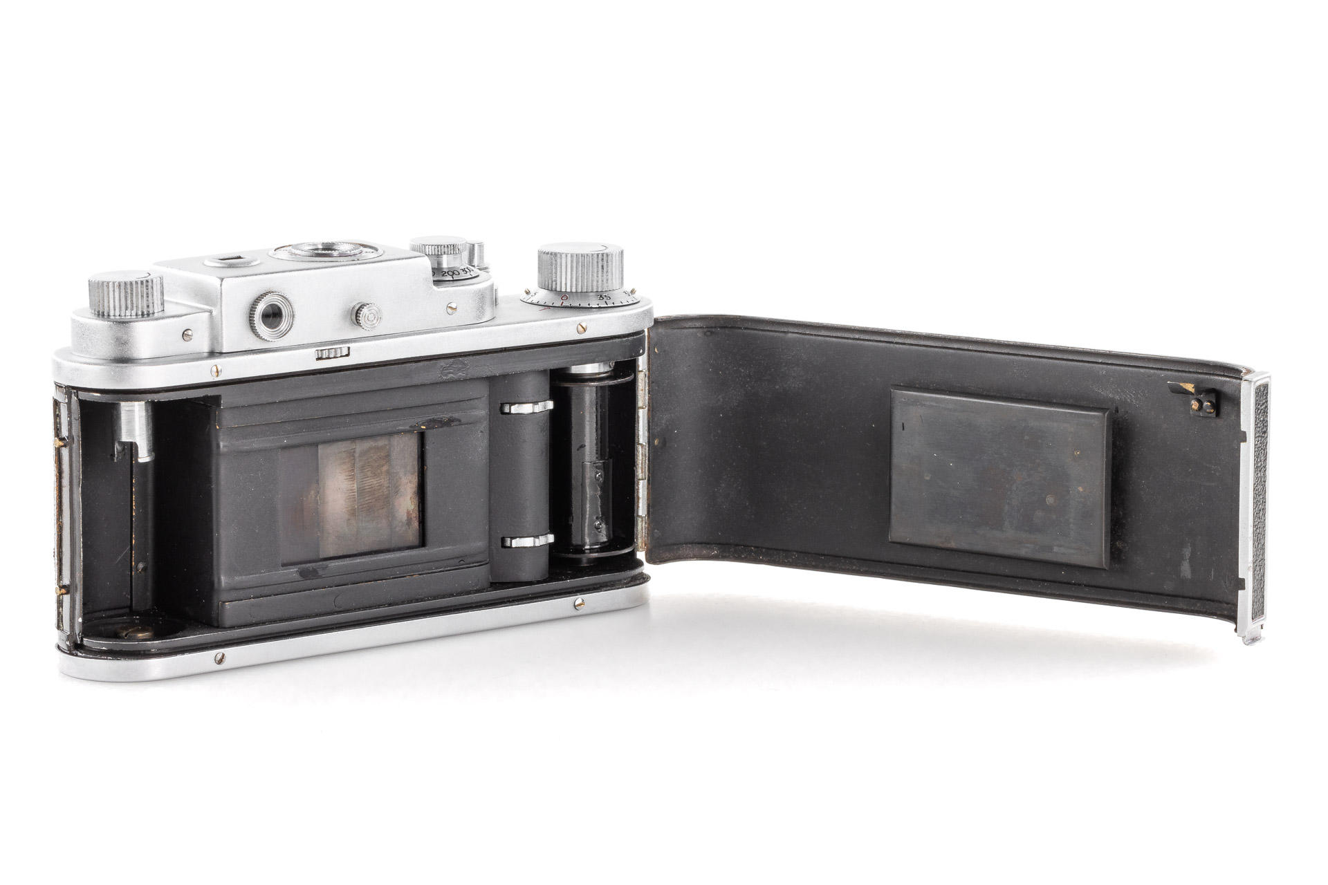 One of the rarest Leica copies in existence, the Eltina is a Japanese 35mm camera, designed and made by Shinjiro Ehira (founder of the Ehira Optical Works). This special camera incorporates a unique periscope focusing system, viewfinder with parallax correction and interchangeable lenses. It is for sure one of the most interesting and technically advanced Leica copies in existence. The offered model is in beautiful, near-mint condition and working order; comes with an unmarked lens and leather case. Another prototype Eltina (slightly different, already engraved with the camera name) is illustrated in 'The Collector's Guide to Japanese Cameras' on page 160.