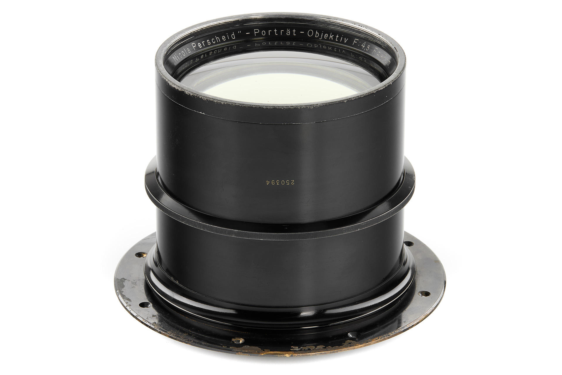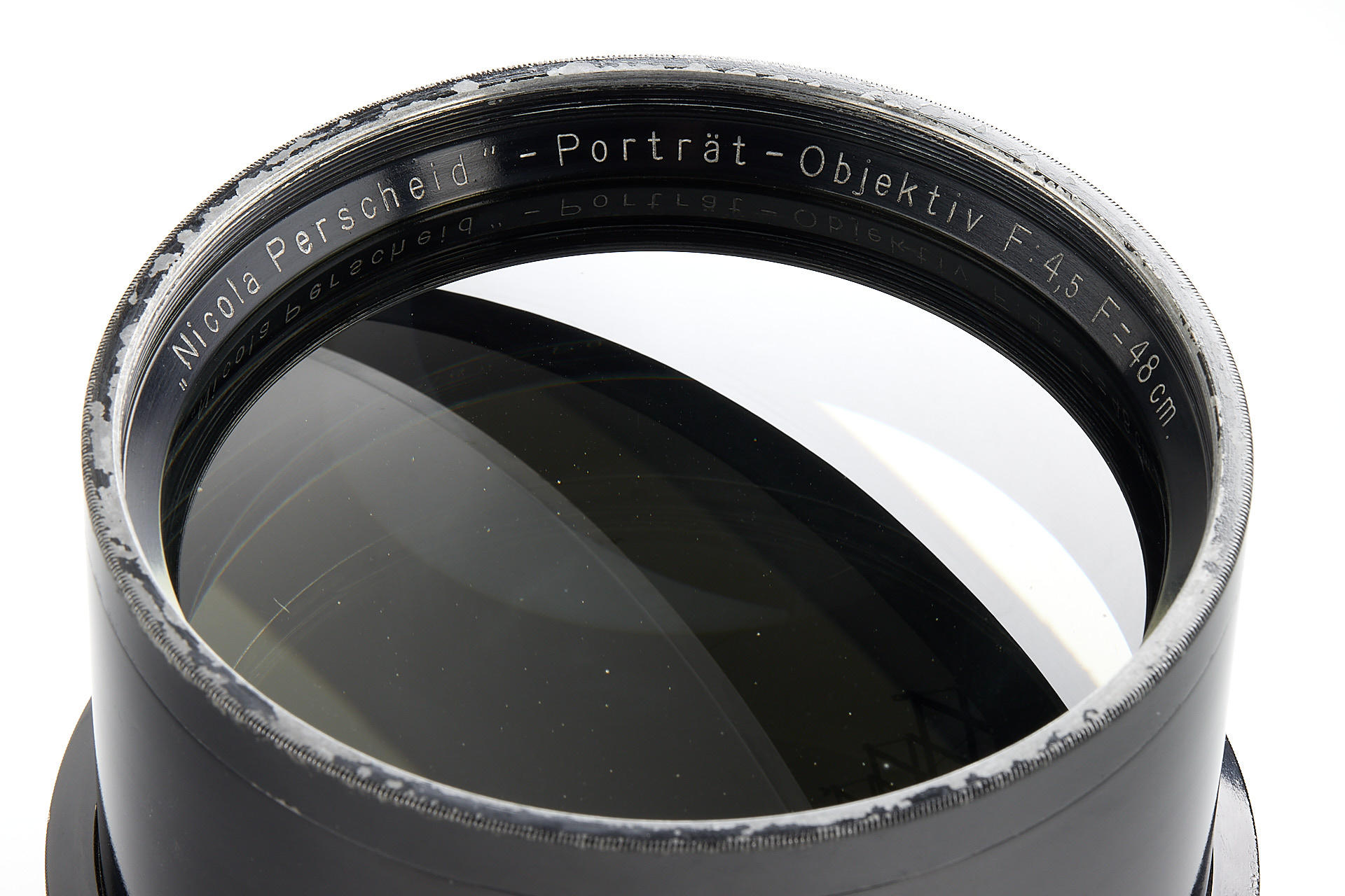 famous Nicola Perscheid portrait lens, here in the sought-after, large 48cm version, in good cosmetic condition, very good optics, with original mounting ring (slightly dented)