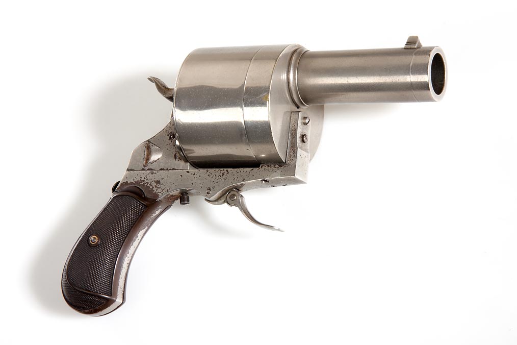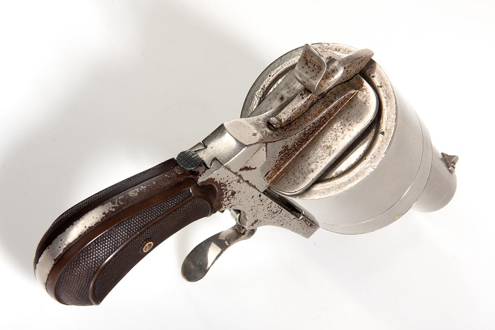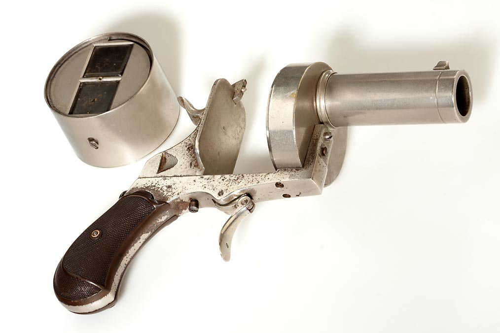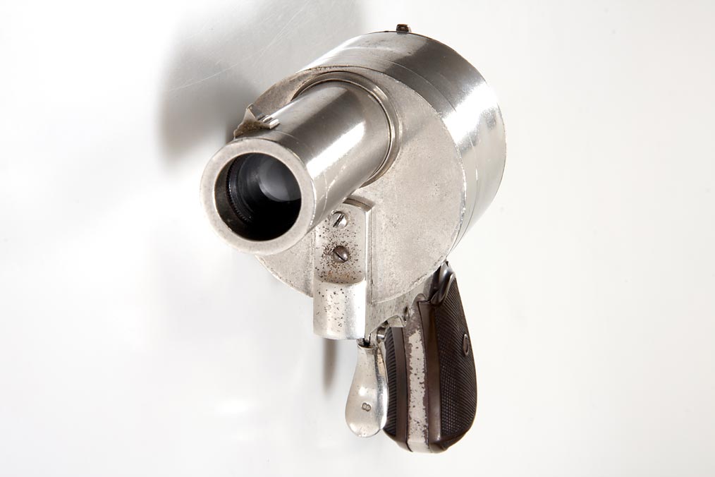 the camera was designed by Albert Posso (1854-1932) for the French company Enjalbert in the late 19th-century. It is thought that only 14 of these were made with fewer than six surviving examples on record, most of those being in museums in the USA, Europe and Asia. Albert Posso, was a French Alsacian who worked as a gunsmith in Paris during the siege of 1870-71.When Alsace was lost to the Germans shortly afterwards he became a German national completing his military service as senior gunsmith. On his return to France in 1877 Posso was employed by the French photographic firm Enjalbert expressly to design a camera which looked like a gun. Enjalbert had no experience of gun production and it was almost certain that Posso's design skills earned him the job. The camera's appearance owes everything to his skill and expertise which led to the production of one of the most effective and iconic disguised cameras. It is also one of the first handheld cameras in photographic history. The cylinder contains a magazine mechanism for 10 plates each 16x16mm. This highly desirable camera is in 100% original condition.