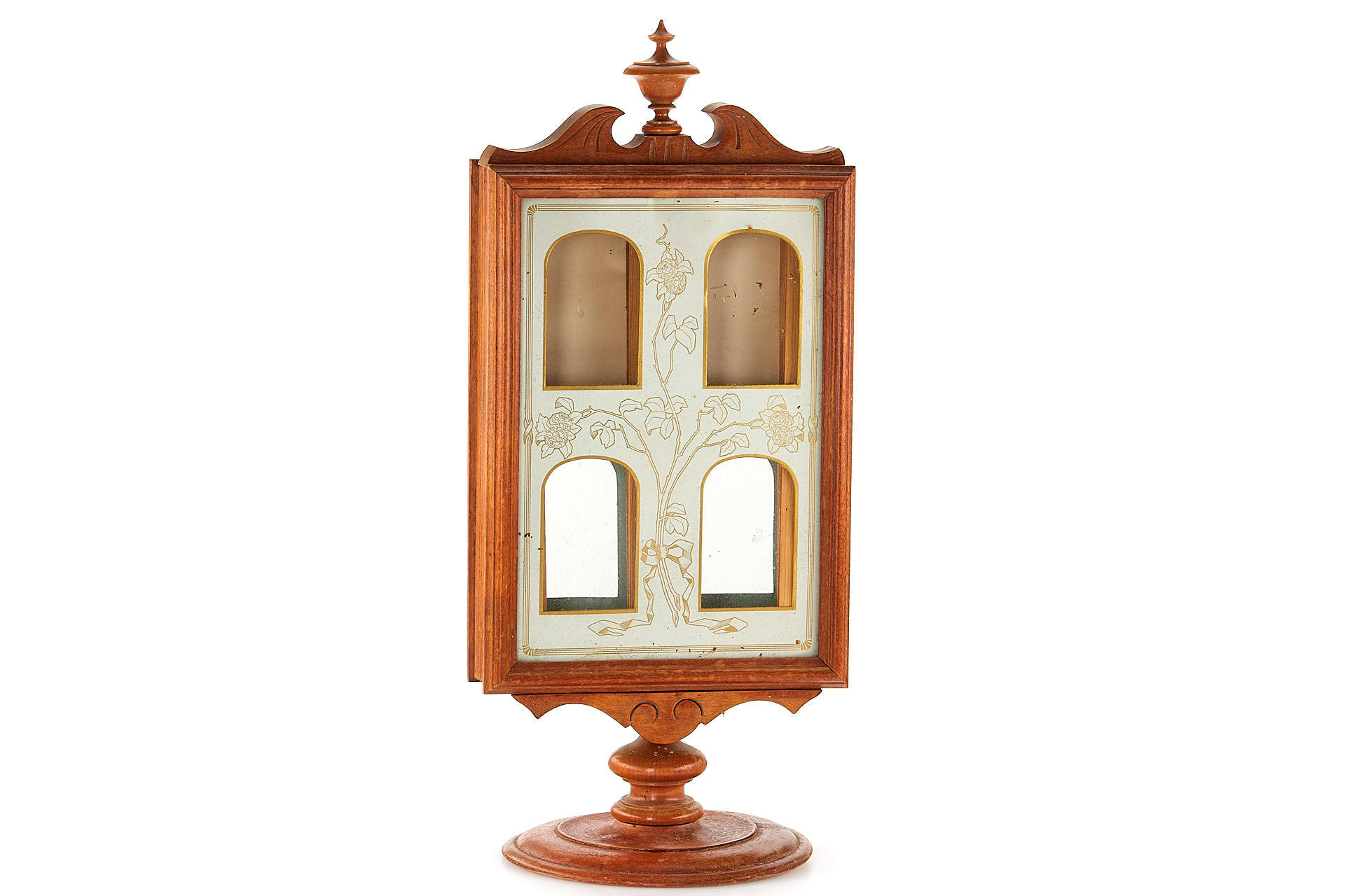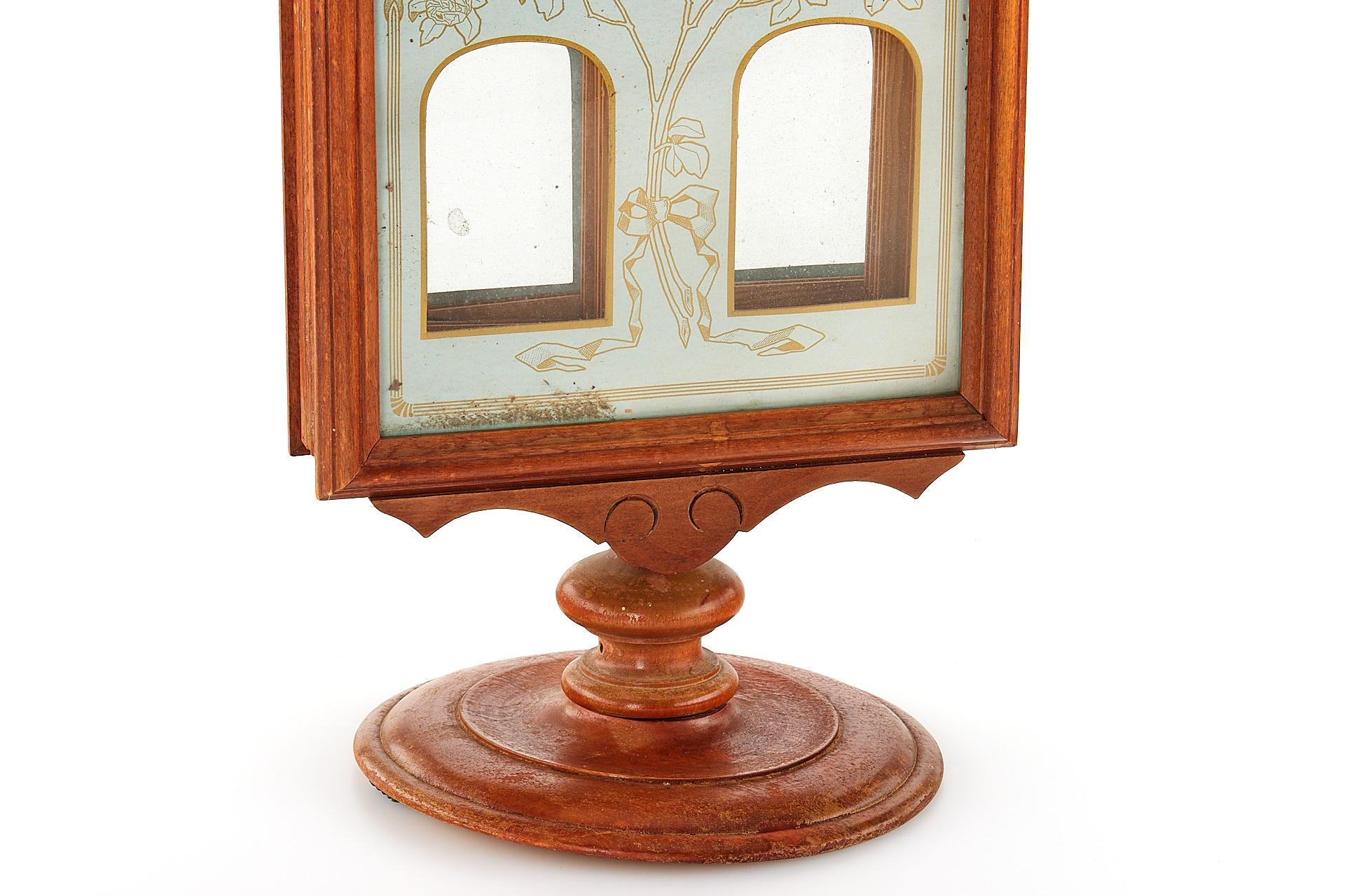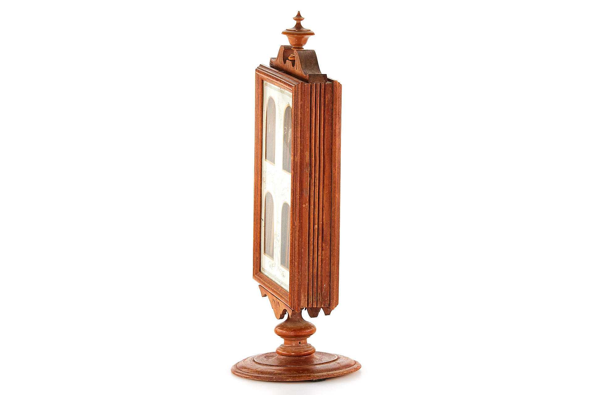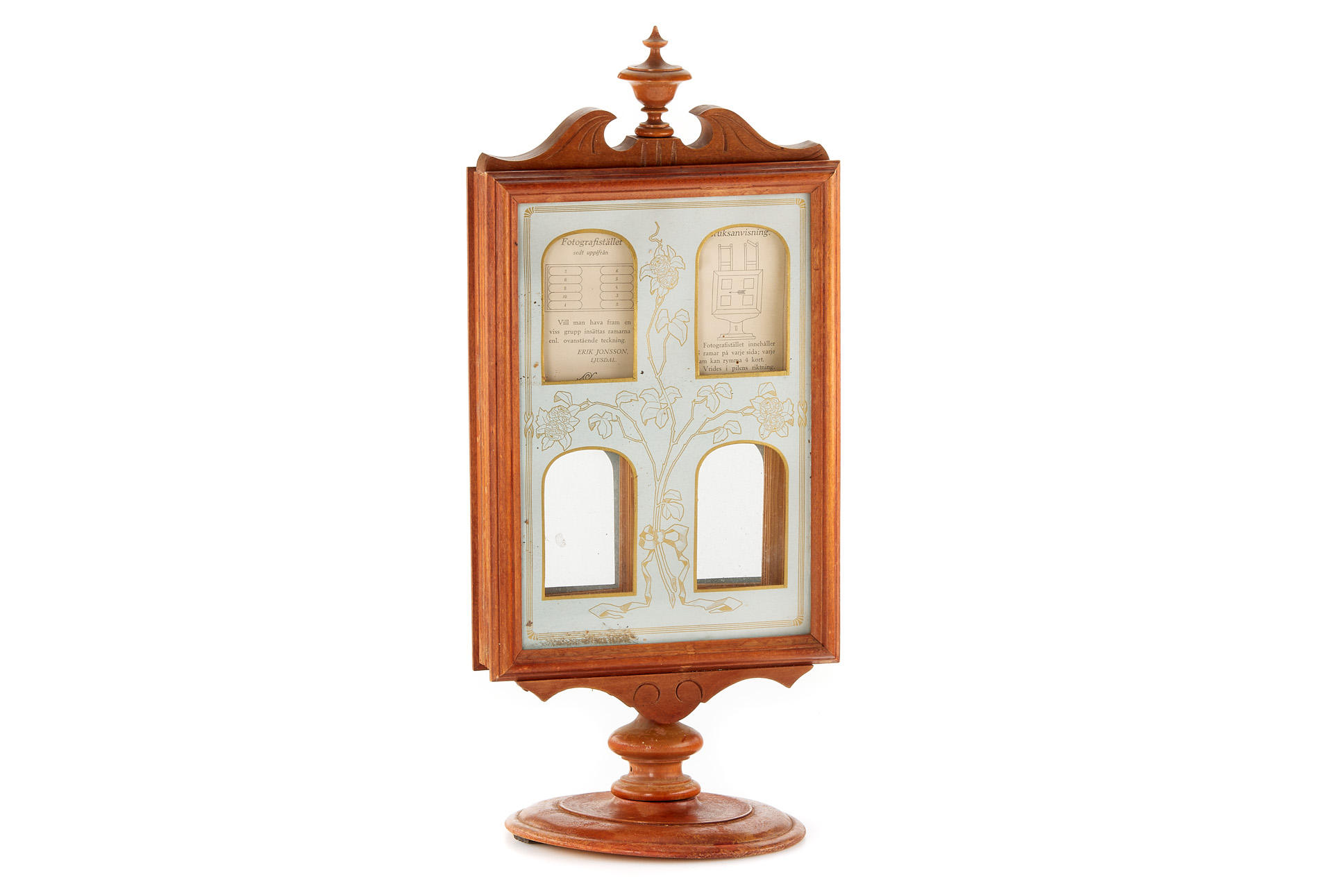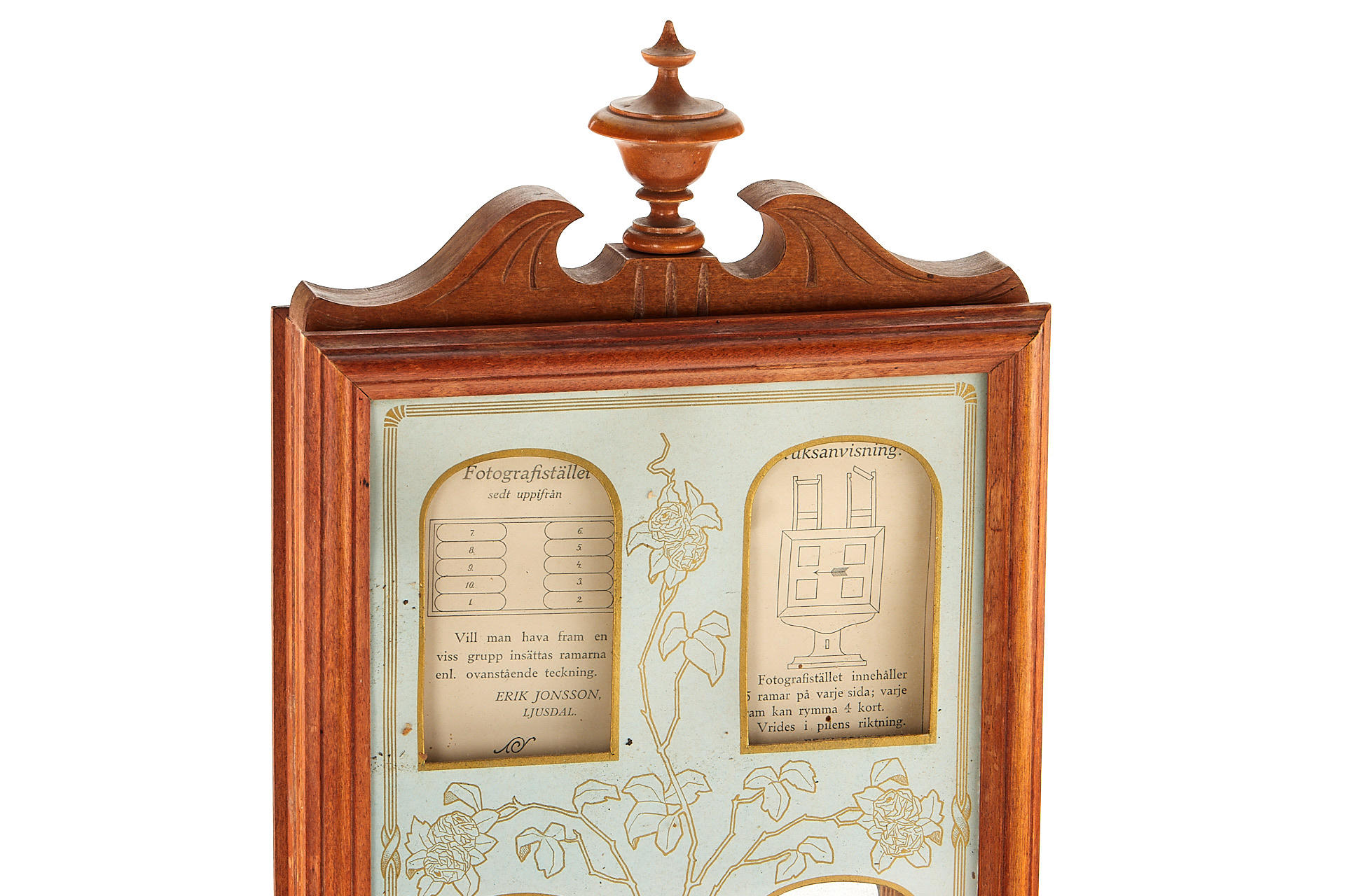 Ingenious mobile frame for 20 pictures 6x9.5cm, made in Sweden in very good and original condition (one wooden frame missing), made of wood with glass, the spring-loaded mechanism is located in the rotating stand foot, with instructions in Swedish (48x21x18cm)