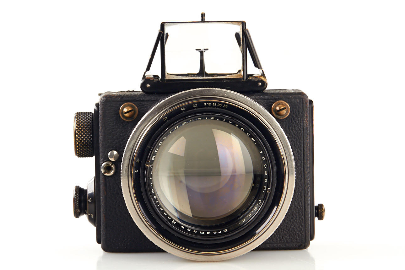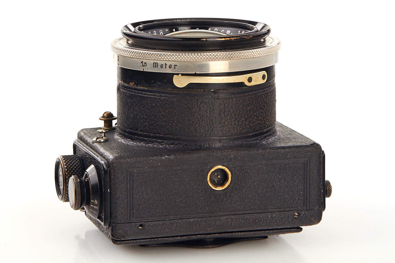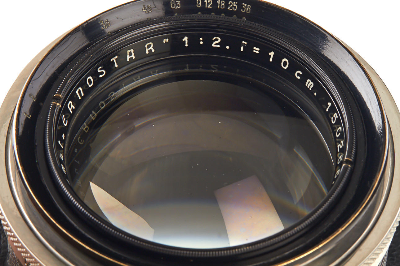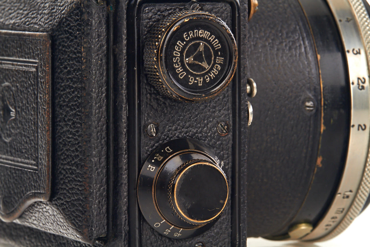 Extremely rare first model Er-Nox (Ernemann - Night) with heavy focusing mount milled from solid brass. While the later Ermanox weights just 1000gr, this camera weights 1600gr. Early Ernostar 2/10cm no.150266 (with very clean lenses), meter scale. In beautiful original condition with ground glass holder