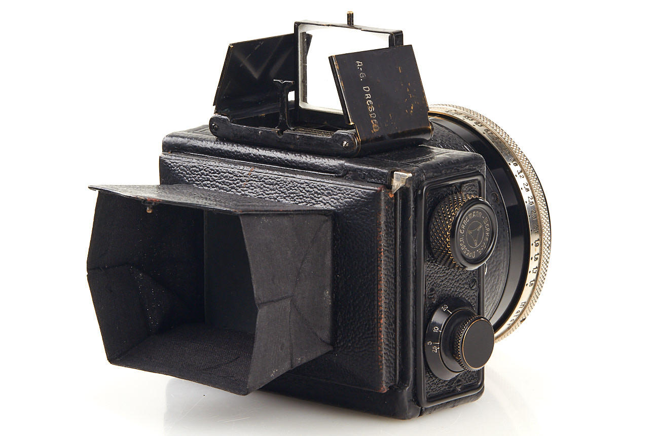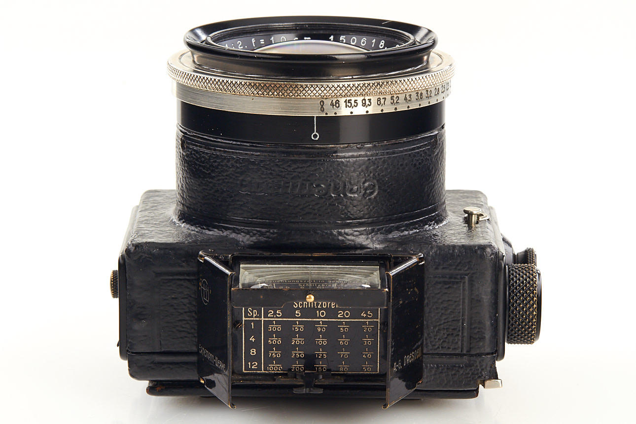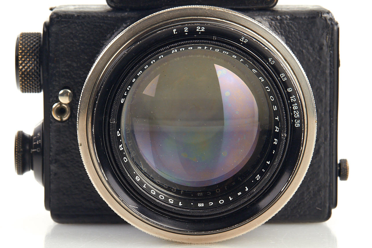 rare and very early first model Er-Nox (Ernemann - Night) with heavy focusing mount milled from solid brass. While the later Ermanox weights just 1000gr, this camera weights 1600gr., with meter engraved scale and German exposure table in the viewfinder, one of the first examples made. With very early Ernostar 2/10cm no.150618 (with clean optics). In very good cosmetic condition. The camera has the most early serial number we have seen.