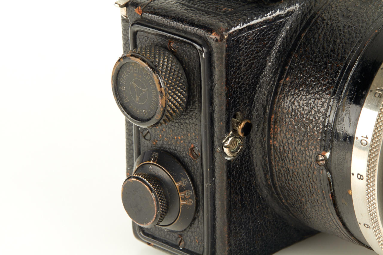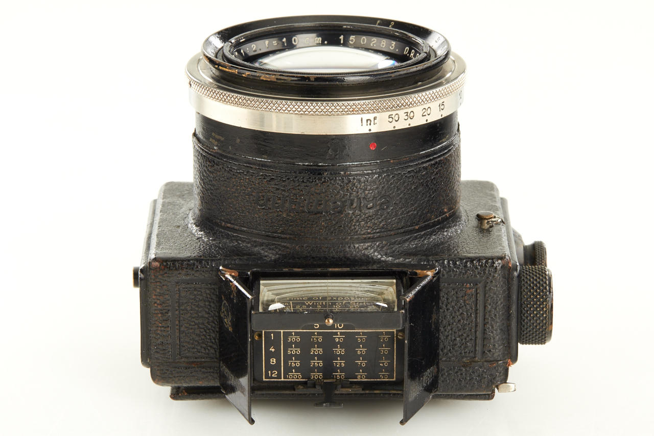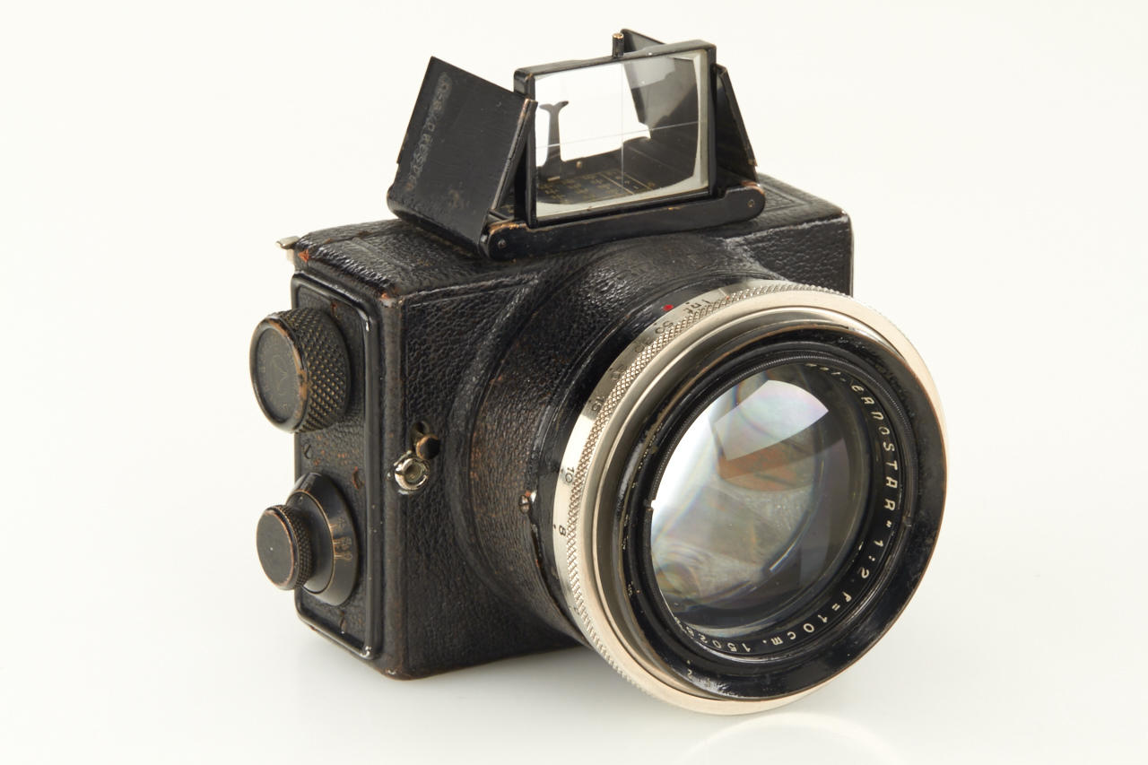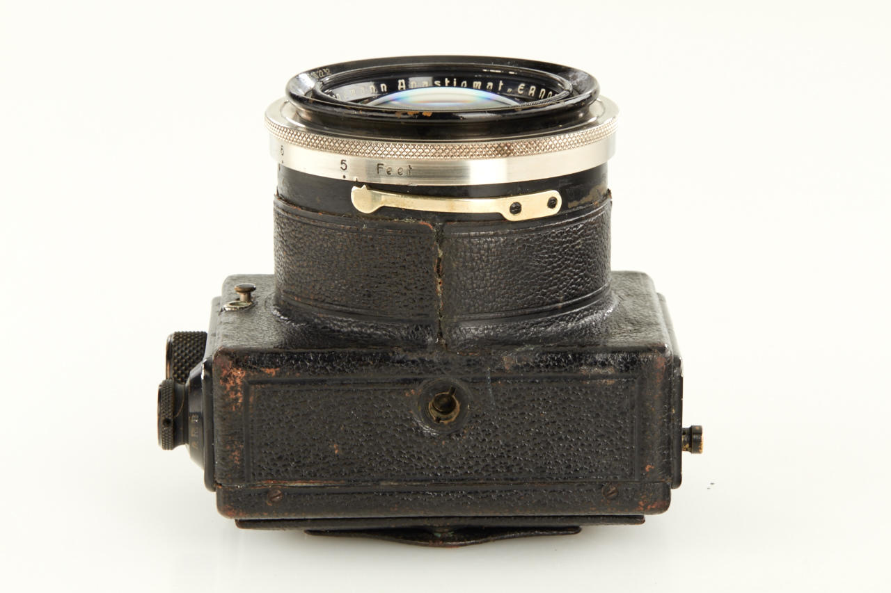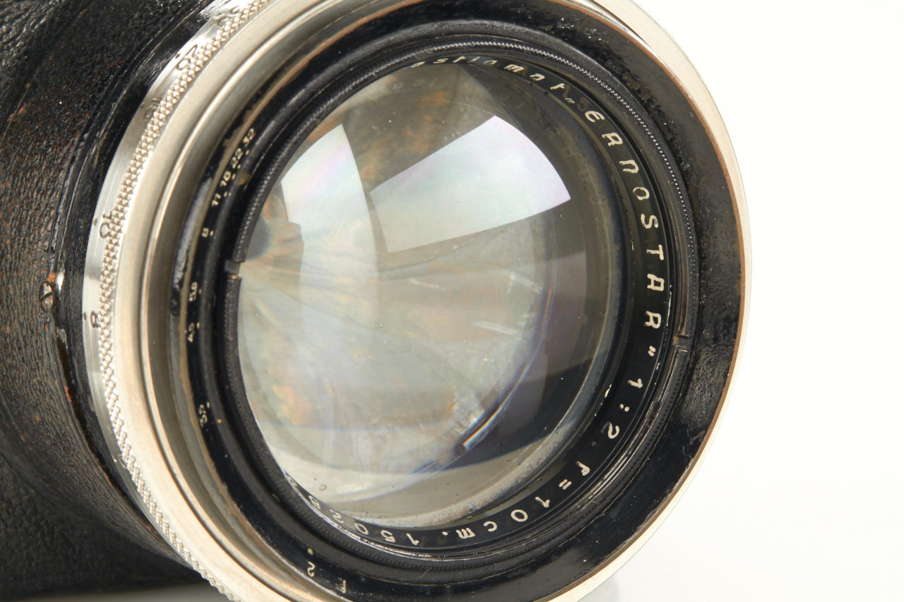 very early Ermanox with fast Ernostar 2/10cm no.150283 in good condition (focal plane shutter needs attention), early heavy mount version with 1600g weight, inclusive roll film back and original Ernemann leather case