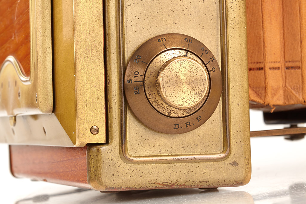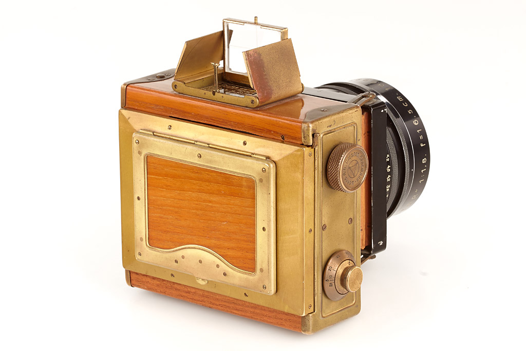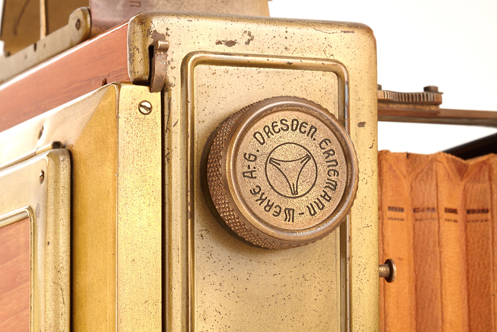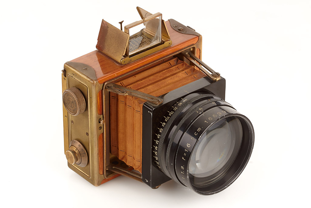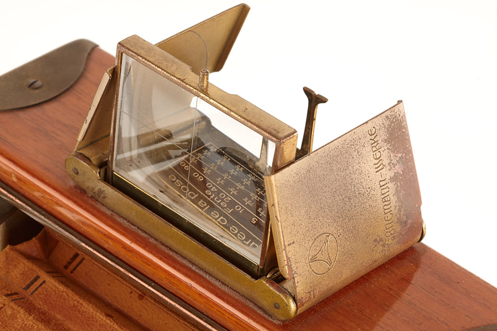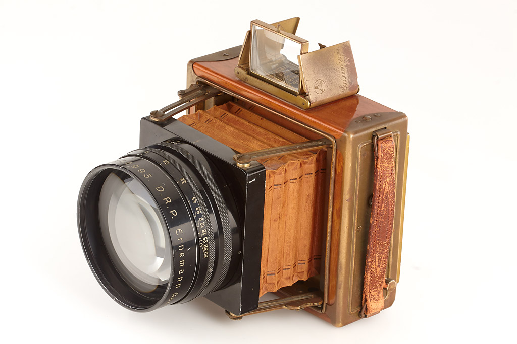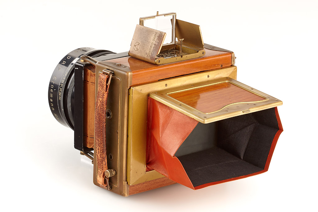 probably unique tropical version of the scarce collapsible bellows model Ermanox 9x12cm with extremely fast Ernostar 1.8/16.5cm no.166993 (clean lenses), in beautiful condition, brown leather bellows, mahogany with brass fittings, working focal plane shutter, strap, lens cap, two matching brass/mahogany double film holders, brass/mahogany filmpack holder