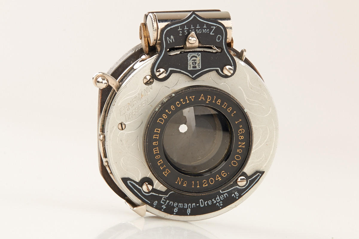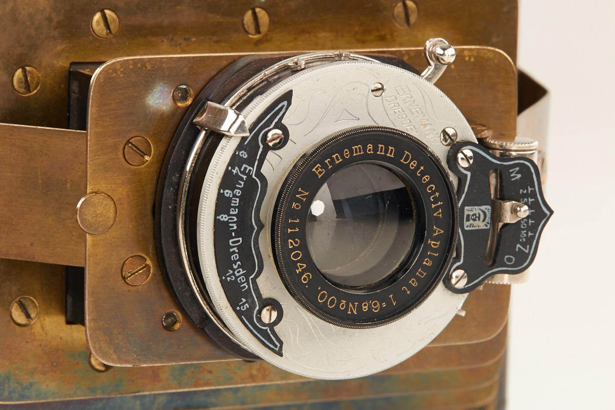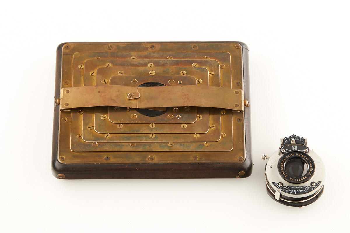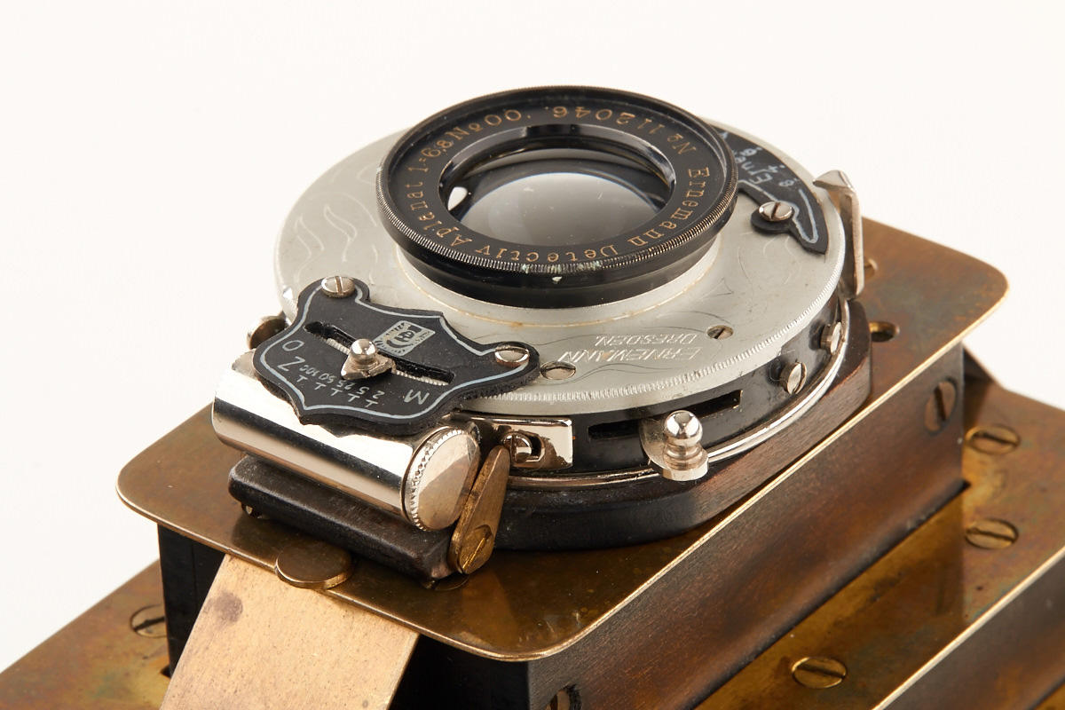 very rare, probably unique flat folding plate camera for 10x13cm plates in beautiful original condition, illustrated in Abring's "Von Daguerre bis Heute" Vol.4 page 185, with Ernemann Detectiv Aplanat no.112046 in Ernemann shutter