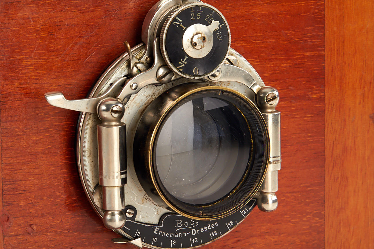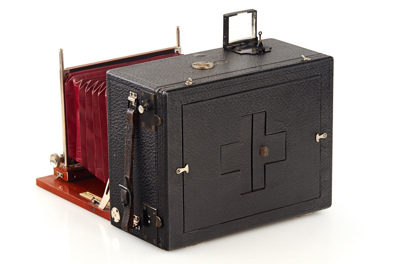 13x18cm, 'Double-Shutter Camera', first version, red bellows, nickel-plated metal parts, black leathered-covered, F=8 Detectiv Aplanat No.2, in very fine condition, rare!