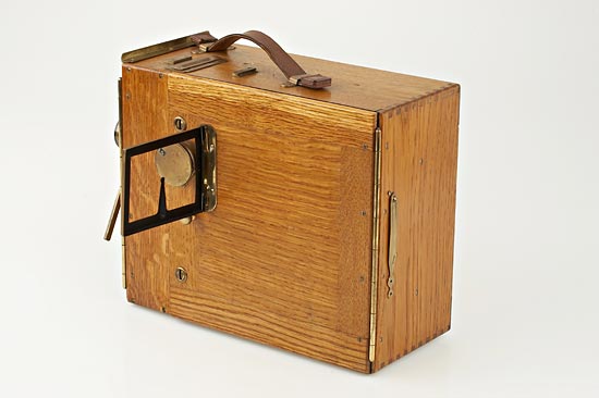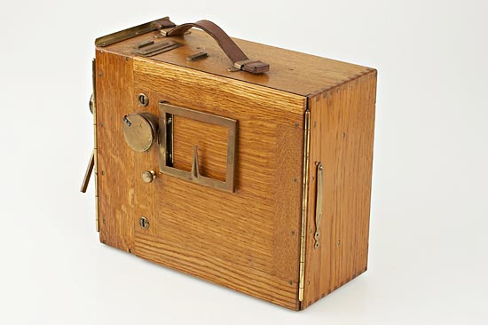 Hand-Cranked 35mm Movie Camera for 100 feet of 35mm film, oak wood body with brass fittings, Ernon 3.5/5cm lens no.160406, through-the-lens focusing eyepiece and sports finder at side, with two film spools. A very attractive camera in excellent condition. See ERNEMANN CAMERAS by Peter Göllner, page 246