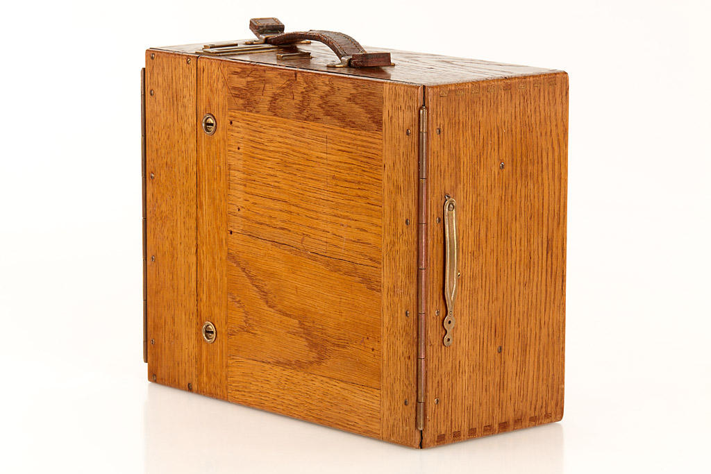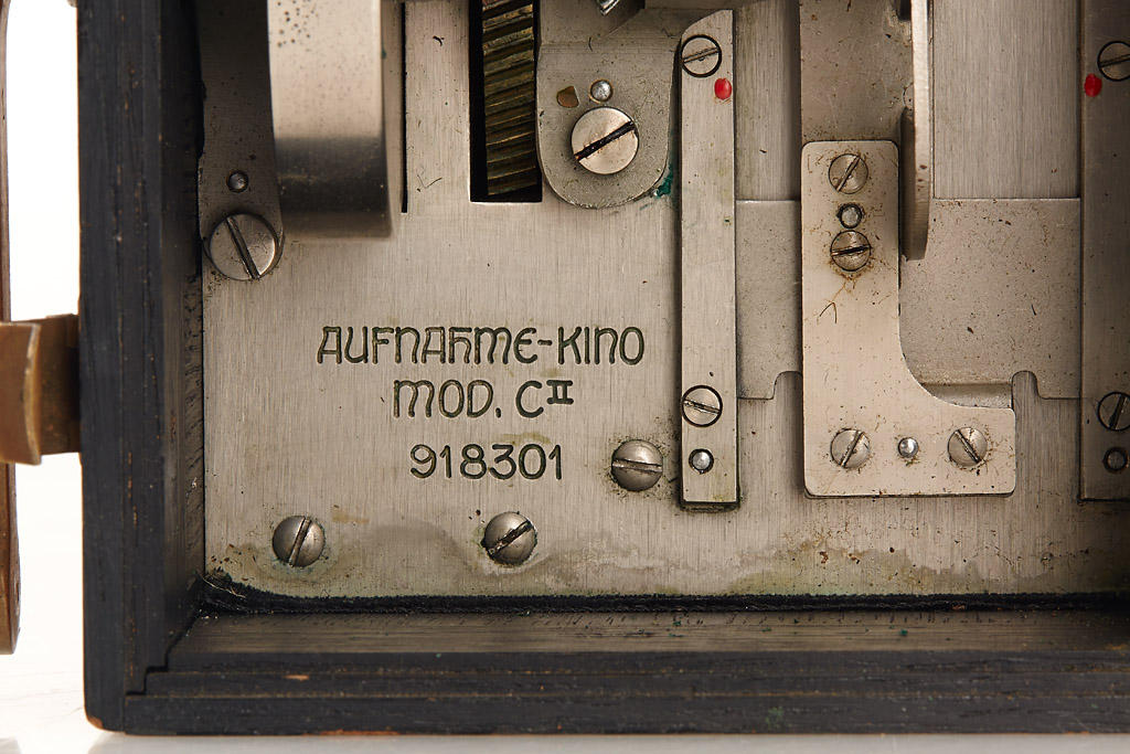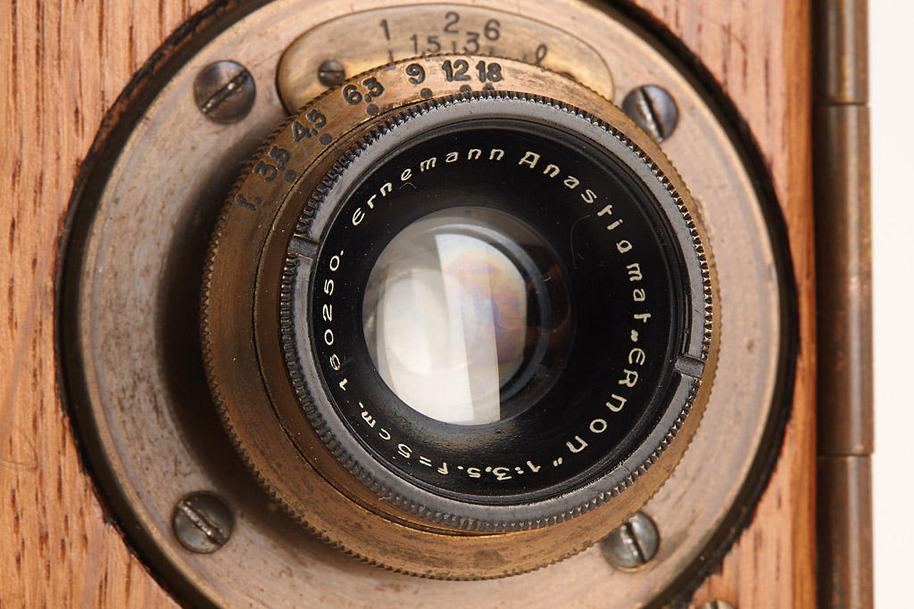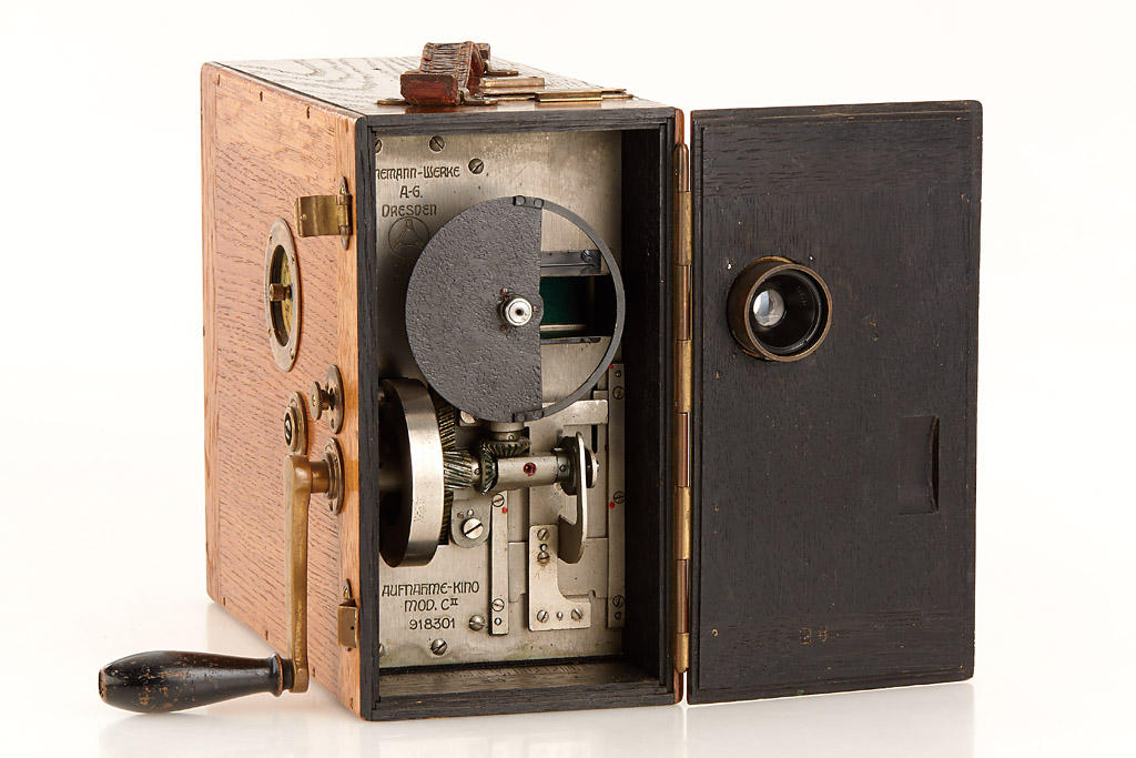 Hand-cranked 35mm movie camera for 100 feet of film, oak wood body with brass fittings, Ernon 3.5/5cm lens no.160250, with two film spools. A very attractive camera in excellent condition. See ERNEMANN CAMERAS by Peter Göllner, page 246