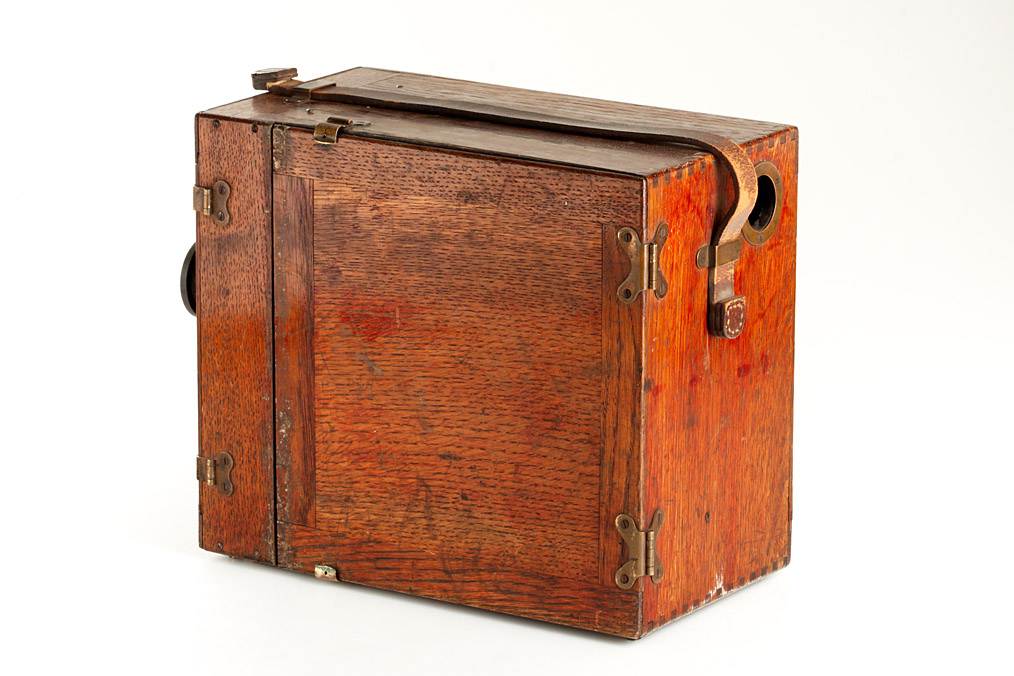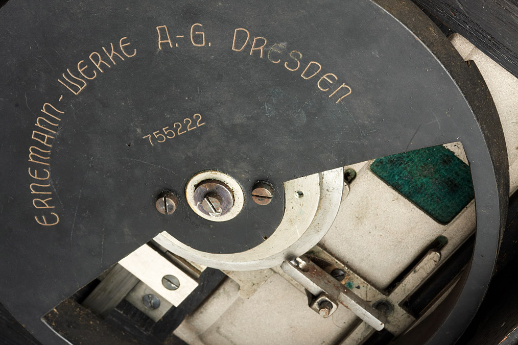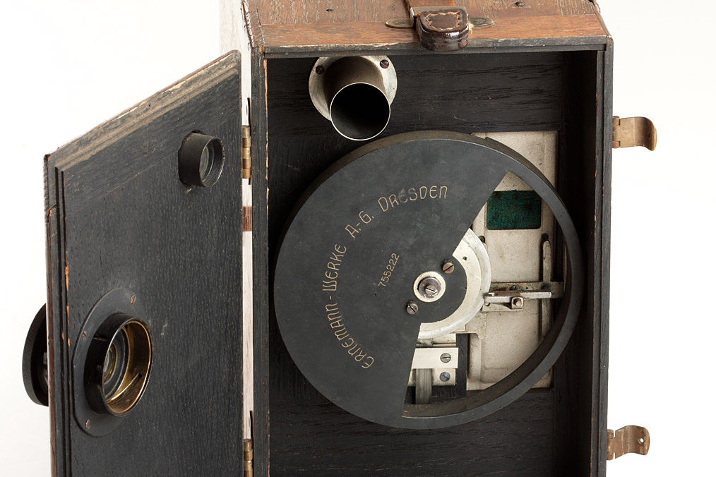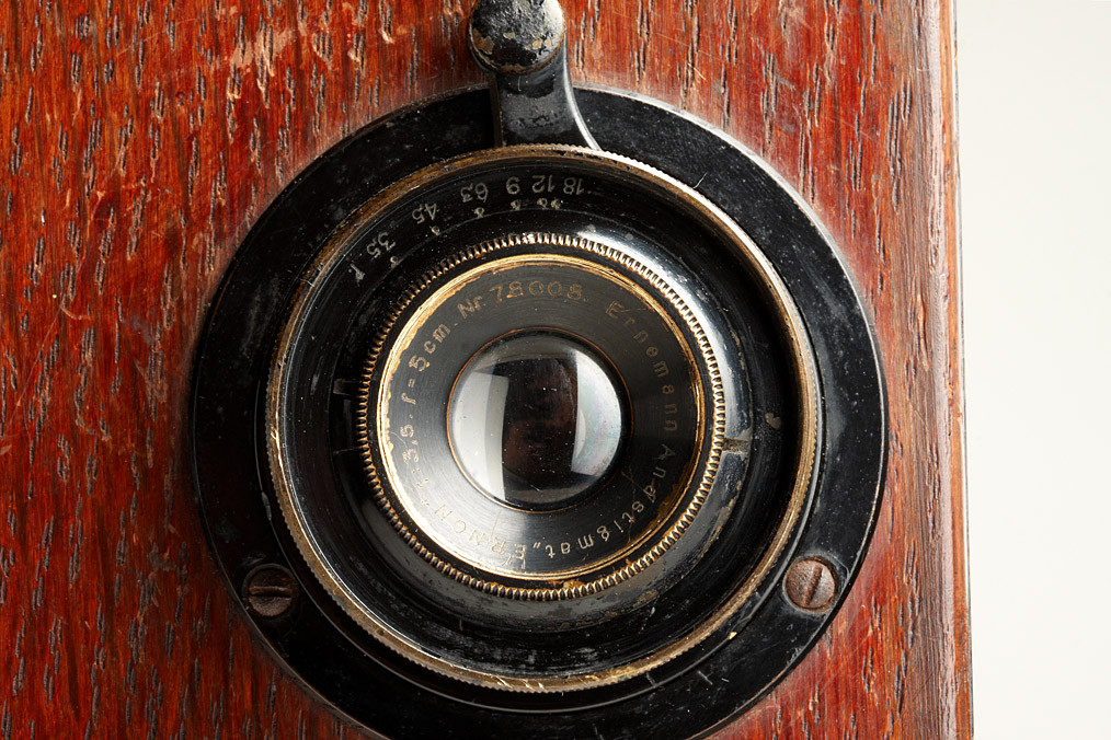 hand-cranked 35mm movie camera for 100 feet of 35mm film, oak wood body with brass fittings, Ernon 3.5/5cm lens no.78008, rare camera in original condition