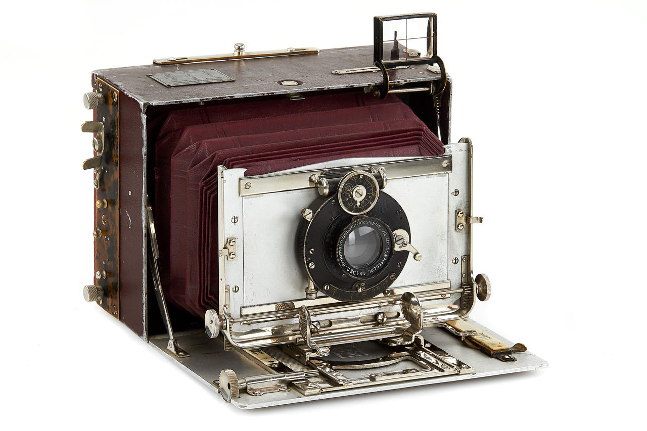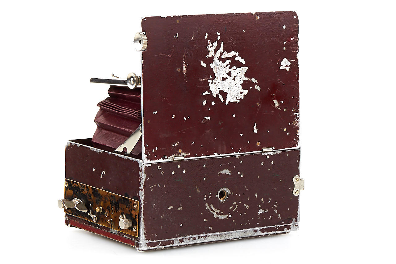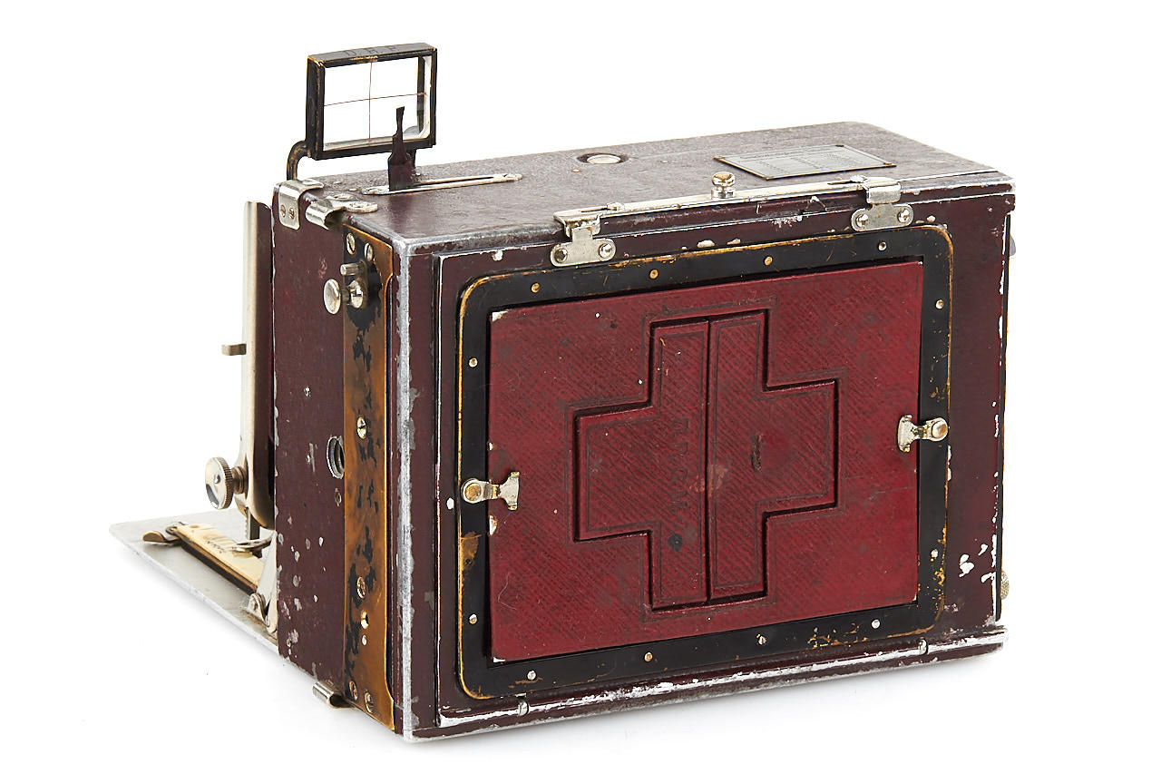 very rare early version Tropen Heag VI with red-painted aluminium housing, brown bellows, in fine original condition, some engravings removed from the folding bed, with Ernemann Uilar 6.8/13.5cm no.141352, original back