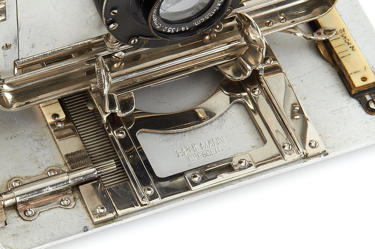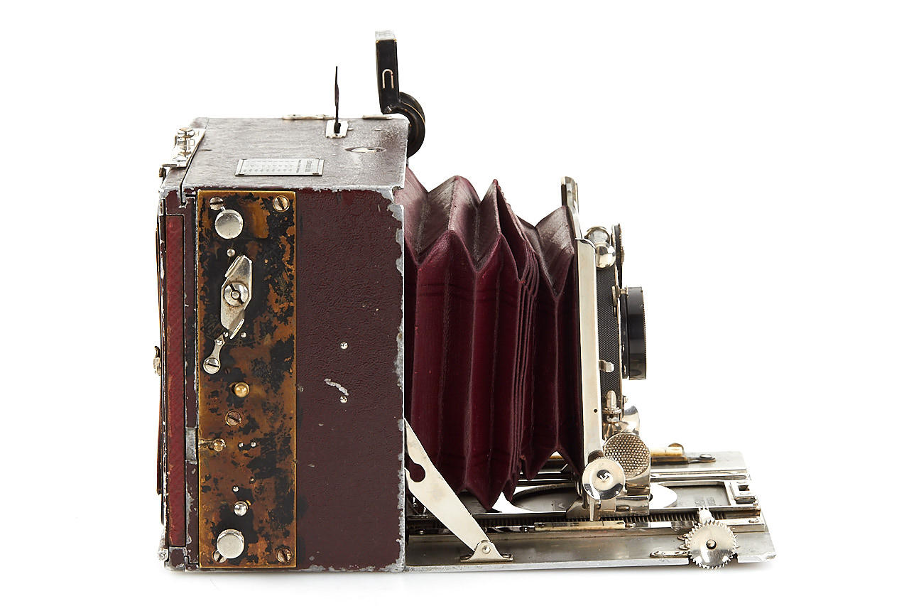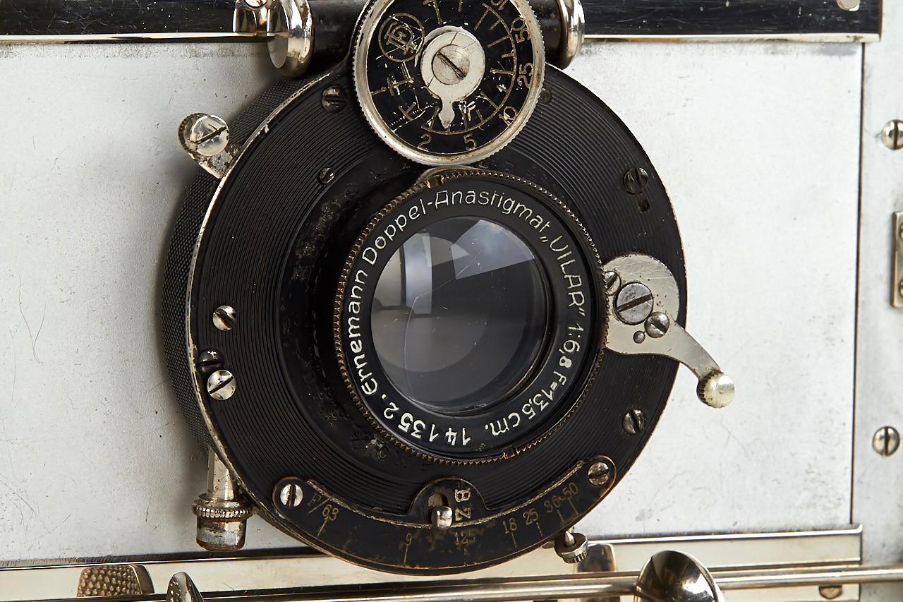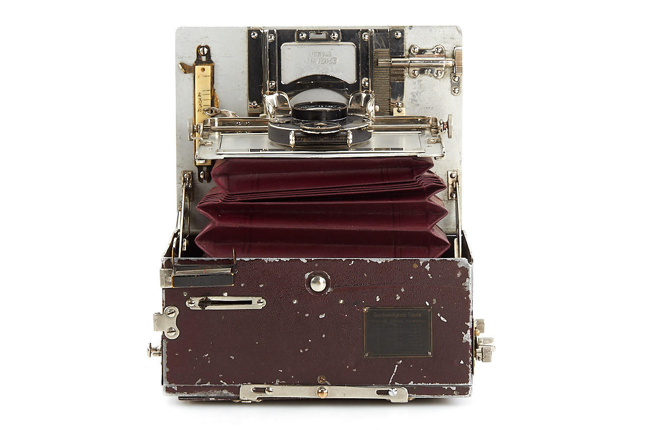 very rare early version Tropen Heag VI with red-painted aluminium housing, brown bellows, in fine original condition, some engravings removed from the folding bed, with Ernemann Uilar 6.8/13.5cm no.141352, original back