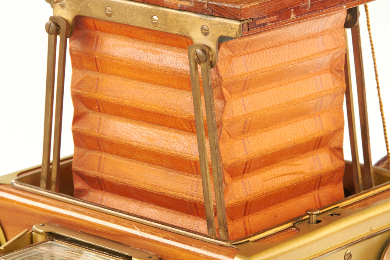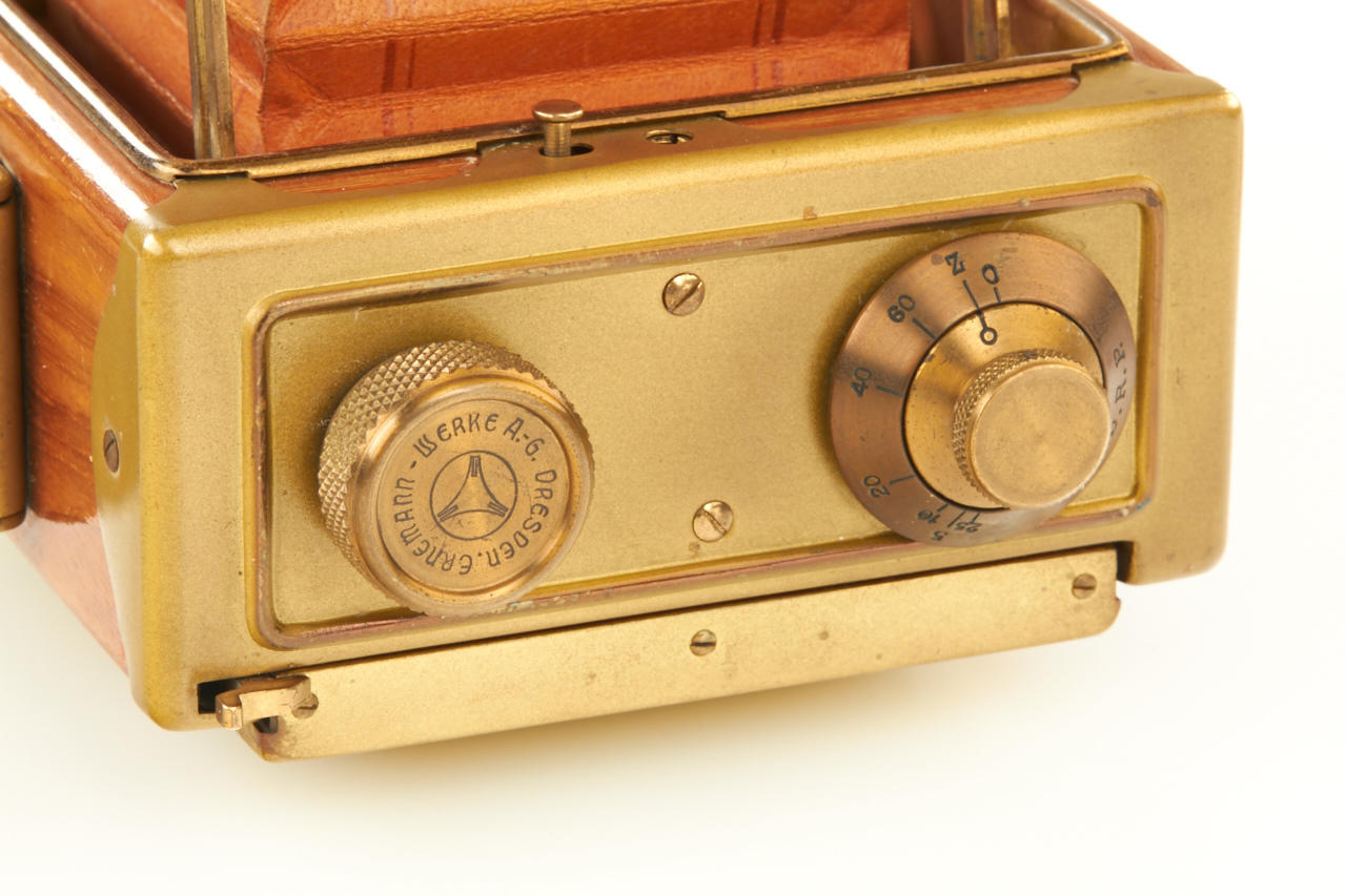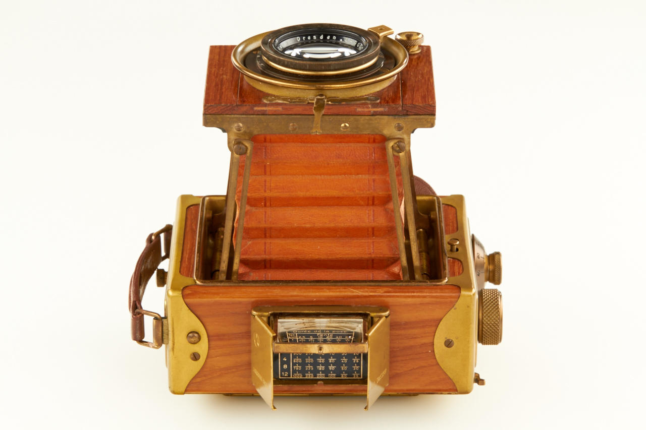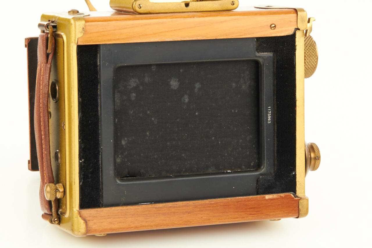 6.5x9cm, rare Tropen Klapp (later style) in beautiful original condition, polished-teak body with lacquered brass trim, original brown bellows, Ernon 3.5/12cm no.147324 (original cap), focal plane shutter needs attention