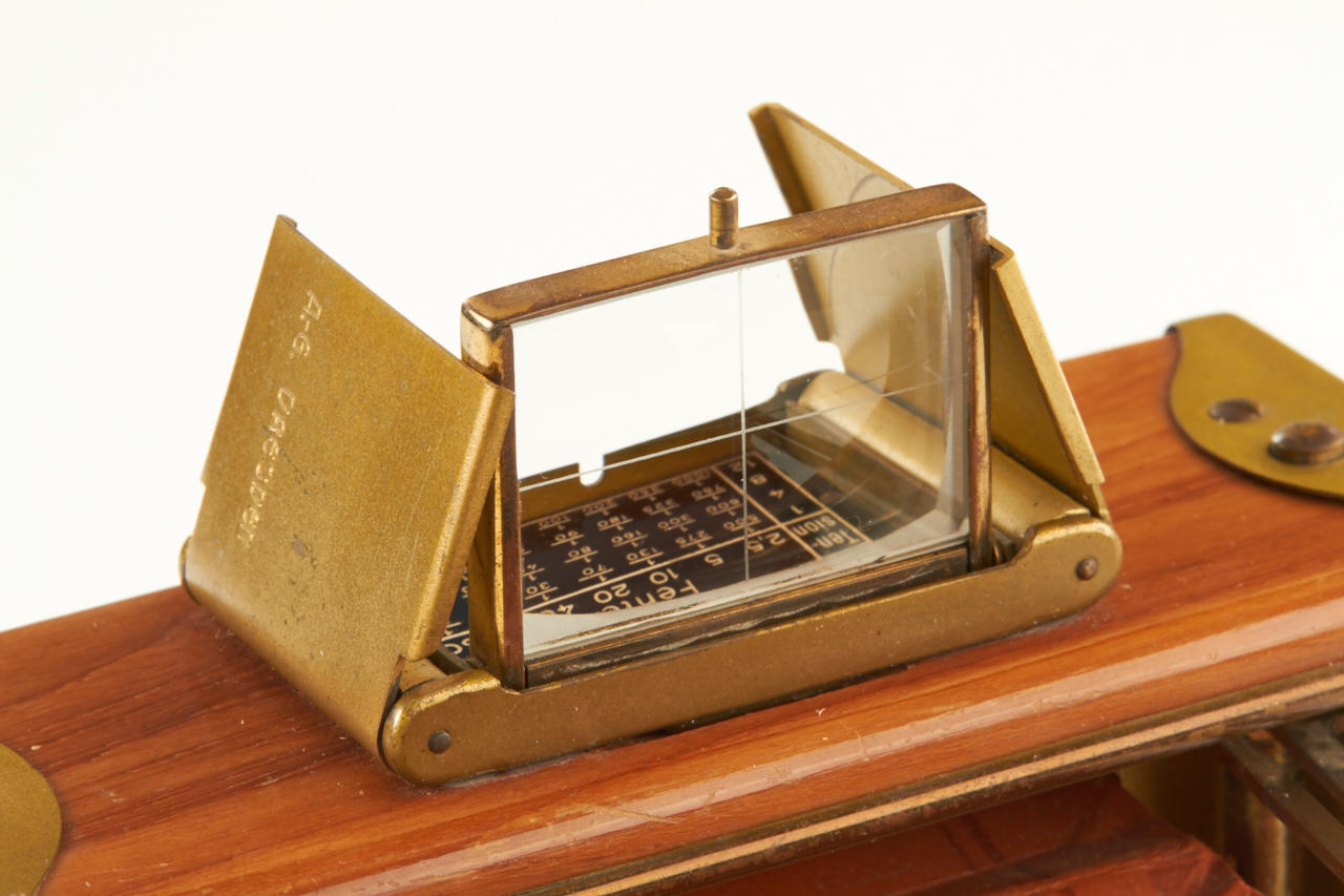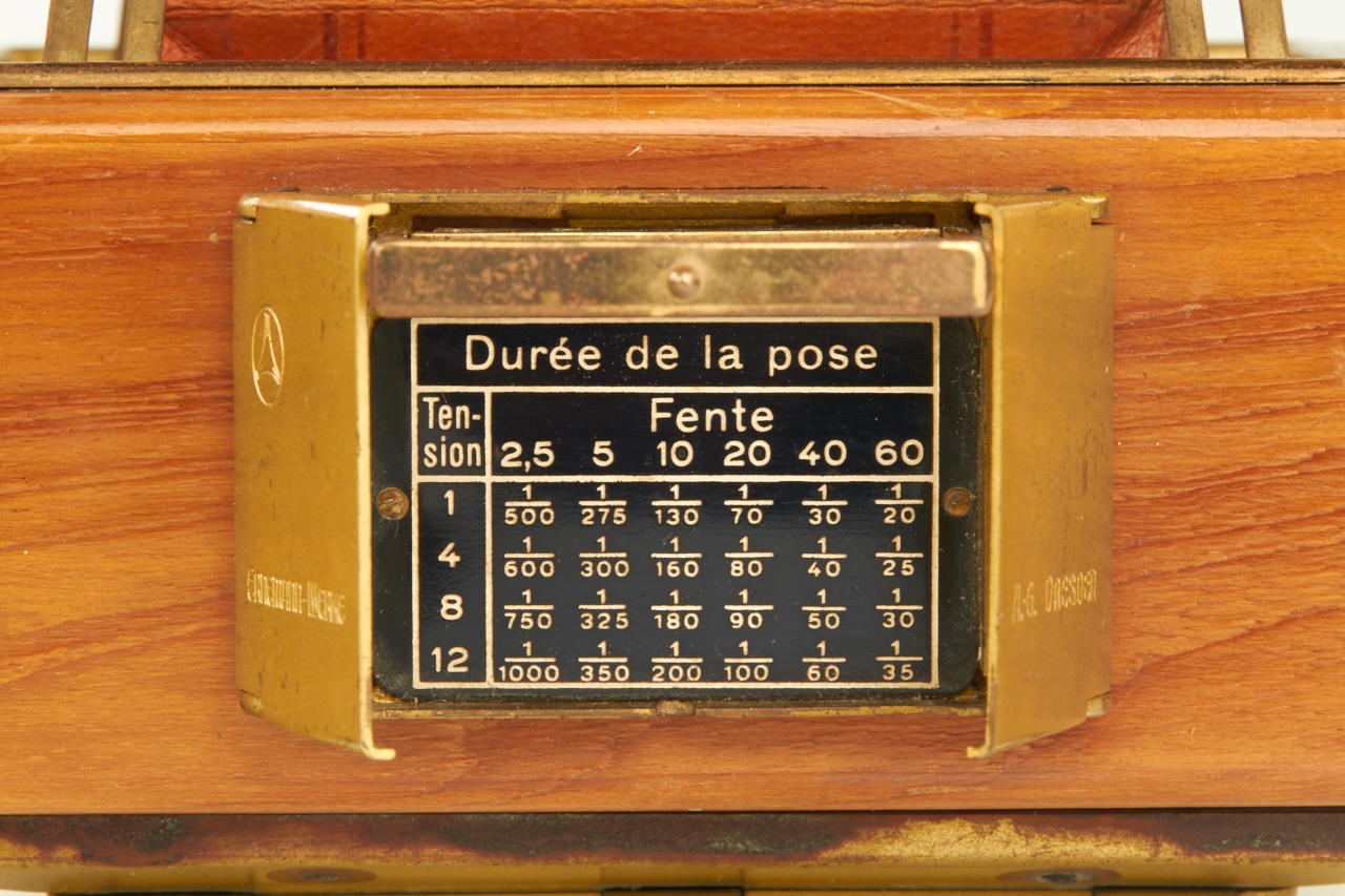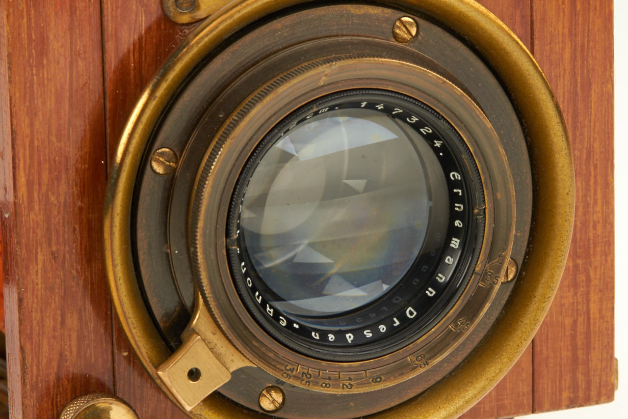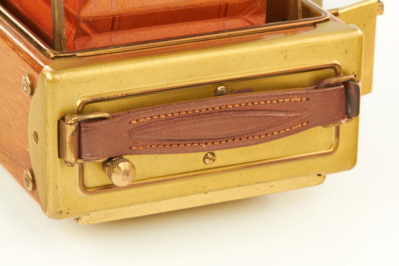 6.5x9cm, rare Tropen Klapp (later style) in beautiful original condition, polished-teak body with lacquered brass trim, original brown bellows, Ernon 3.5/12cm no.147324 (original cap), focal plane shutter needs attention