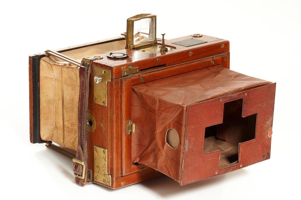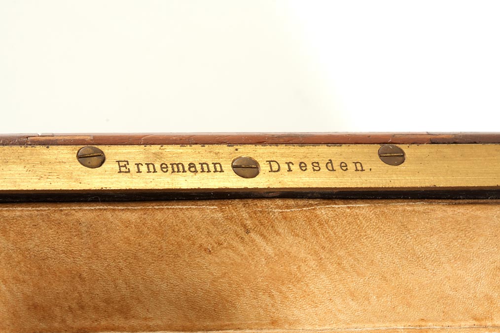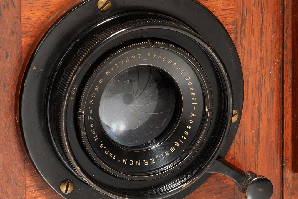 10x15cm, teak body, Ernemann no.1a 6.8/150mm no.19297, focal-plane shutter needs repair, tan leather bellows and matching focusing screen adapter
