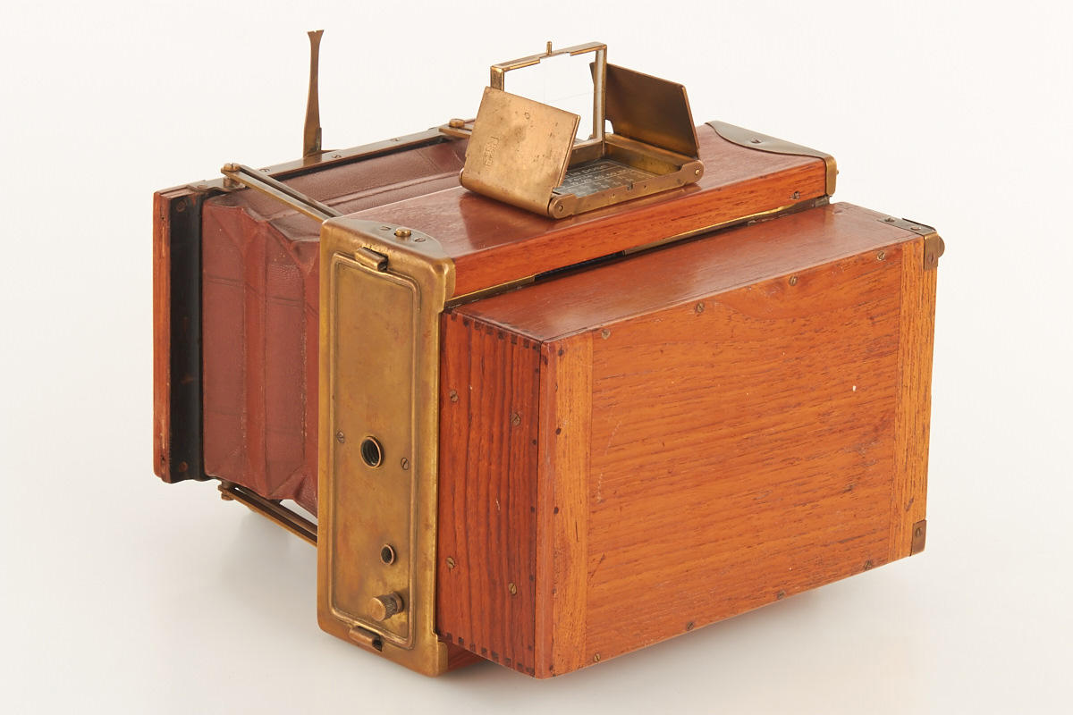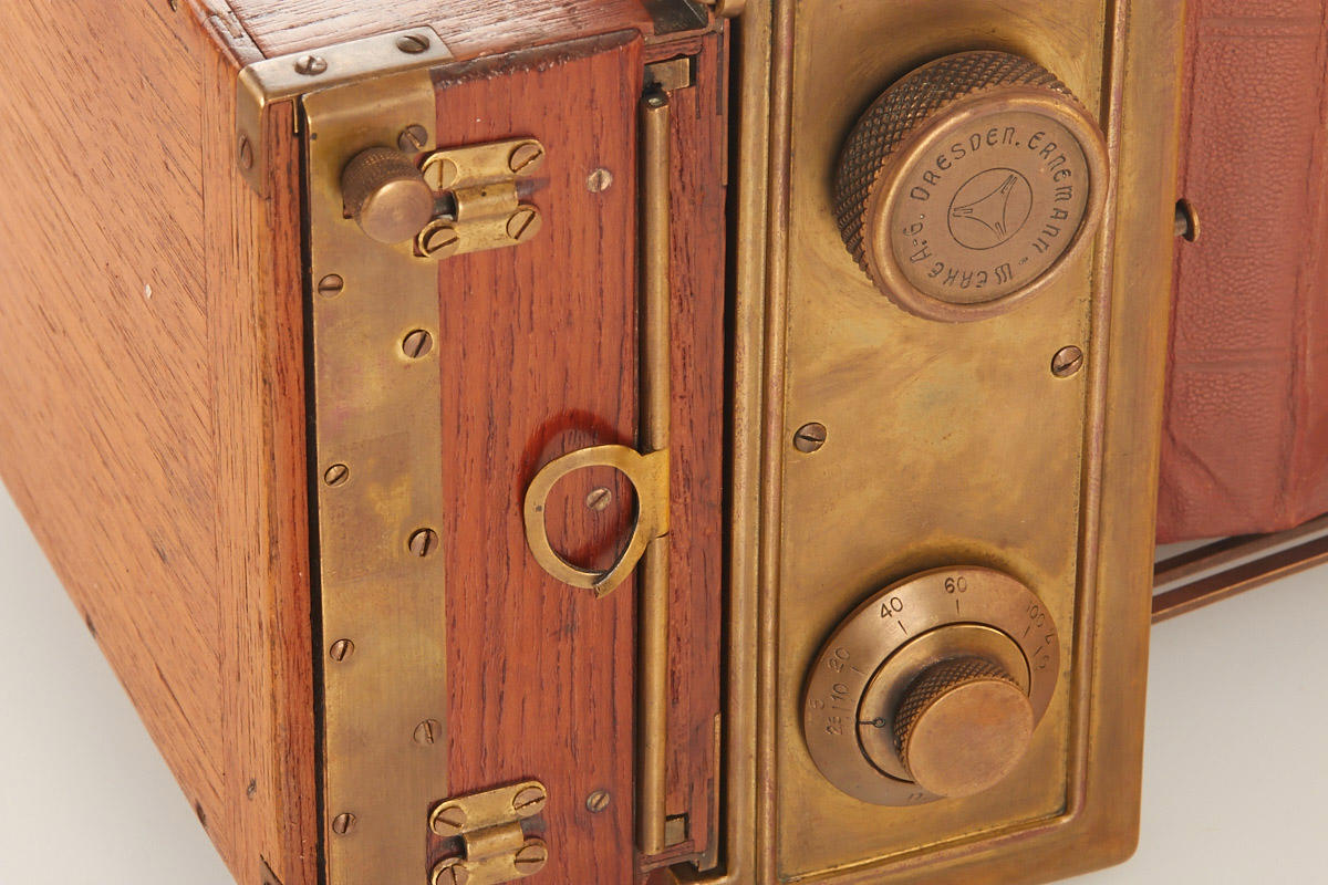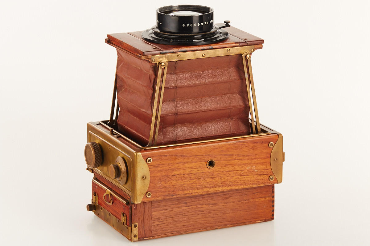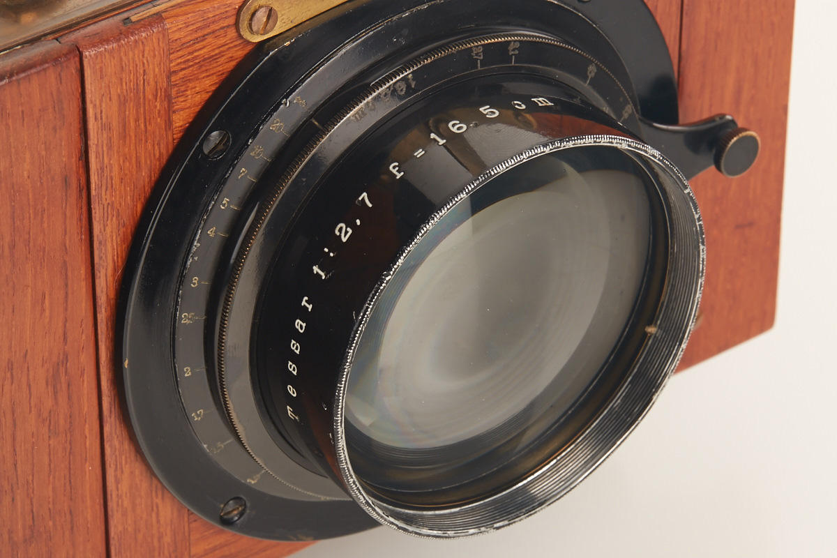 10x15cm, last version of Tropen Klapp, teak body, Tessar 2.7/16.5cm no.648089, working focal plane shutter, brown leather bellows and matching magazine back