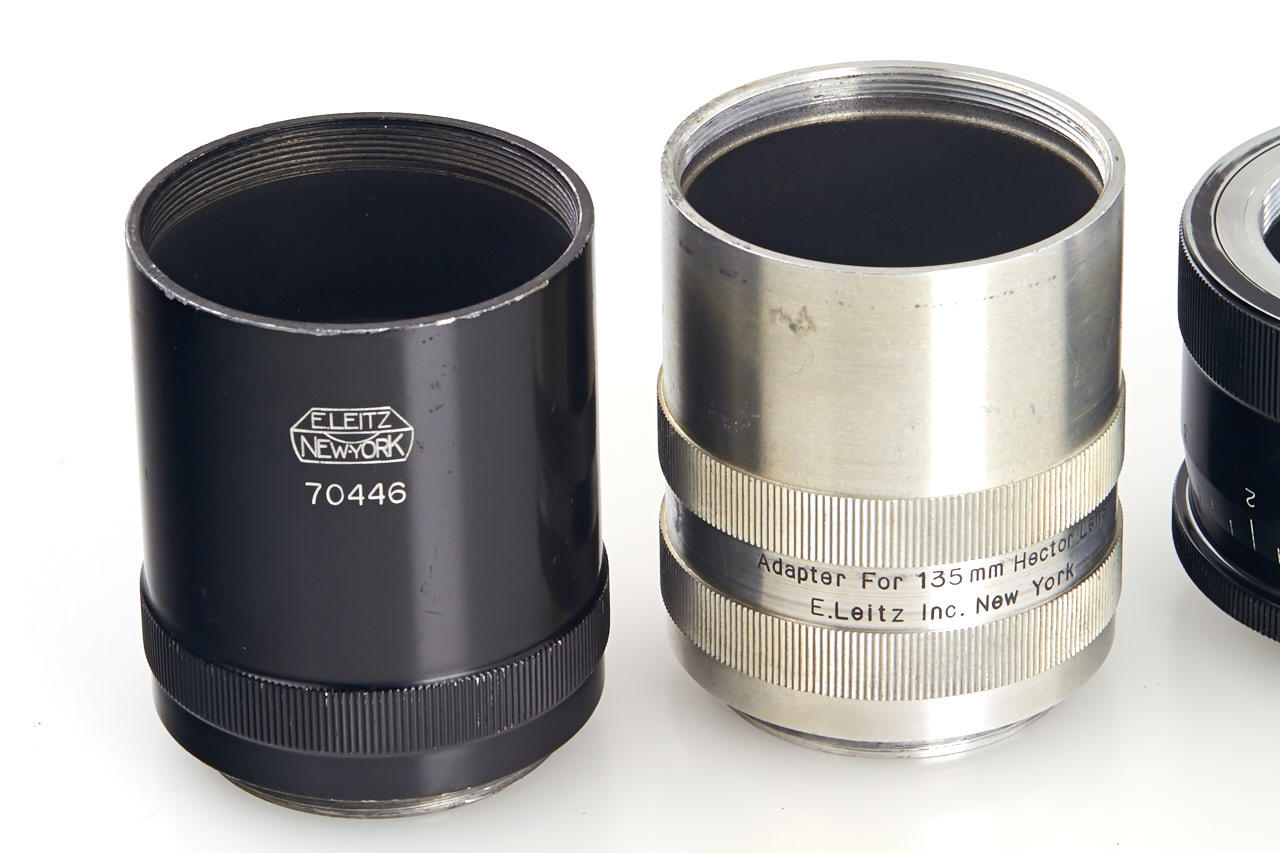 interesting lot of some rare pre-war NY accessories: (1) FULDY focusing stage c.1938, (2) COOMI mircometer extension tube in black, (3 + 4) adapters 70443 + COONY, (5) COOMI mircometer extension tube with adapter COONY, (6) COOHO adapter for 135mm 'Hector' in chrome, (7) COOHO adapter 70446 in black, (8) SELSY flash base plate (for Leica IIIa no.299760), (9) CINLE C-X adapter for Leica lenses on cine cameras with C-mount - for all these accessories see Lager III, pg. 142-146