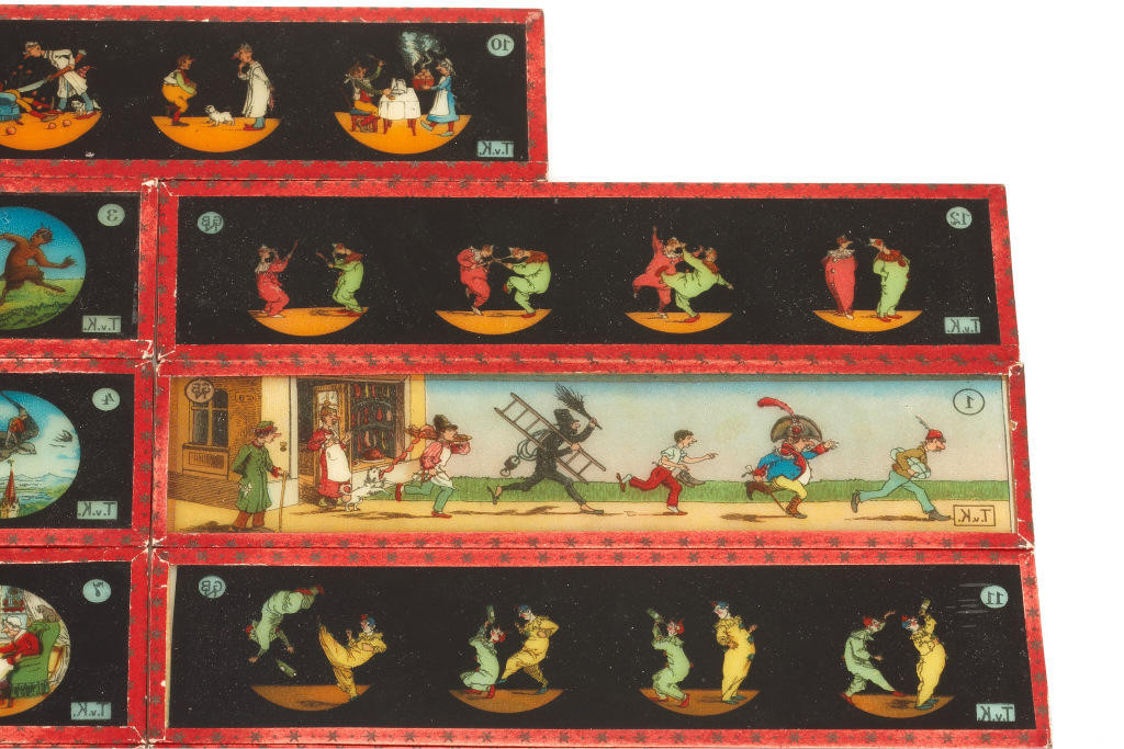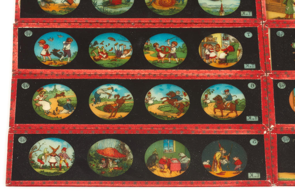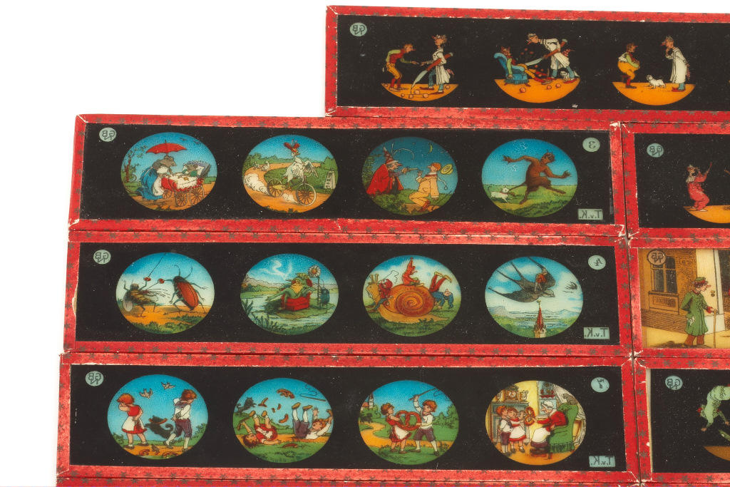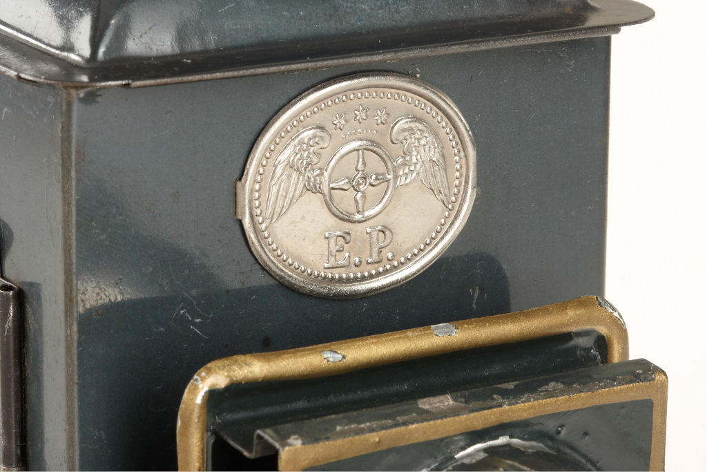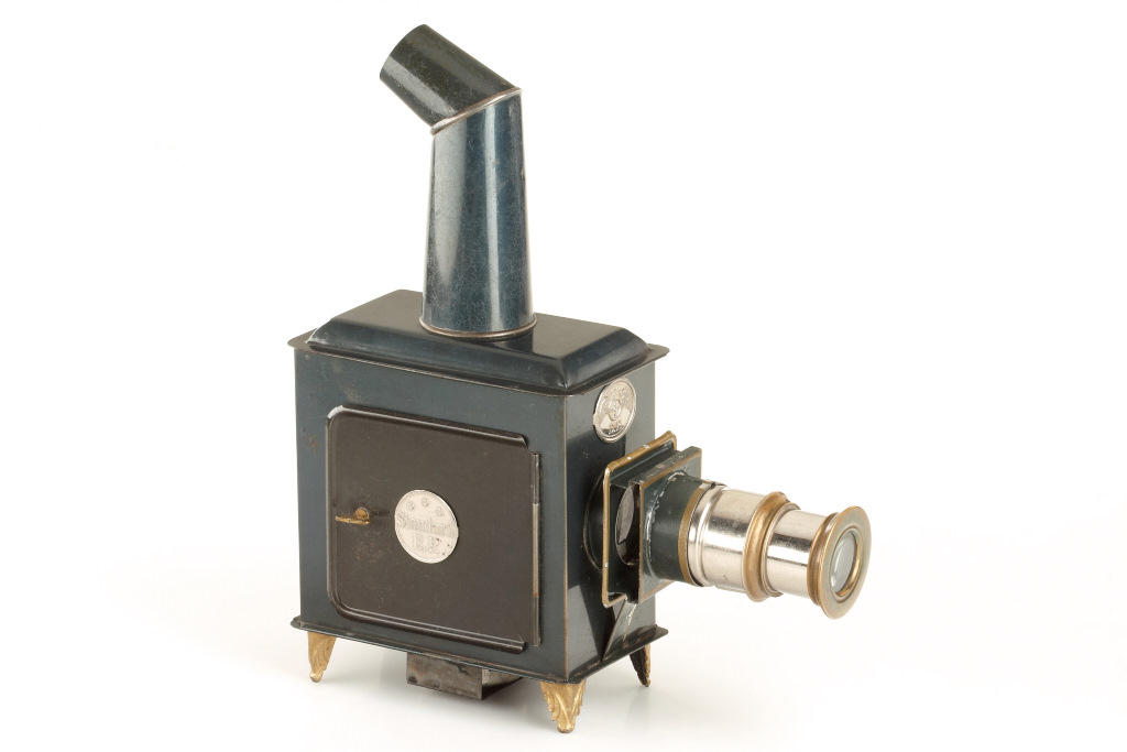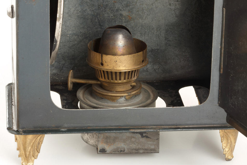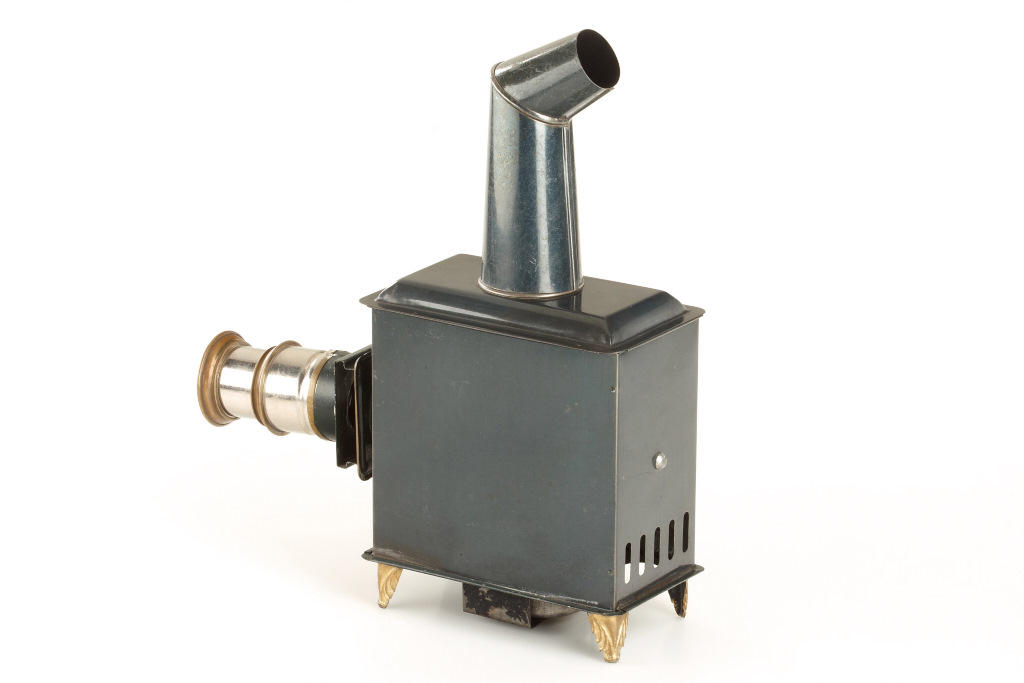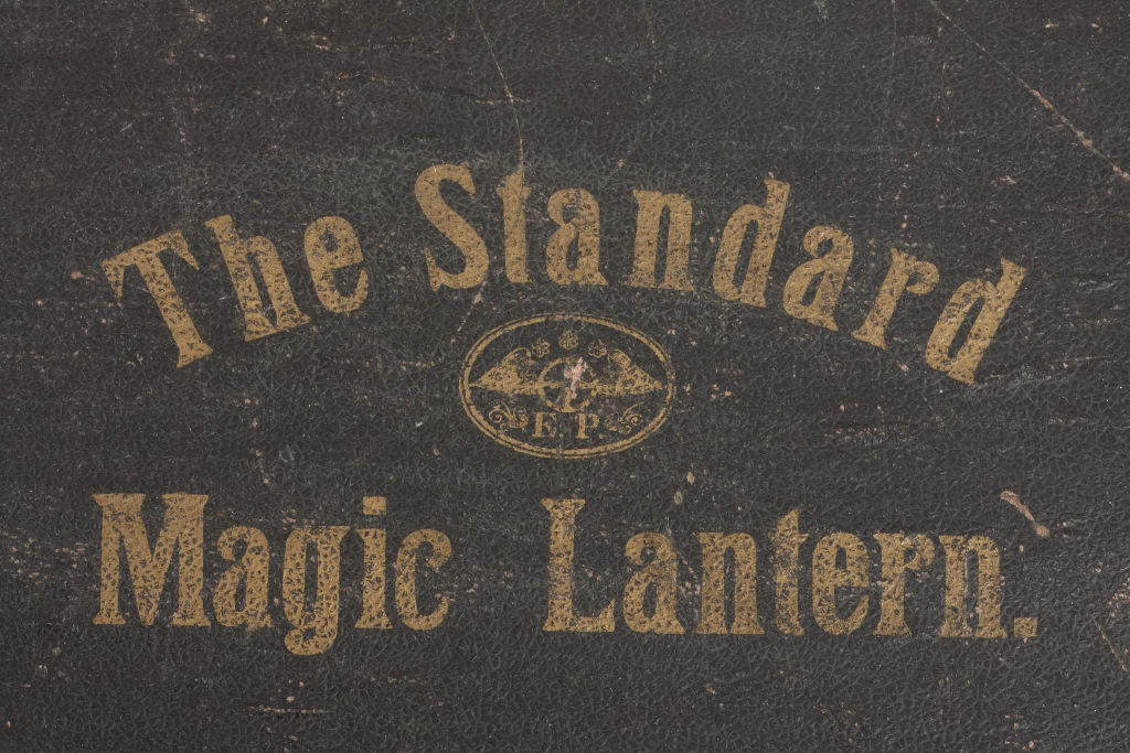complete 'Standard' set for the English speaking market, the lantern with 'Russian Iron' finish, gold plated 'paws', makers label on he left door and on the front, with the original lens, chimney and petrol burner, the fitted box is covered with black faux leather, inside a set of slides and a colourful advert depicting a laterna Magica show. Height 28cm. The Lantern and the box are in good original condition, a very nice and authentic set.