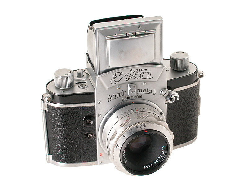 Gravur auf der Frontplatte : Rheinmetall Sommerda, Tessar 2,8/50mm Nr. 3954871, Ihagee vergab an Rheinmetall die Lizenz um 1954/55 Exa Kameras zu produzieren.