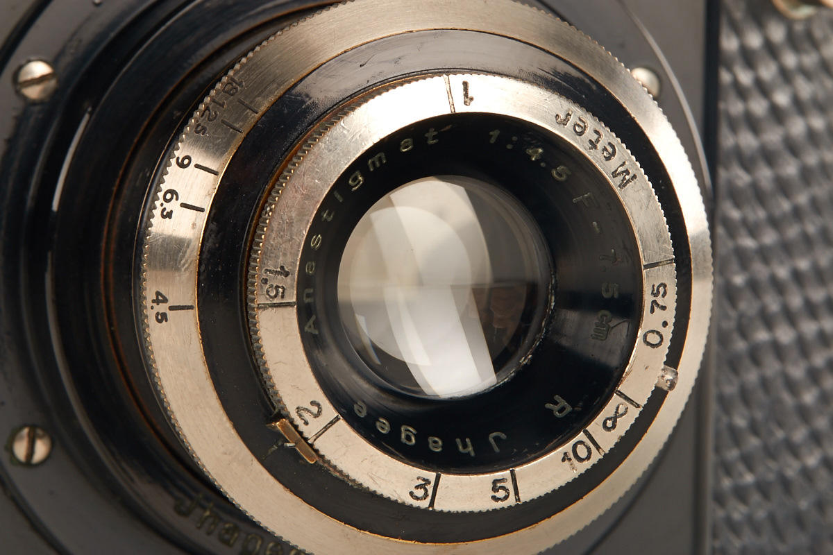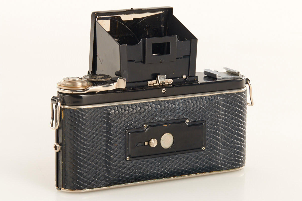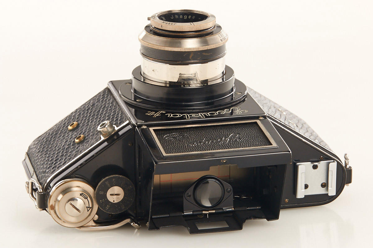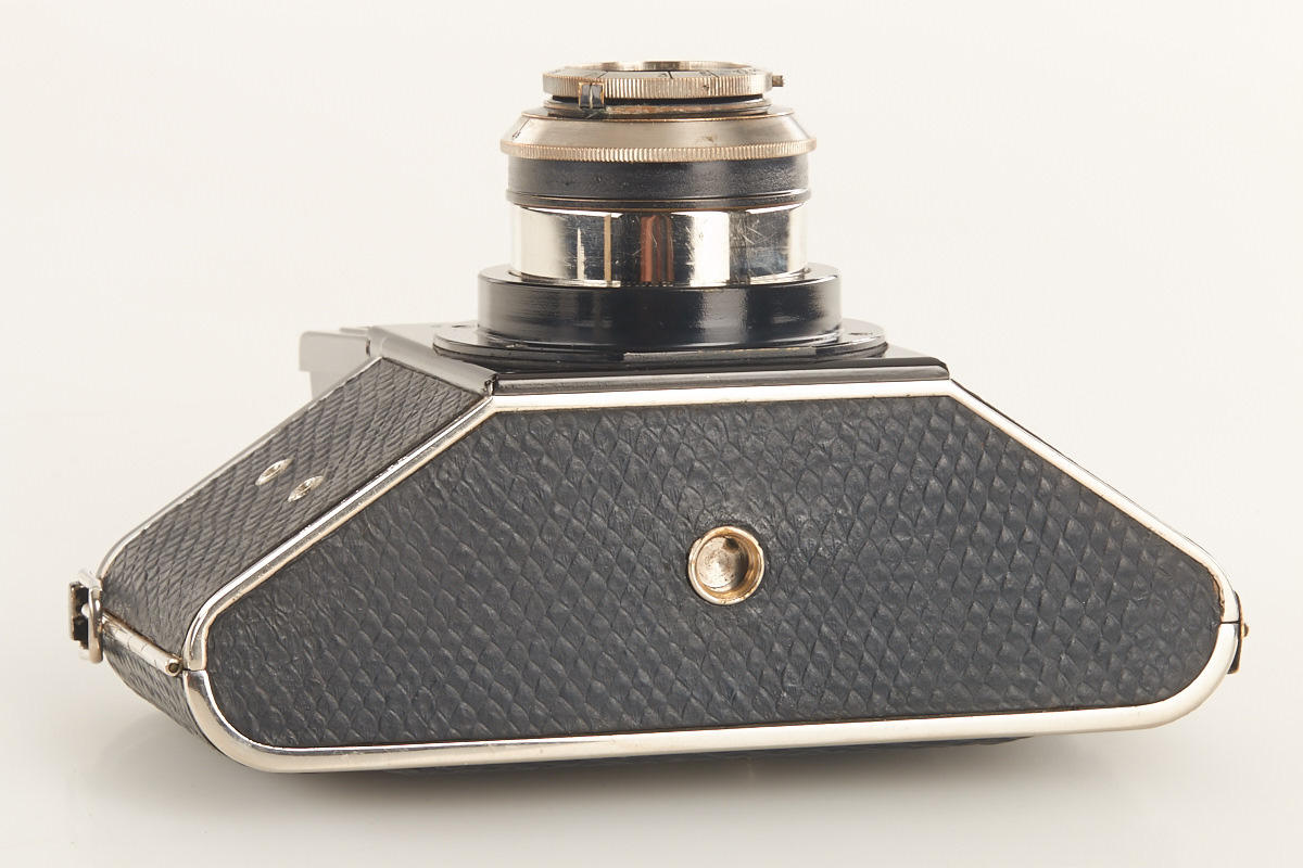 4x6.5cm SLR, second type Junior with lever winding, very uncommon camera with reptile leather covering in good condition (shutter needs service), clean Anastigmat 4.5/7.5cm no.715880, with attached accessory shoe and sync on left side