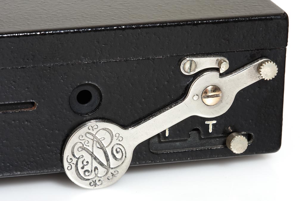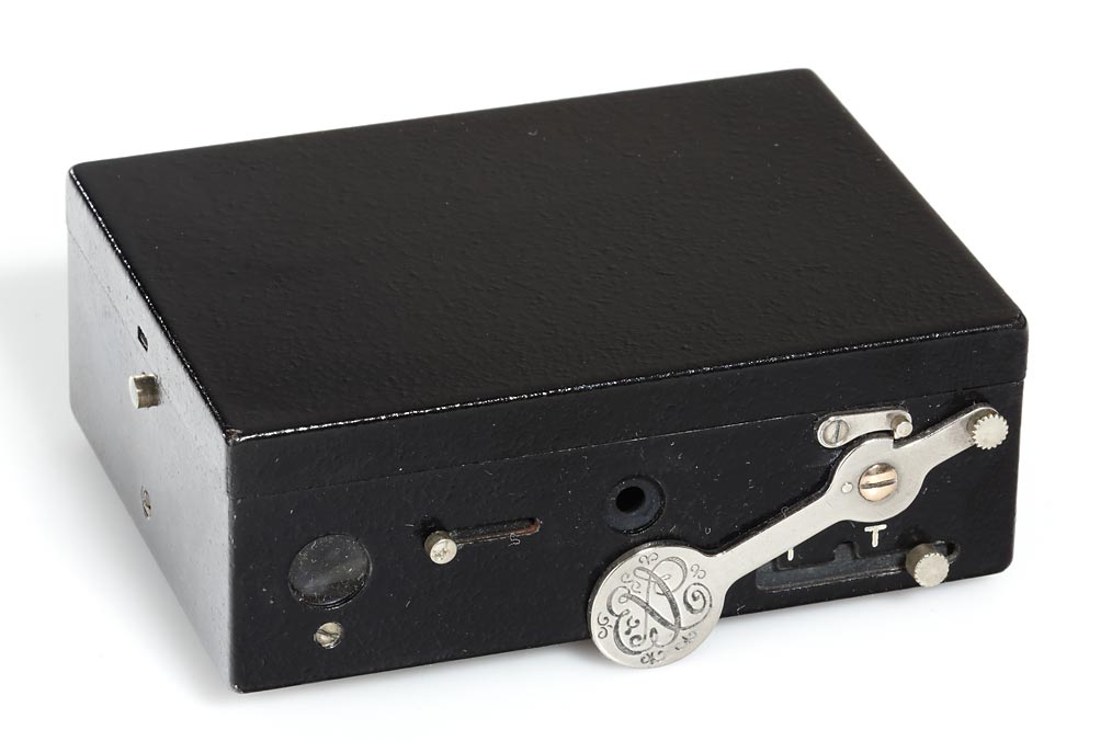 for cassette film, black painted metal body, cloth focal-plane shutter, fixed focus lens, with original everready case