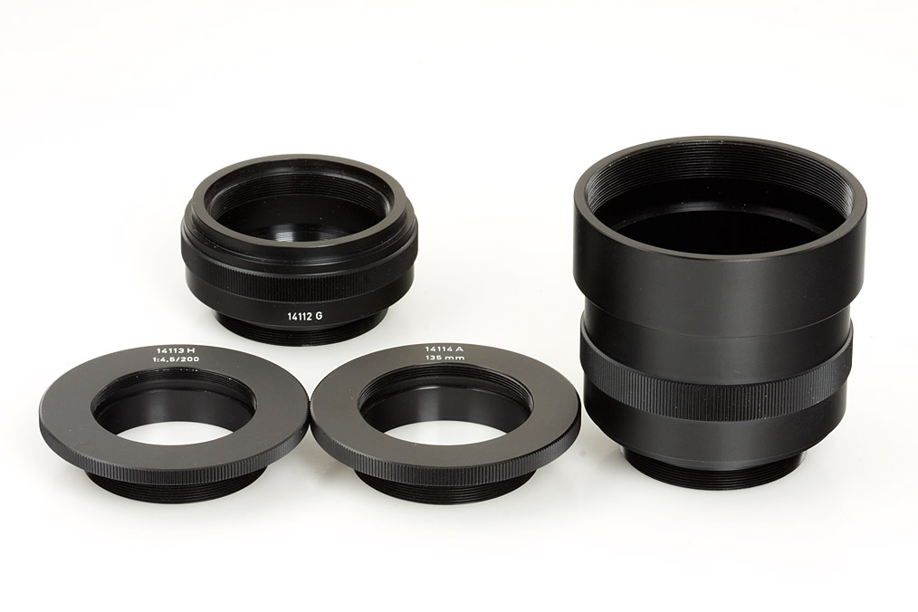 like new FOCORAPID with instructions and adapter-ring 14112 G (Telyt 4.8/280mm) in maker's box, 14113H adapter-ring (Telyt 4.5/200mm) in maker's box, adapter-ring 14114A (f/4 or f/4.5 135mm lens heads) in maker's box, and the very rare E.Leitz New York adapter-ring #98311 (Telyt 5/400mm) (5)