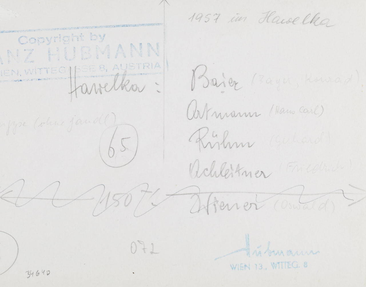 Vintage silver print 12 x 15,2 cm Two photographer's stamps on the reverse, annotated by the photographer in pencil on the reverse from left to right: Konrad Bayer, H. C. Artmann, Gerhard Rühm, Friedrich Achleitner, Oswald Wiener