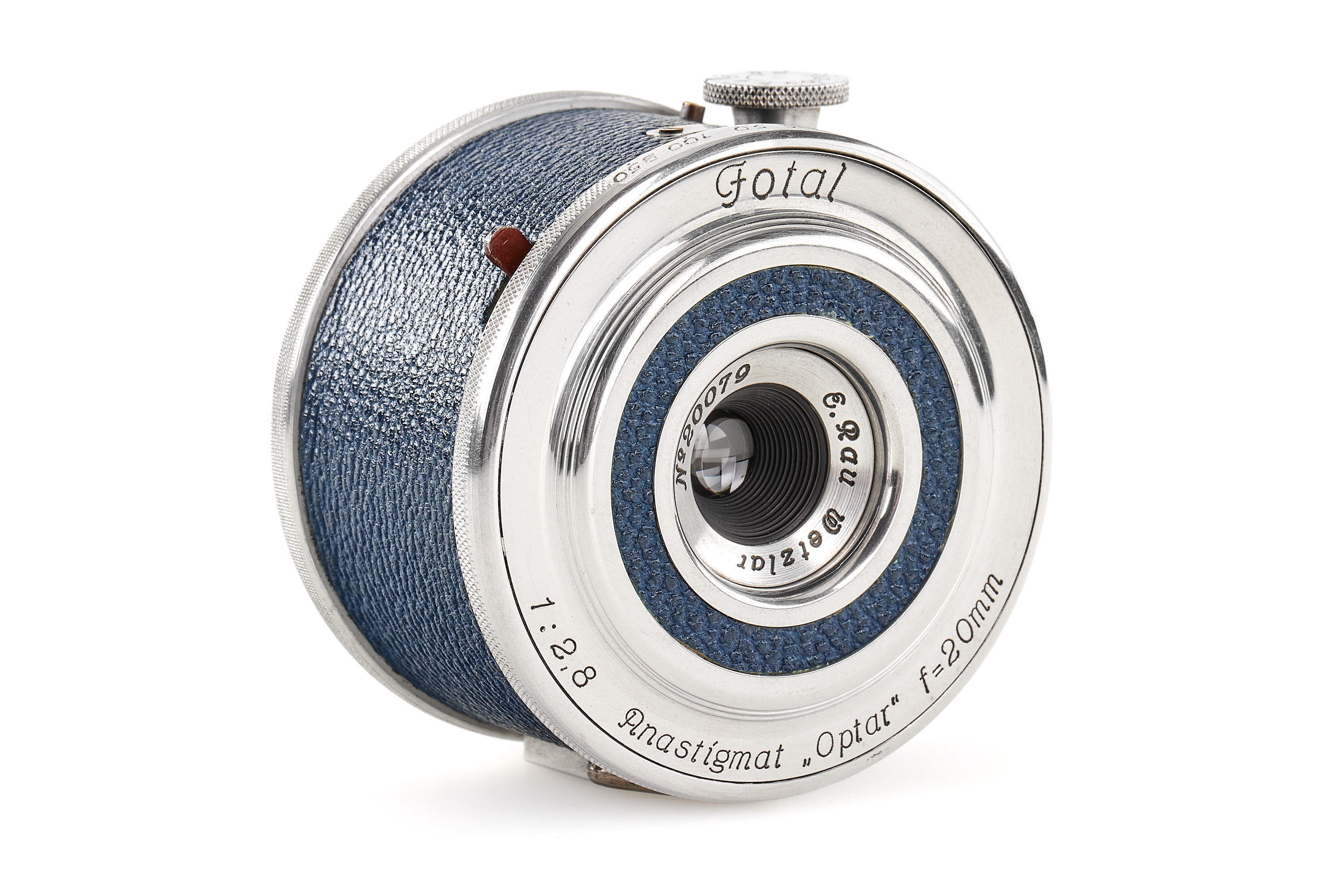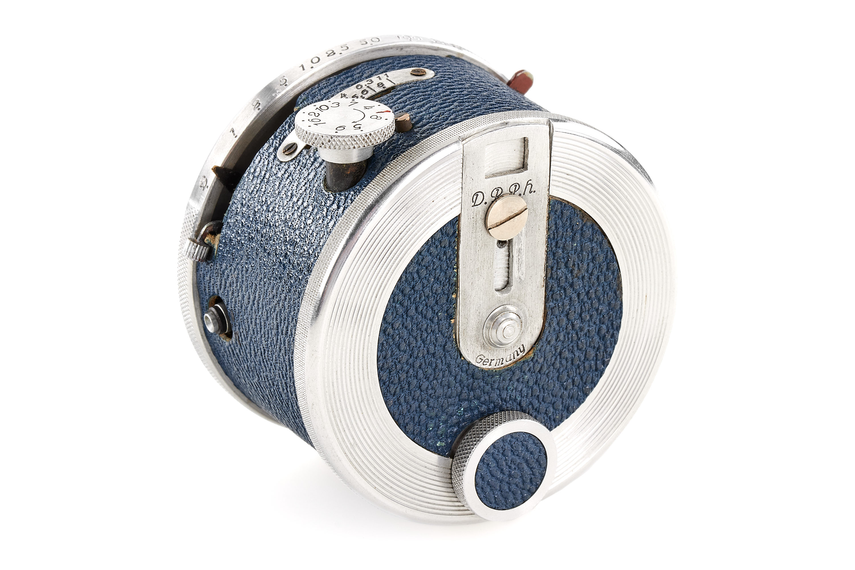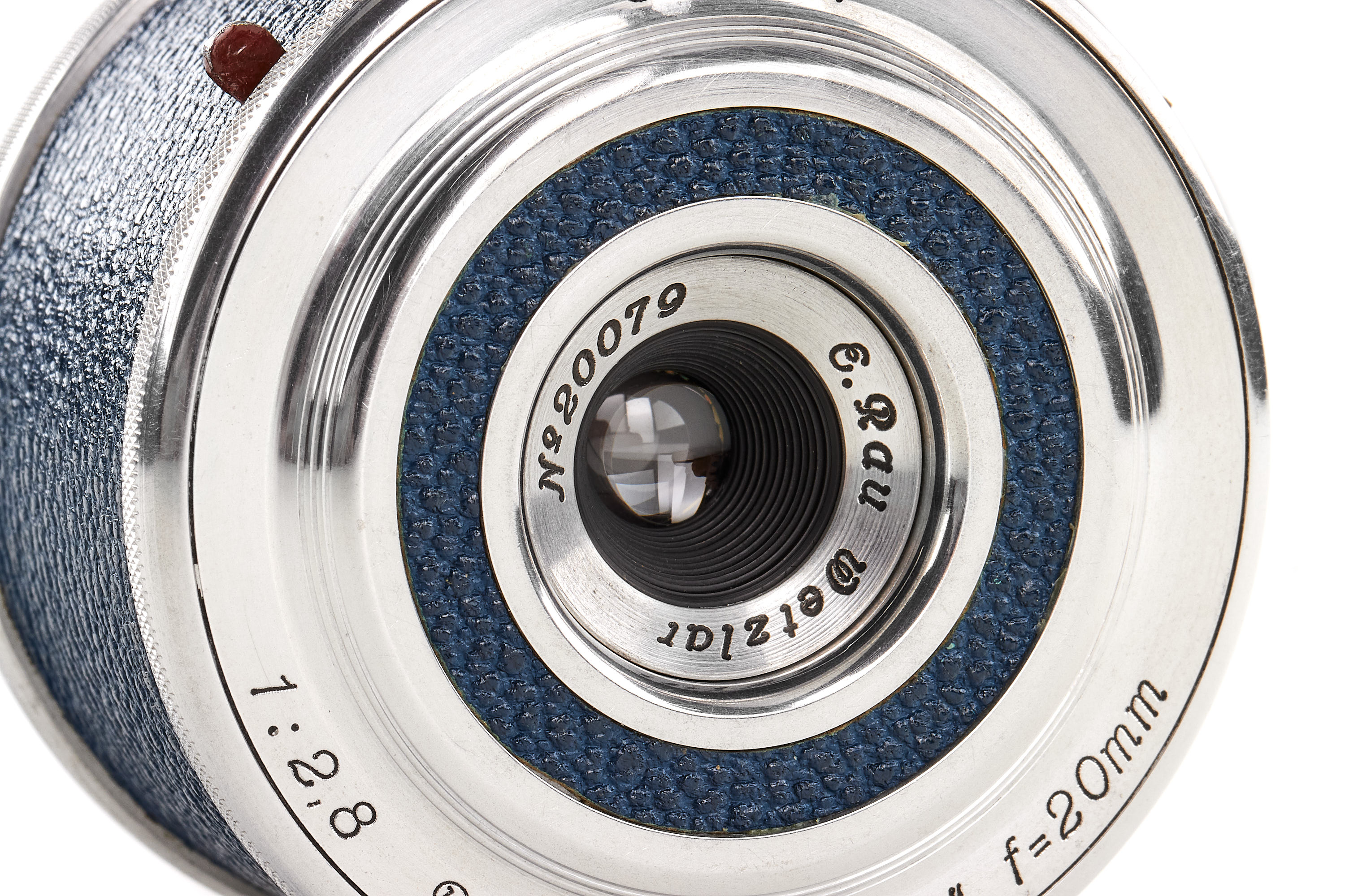 Round subminiature camera for 8x12mm exposures on special rollfilm, in blue leather covering, with Rau Wetzlar Anastigmat Optar 2.8/20mm, extremely rare camera in very good and original condition, in working order, only less than 100 cameras were produced - the variation with blue leather is the rarest, only few are known to exist, with rare matching blue leather case.