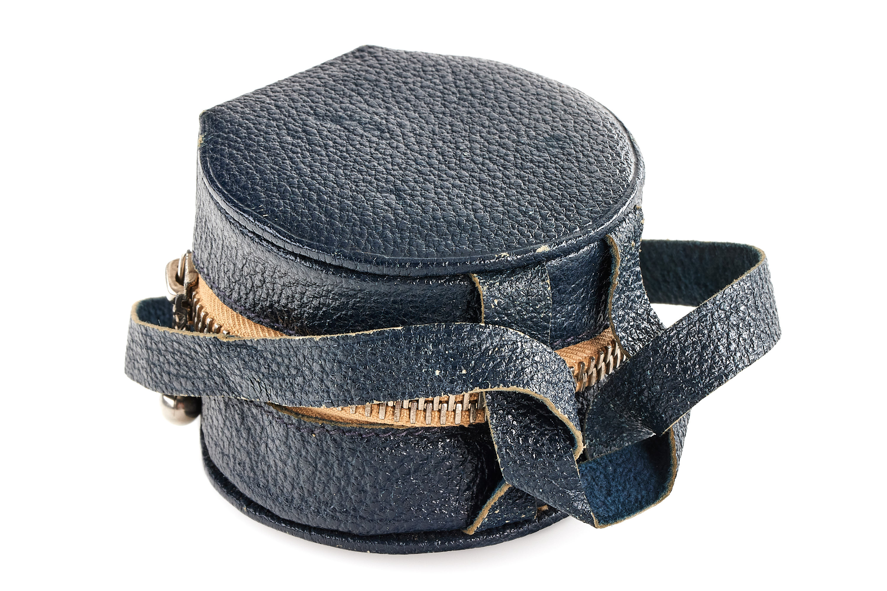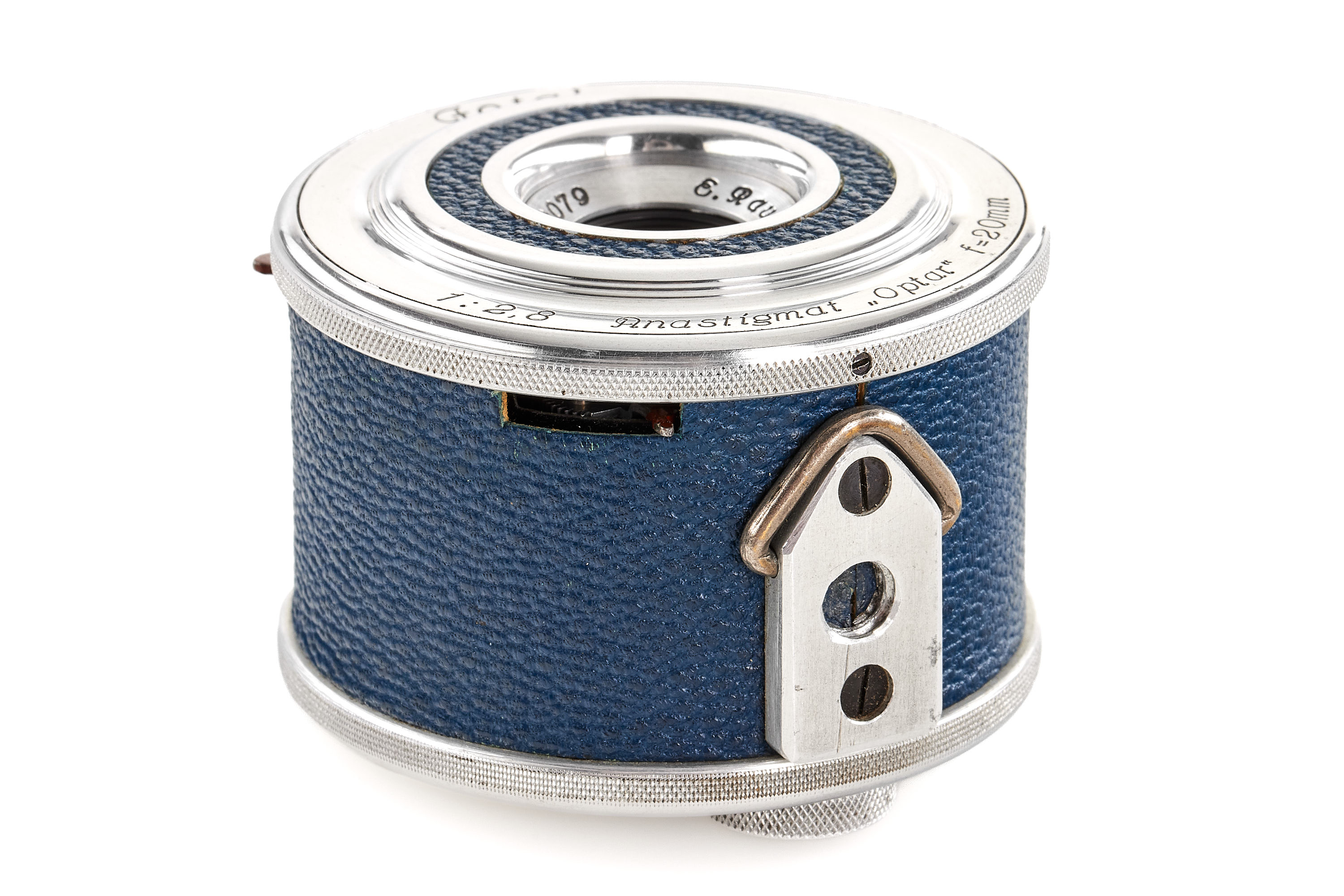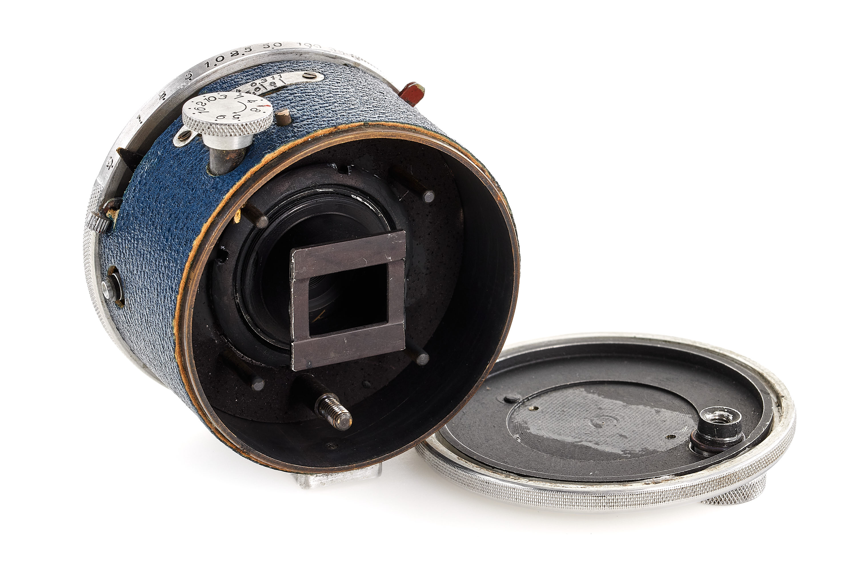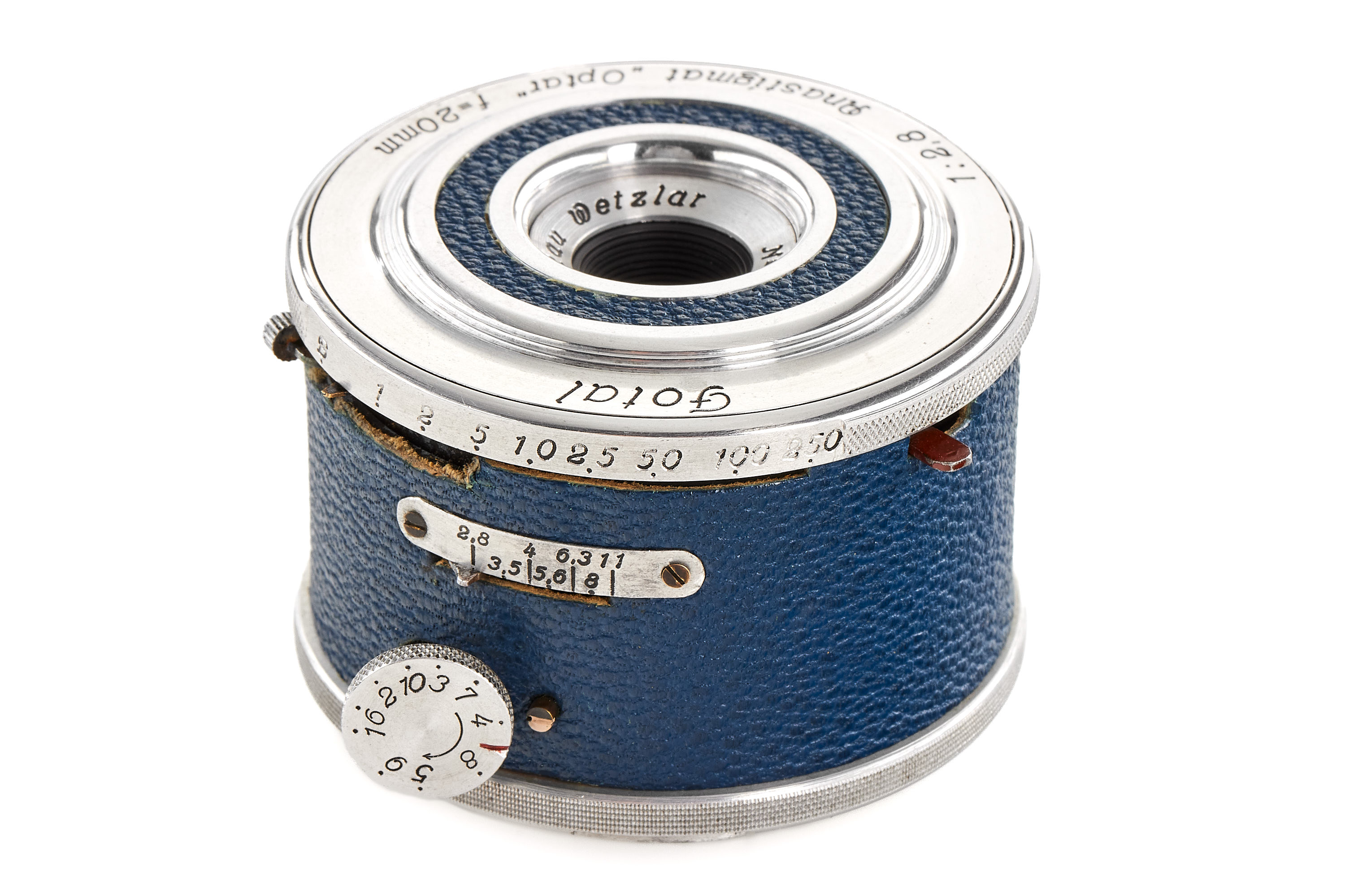 Round subminiature camera for 8x12mm exposures on special rollfilm, in blue leather covering, with Rau Wetzlar Anastigmat Optar 2.8/20mm, extremely rare camera in very good and original condition, in working order, only less than 100 cameras were produced - the variation with blue leather is the rarest, only few are known to exist, with rare matching blue leather case.