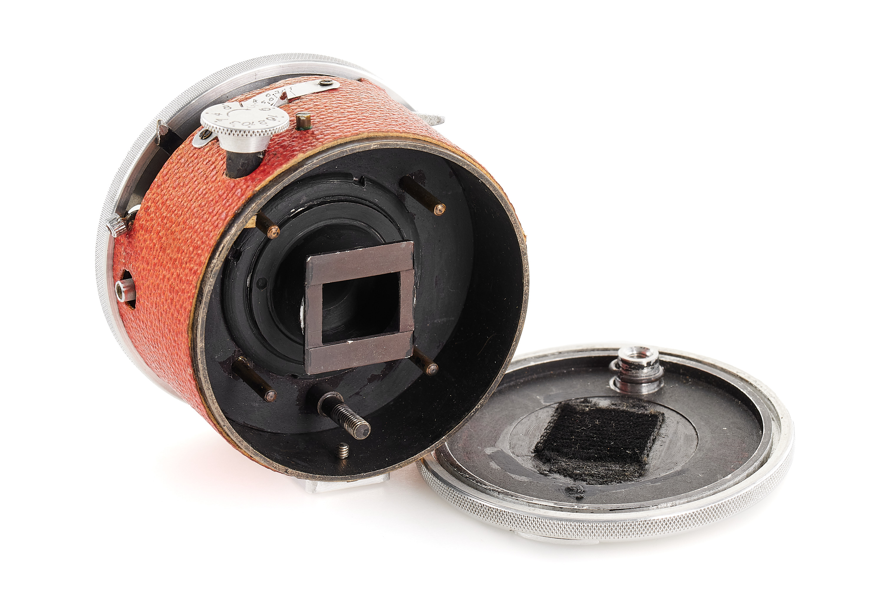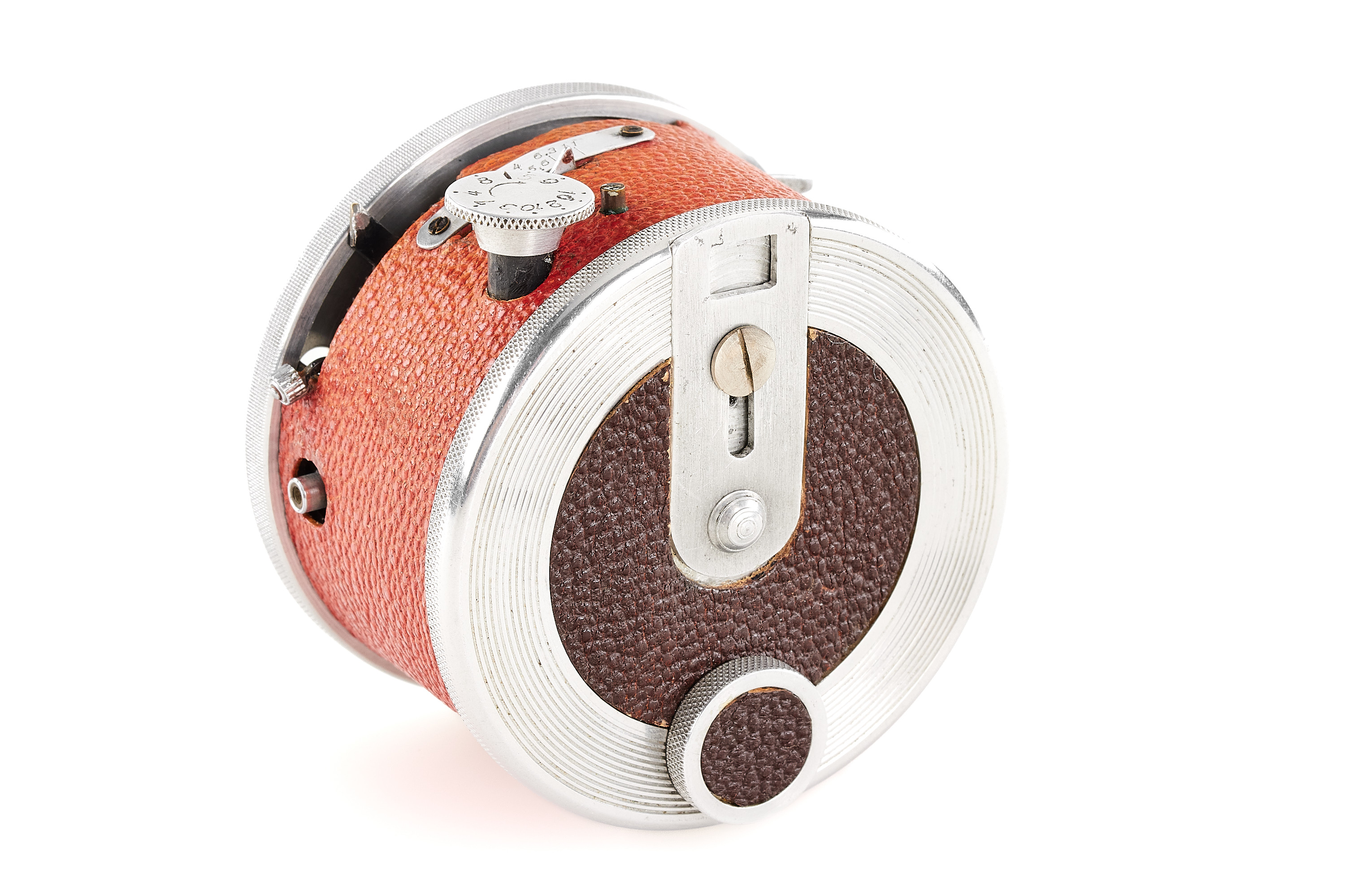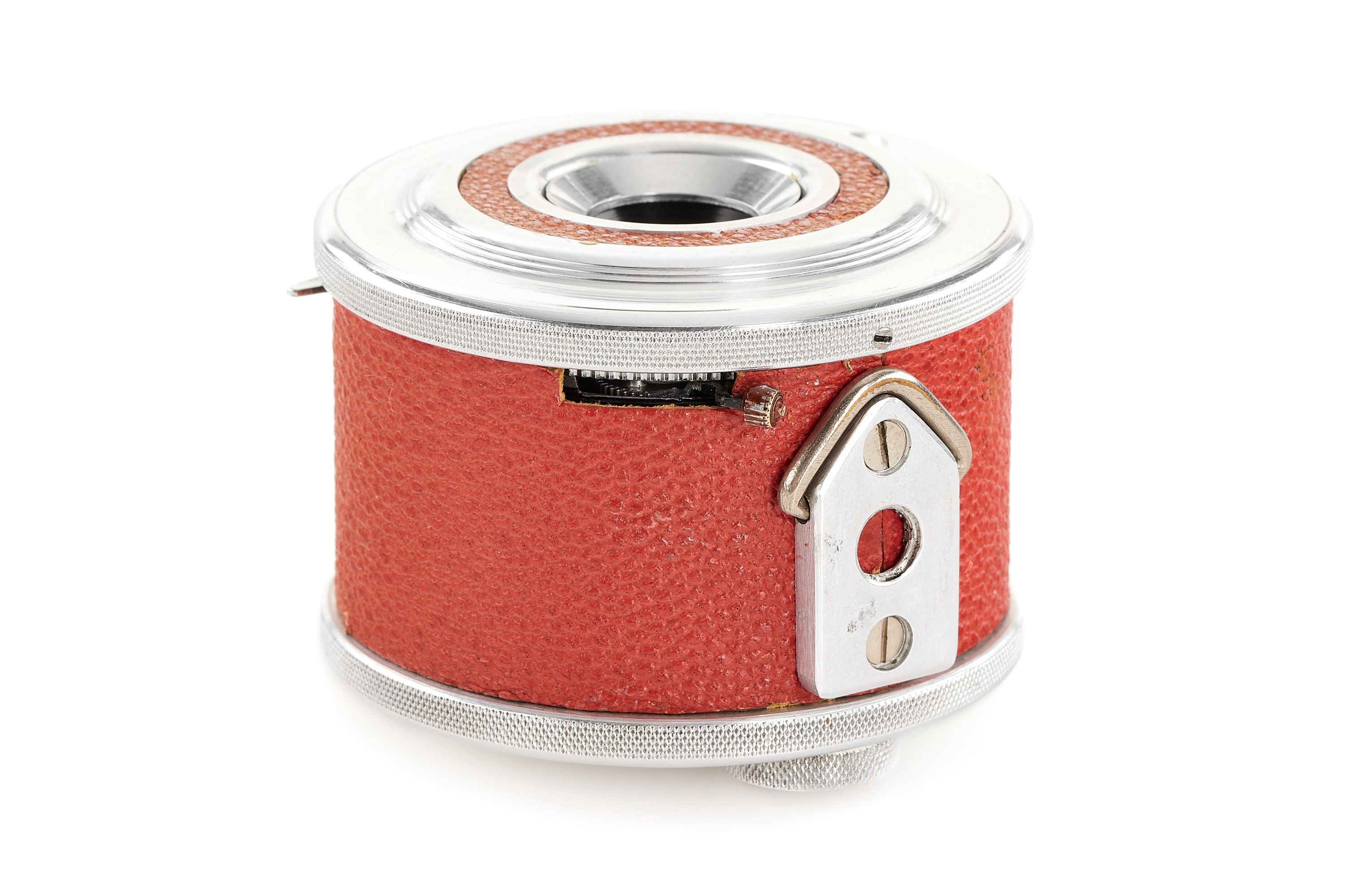 A prototype round subminiature for 8x12mm exposures on special roll film, red leather covering, no markings on the camera or lens. Some technical differences to the production model (like a film speed window on the front). In excellent condition.