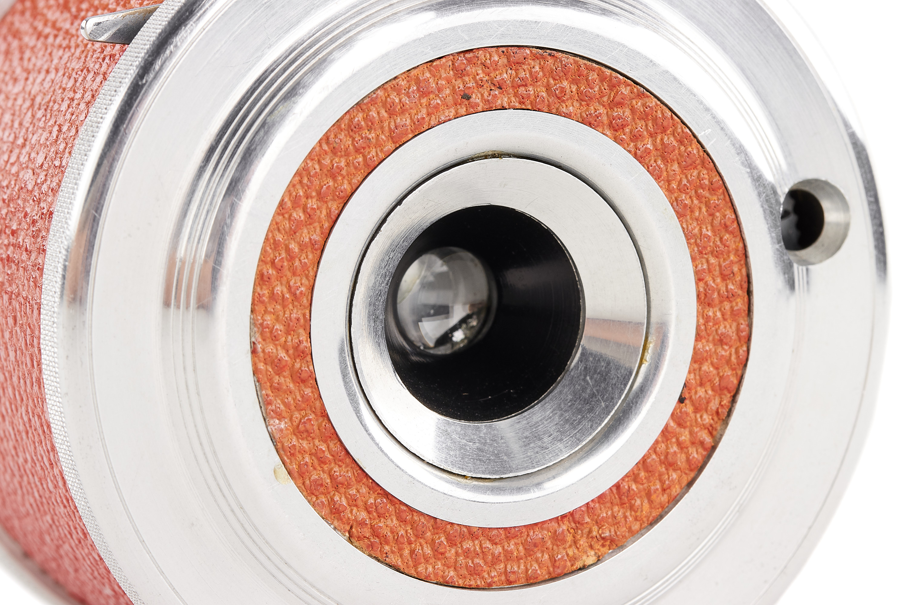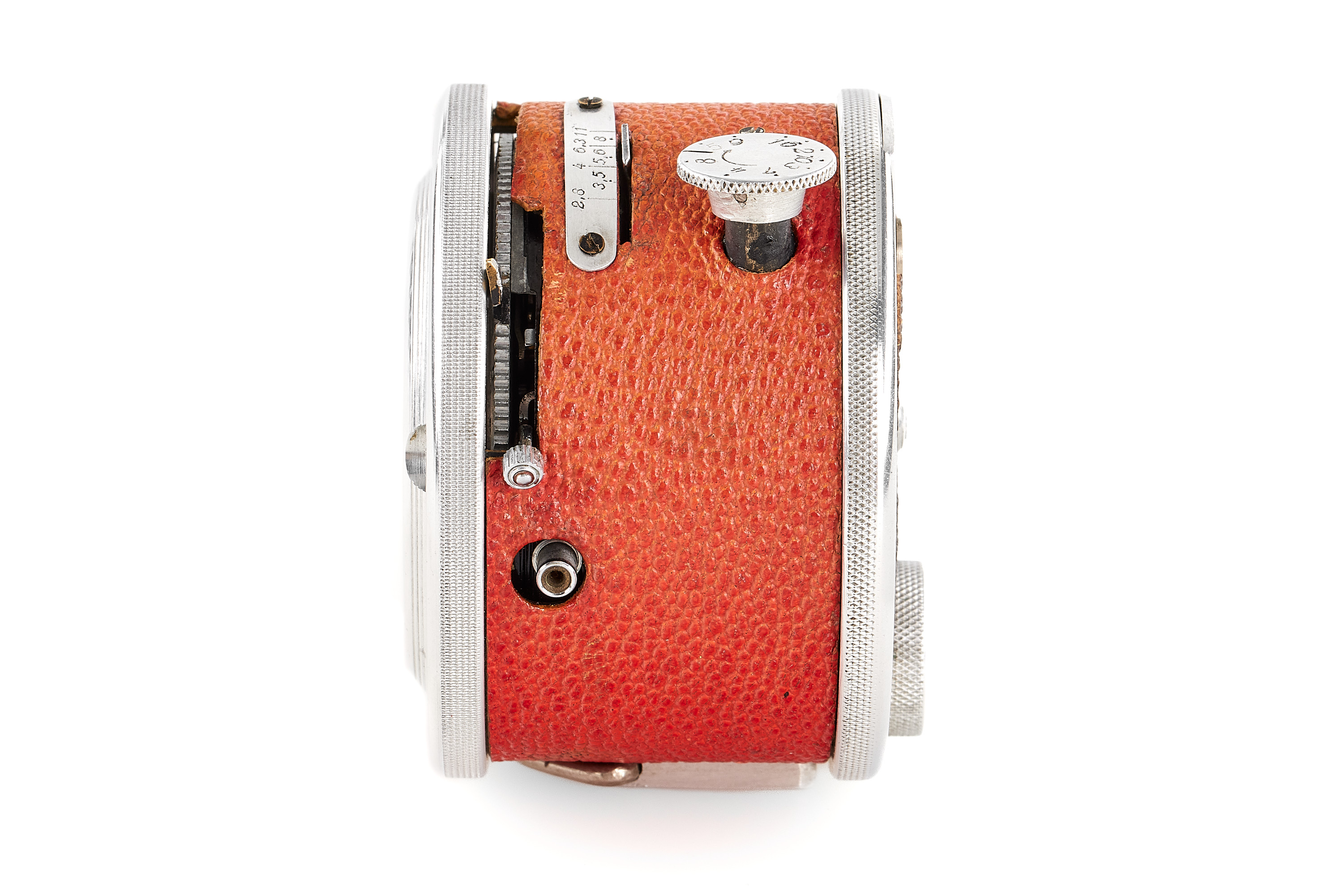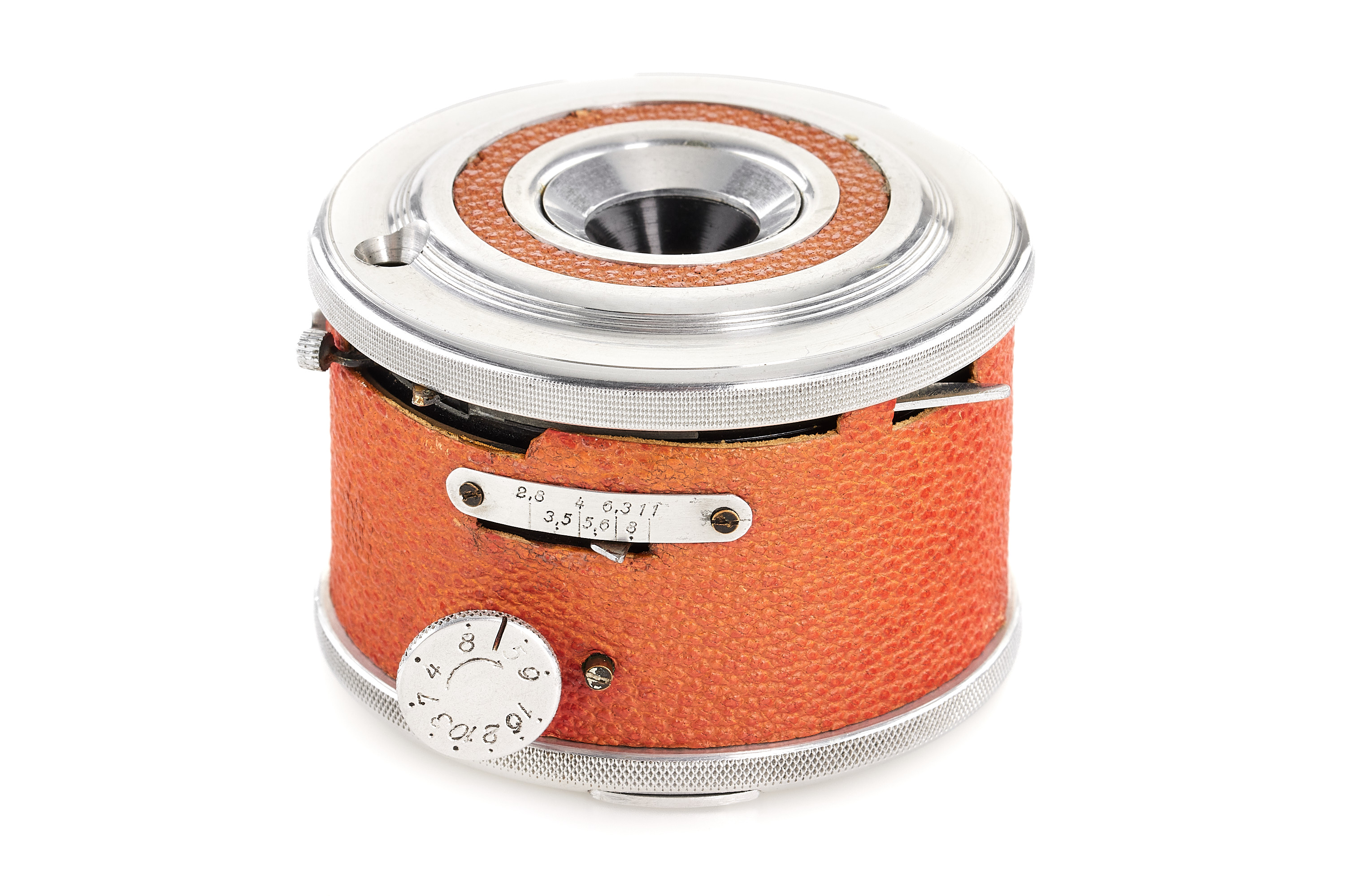 A prototype round subminiature for 8x12mm exposures on special roll film, red leather covering, no markings on the camera or lens. Some technical differences to the production model (like a film speed window on the front). In excellent condition.