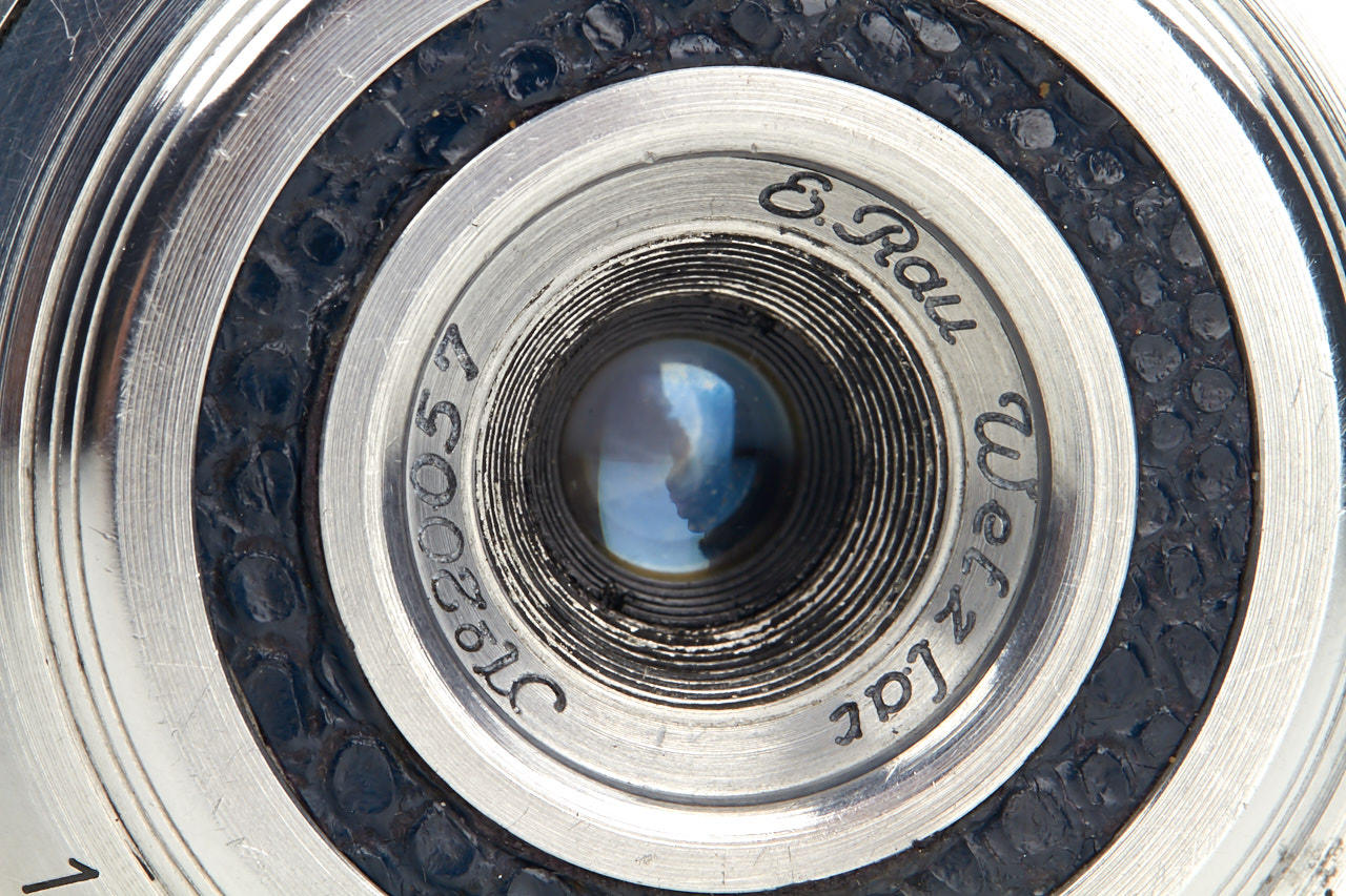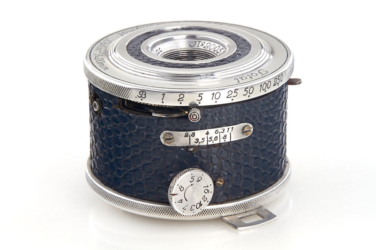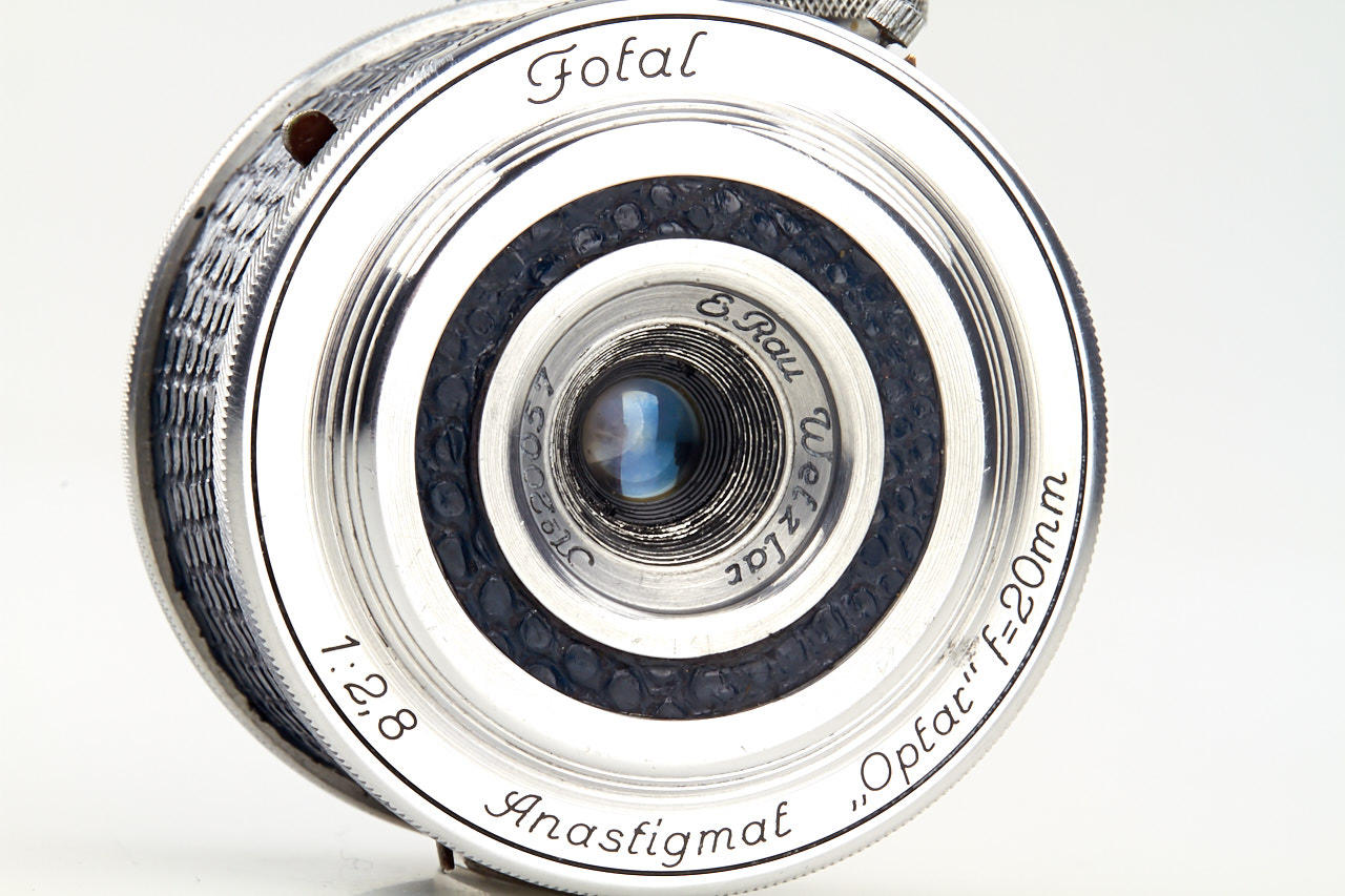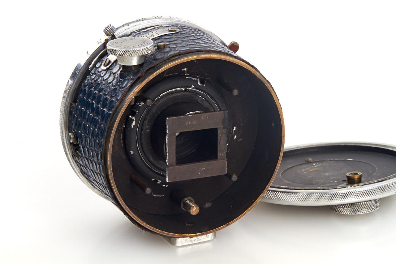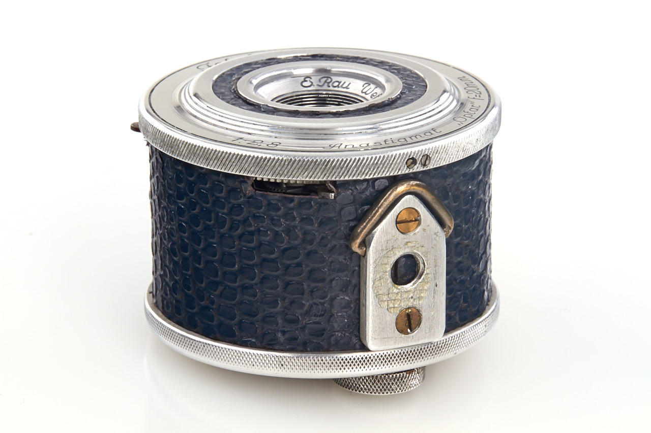 round subminiature for 8x12mm exposures on special rollfilm, blue reptile leather covering, Rau Wetzlar Anastigmat Optar 2.8/20mm, extremely rare camera in fine original condition, only less than 100 cameras were produced - the variation with blue reptile leather is the most rare, we know only one more example (no.20035)