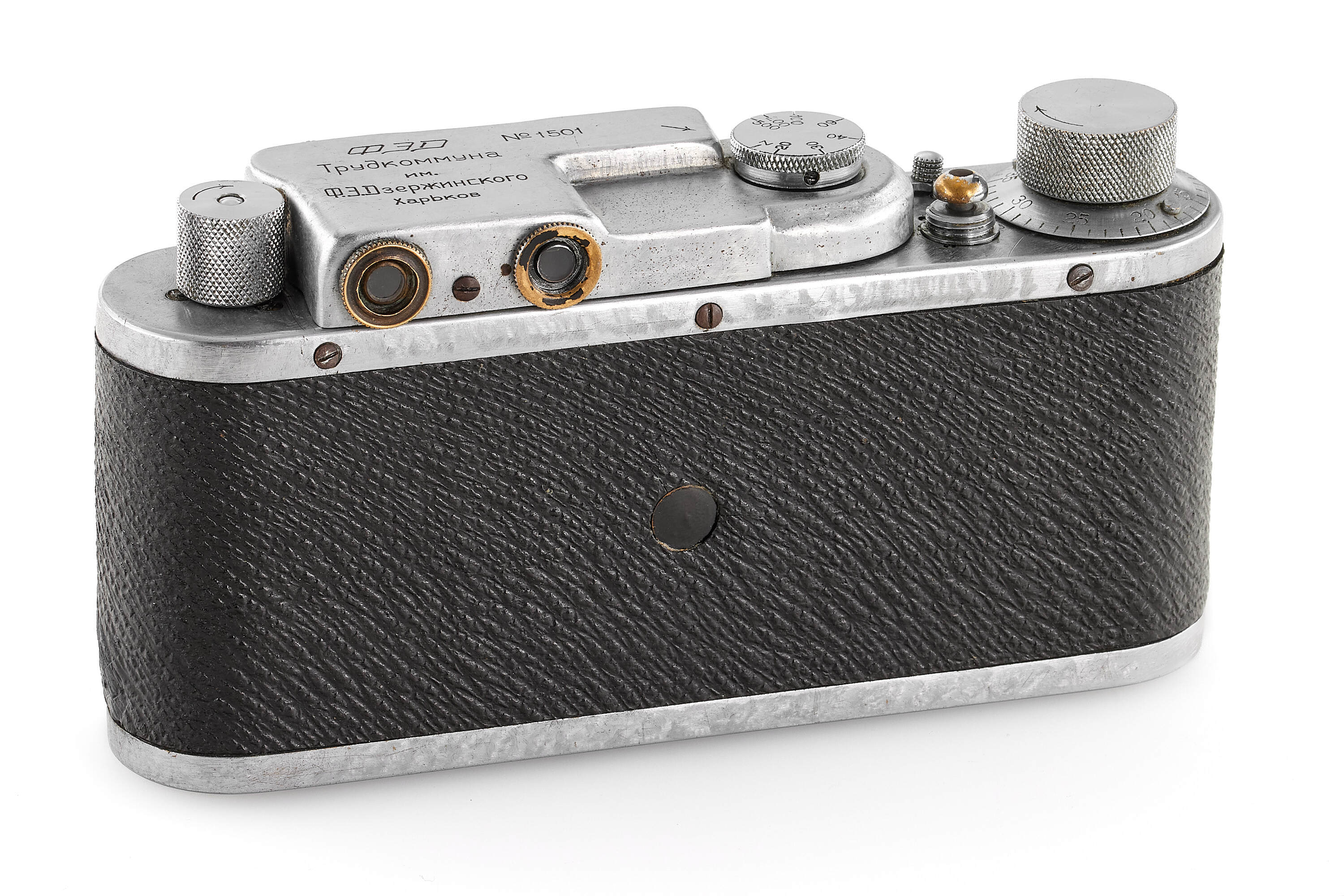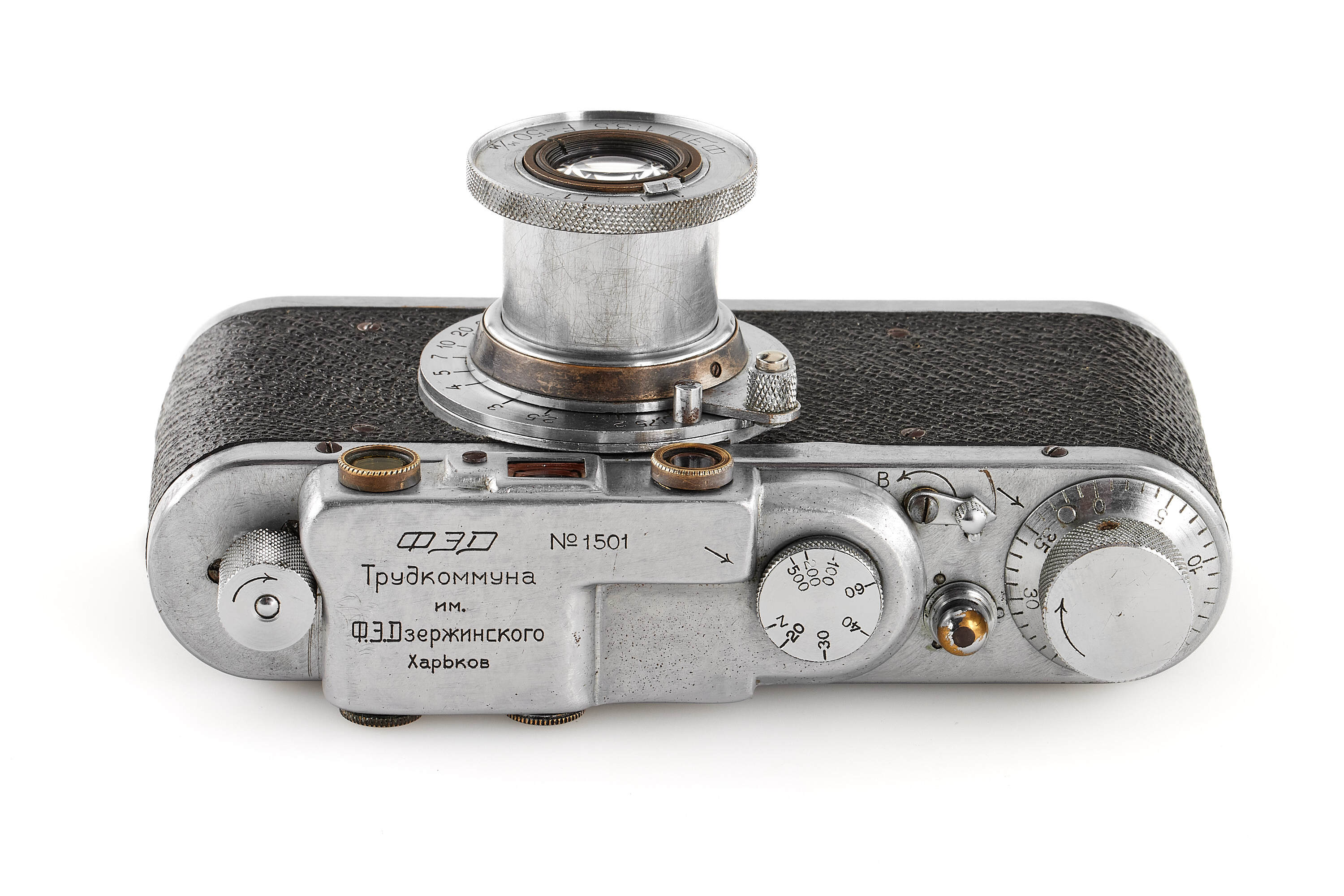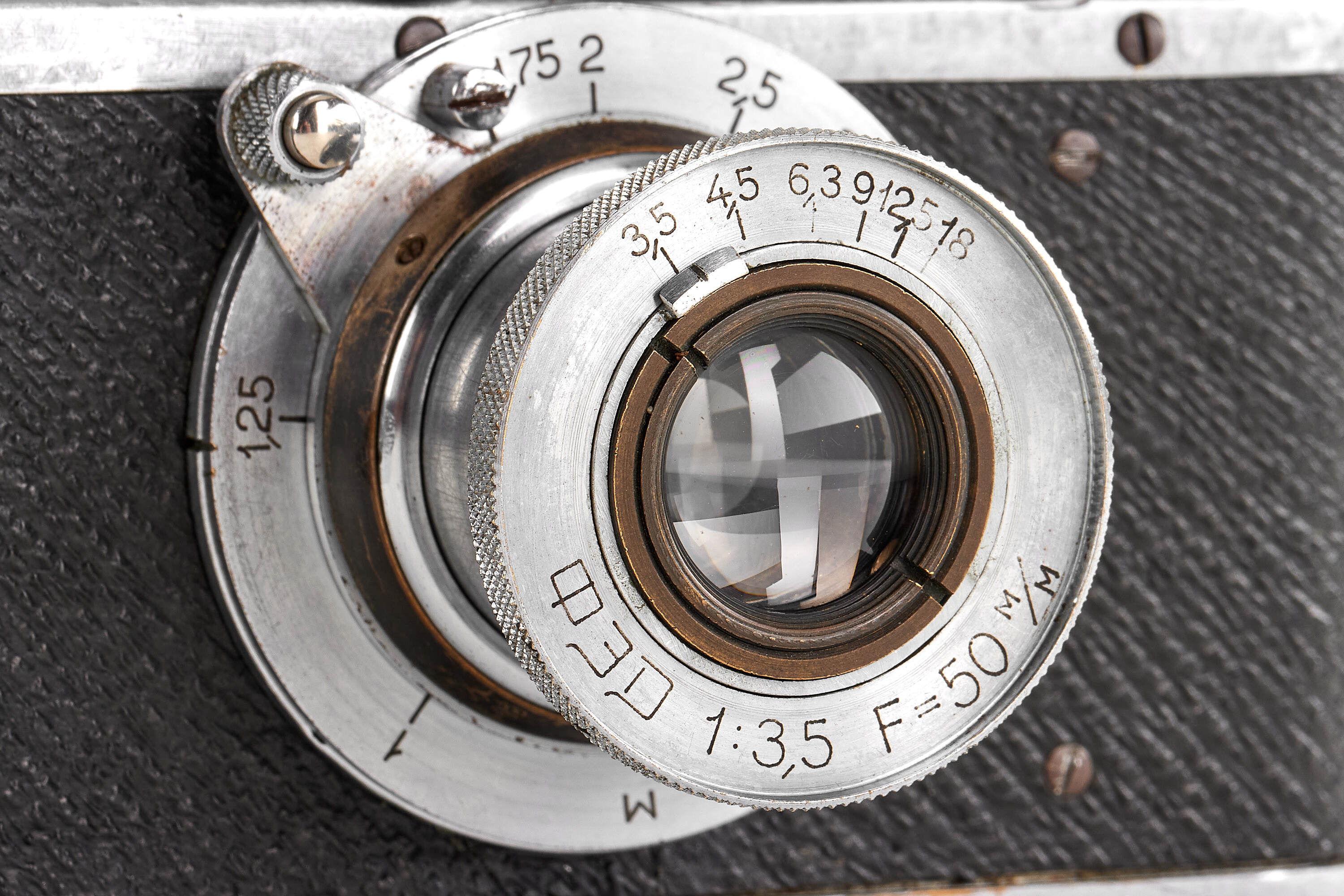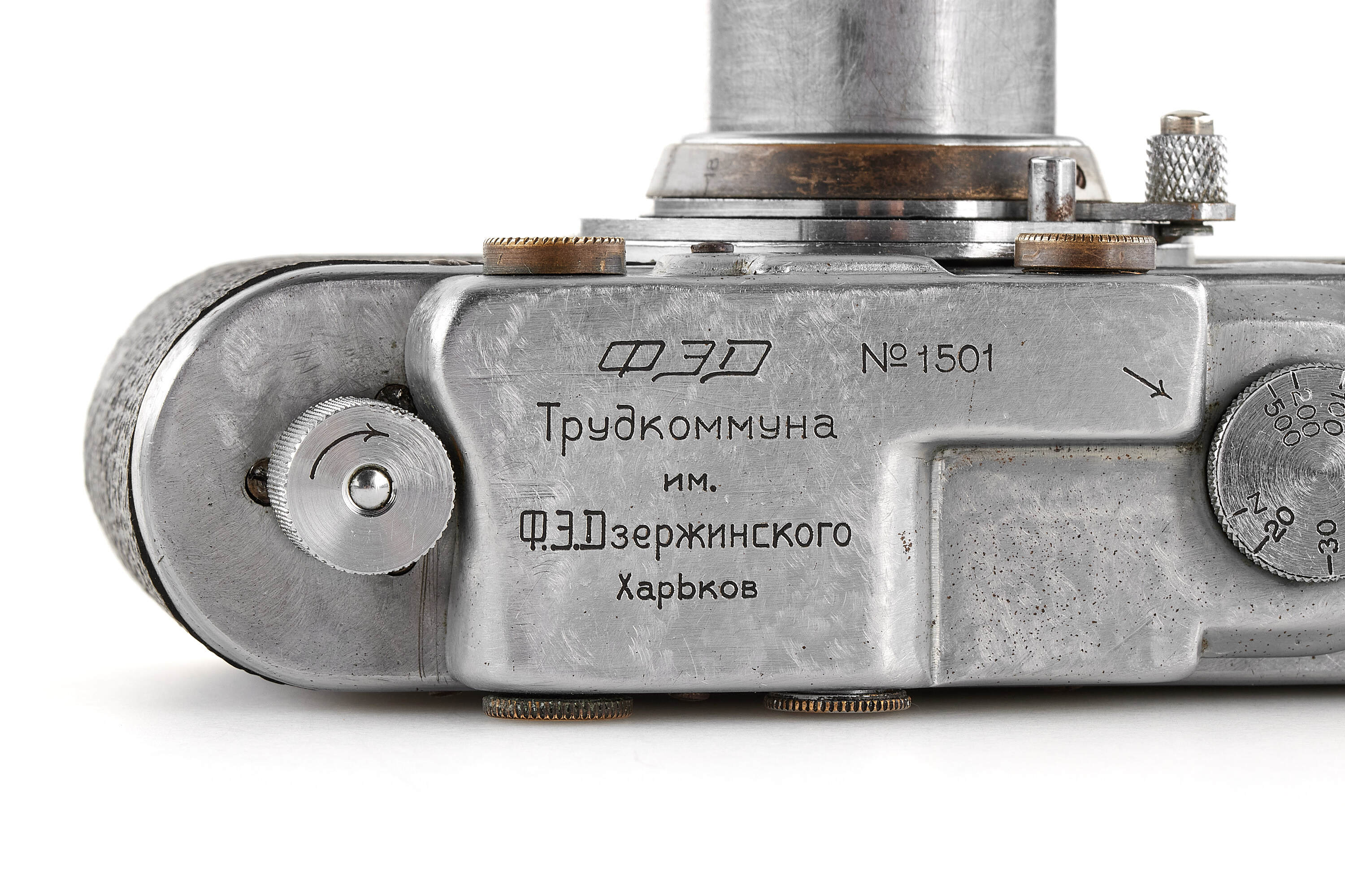 Very early and rare Fed I, with typical signs of machining process visible under the chrome finish, and unique, special vulcanite covering similar to the Leica sharkskin type, with Fed 3.5/50mm (stamped on the mounting flange with the numbers 39 and 1123), early, incomplete leather case.