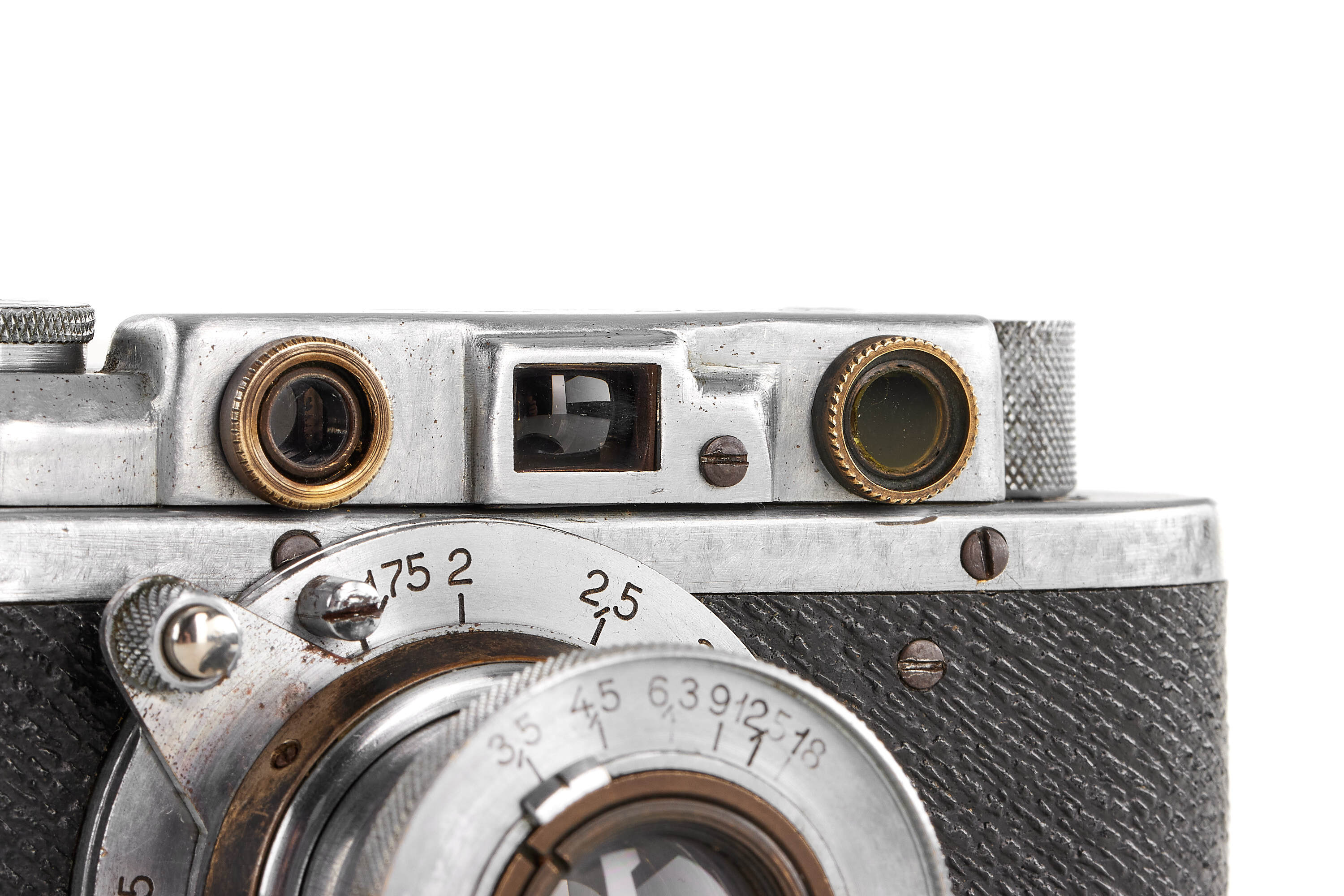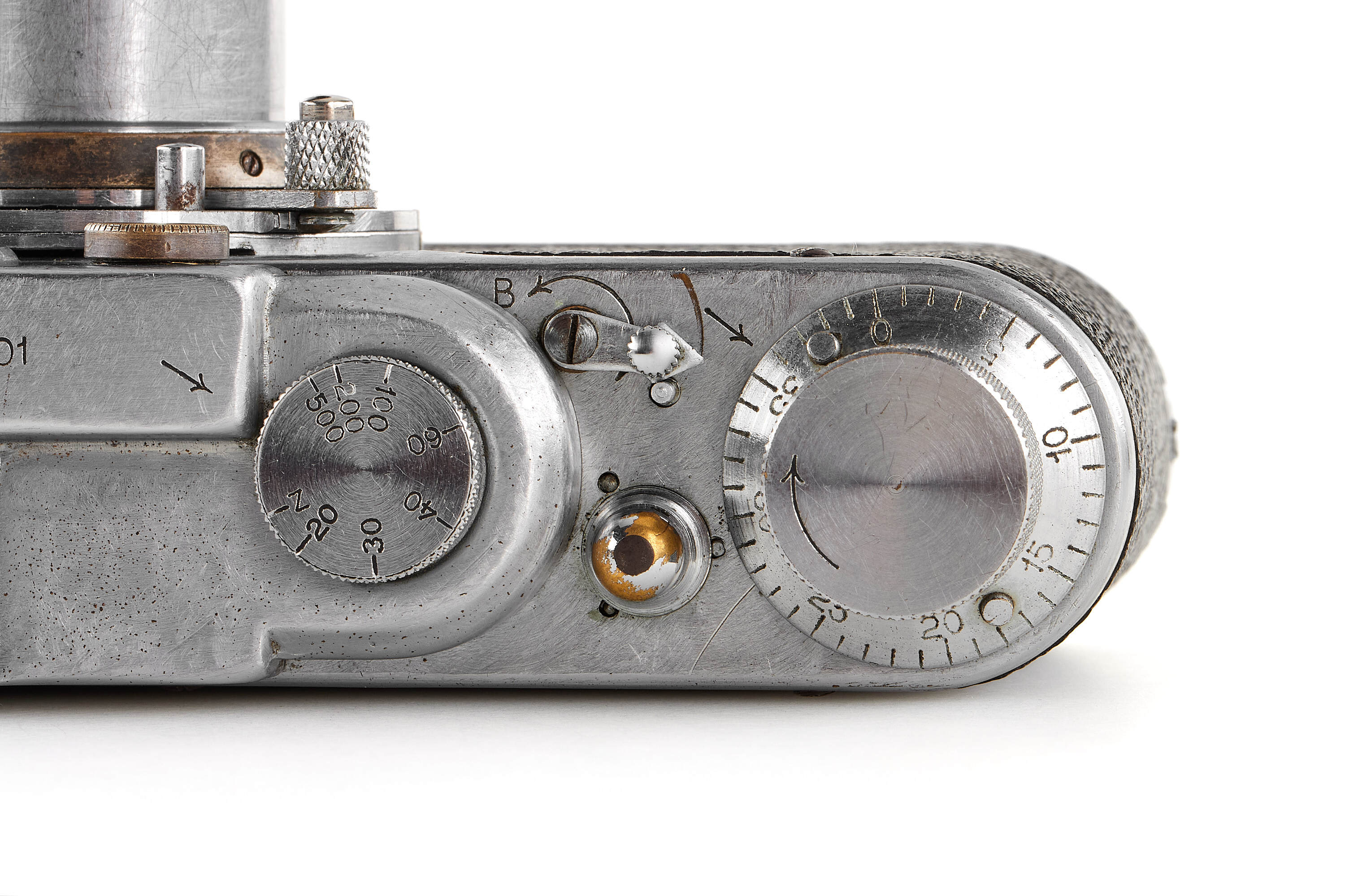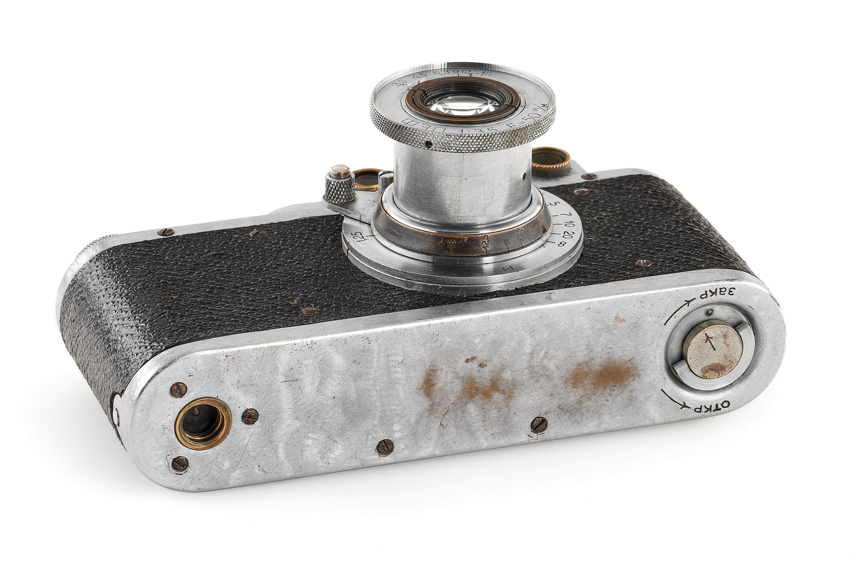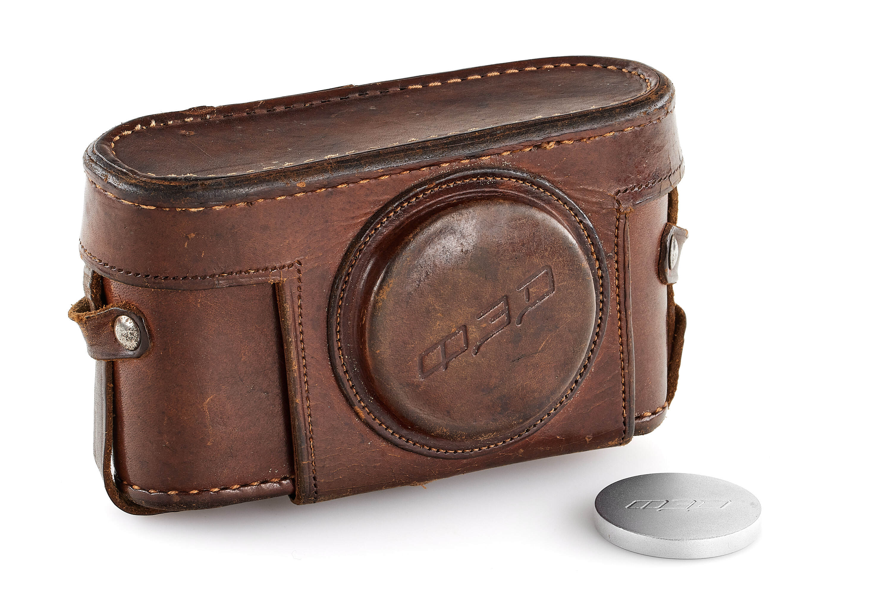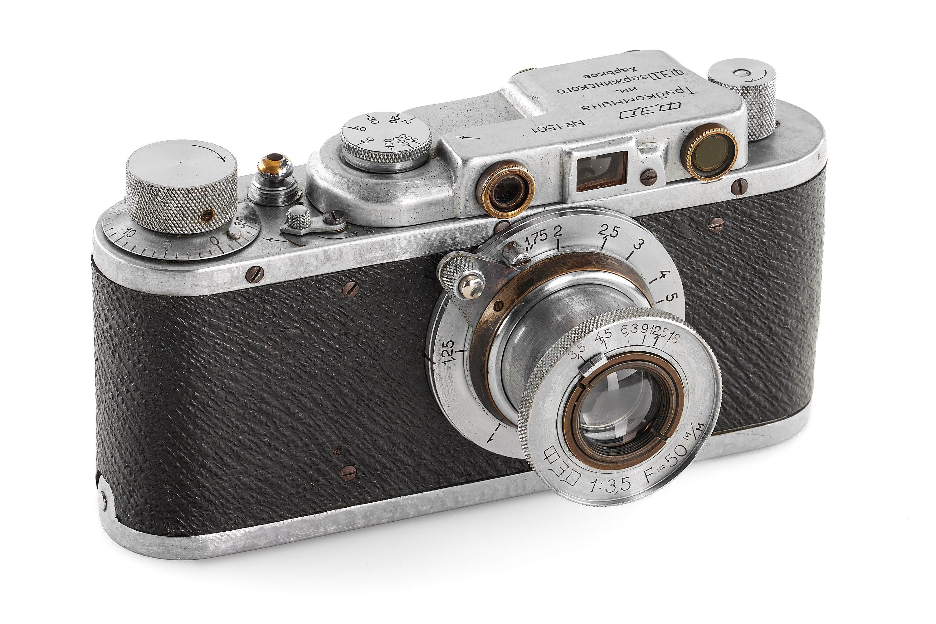 Very early and rare Fed I, with typical signs of machining process visible under the chrome finish, and unique, special vulcanite covering similar to the Leica sharkskin type, with Fed 3.5/50mm (stamped on the mounting flange with the numbers 39 and 1123), early, incomplete leather case.