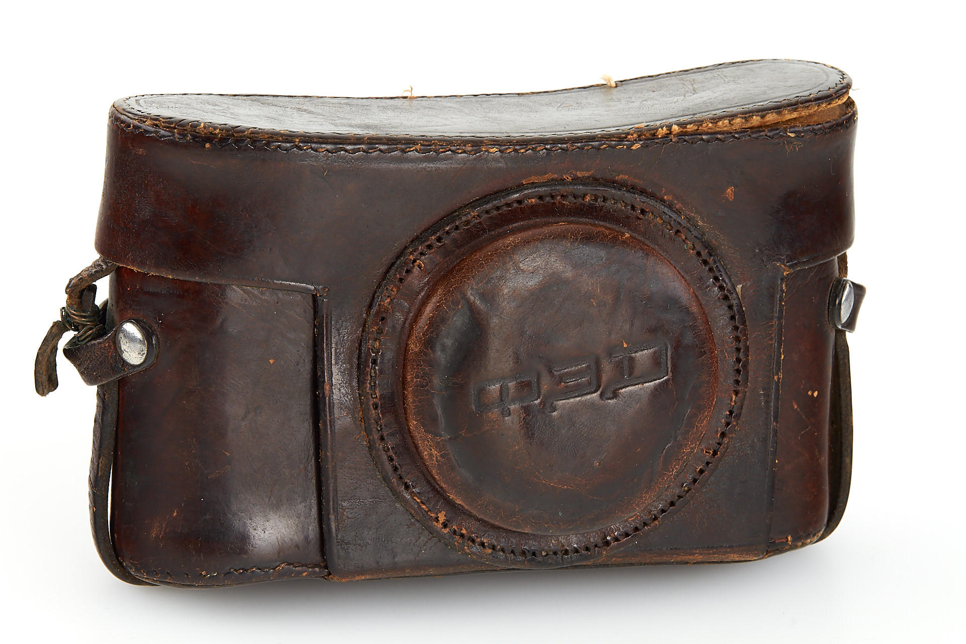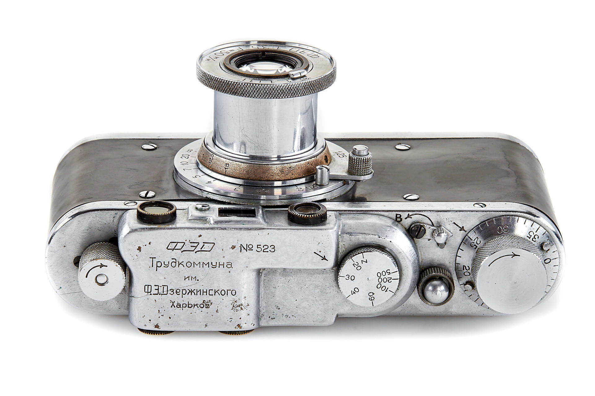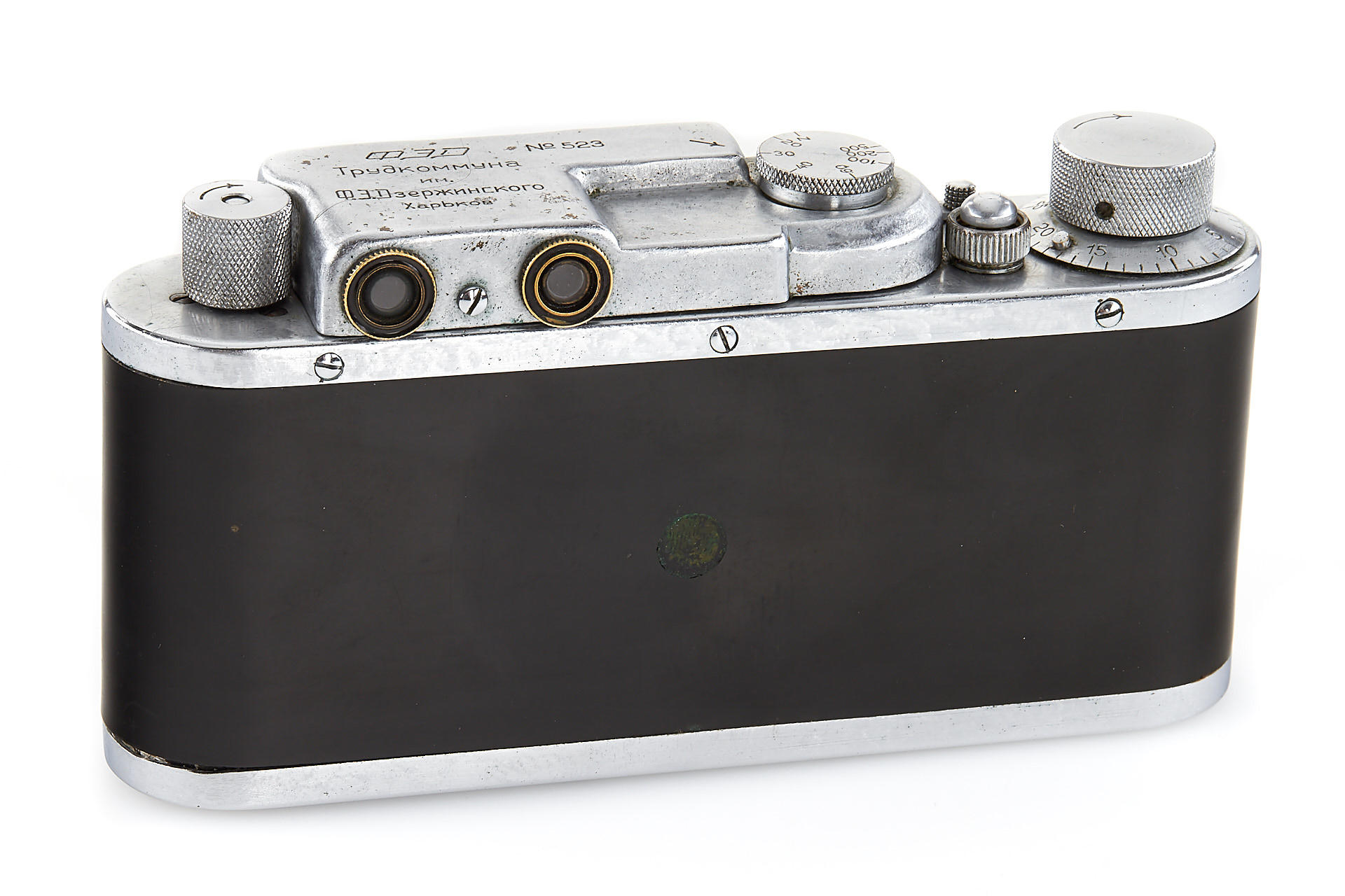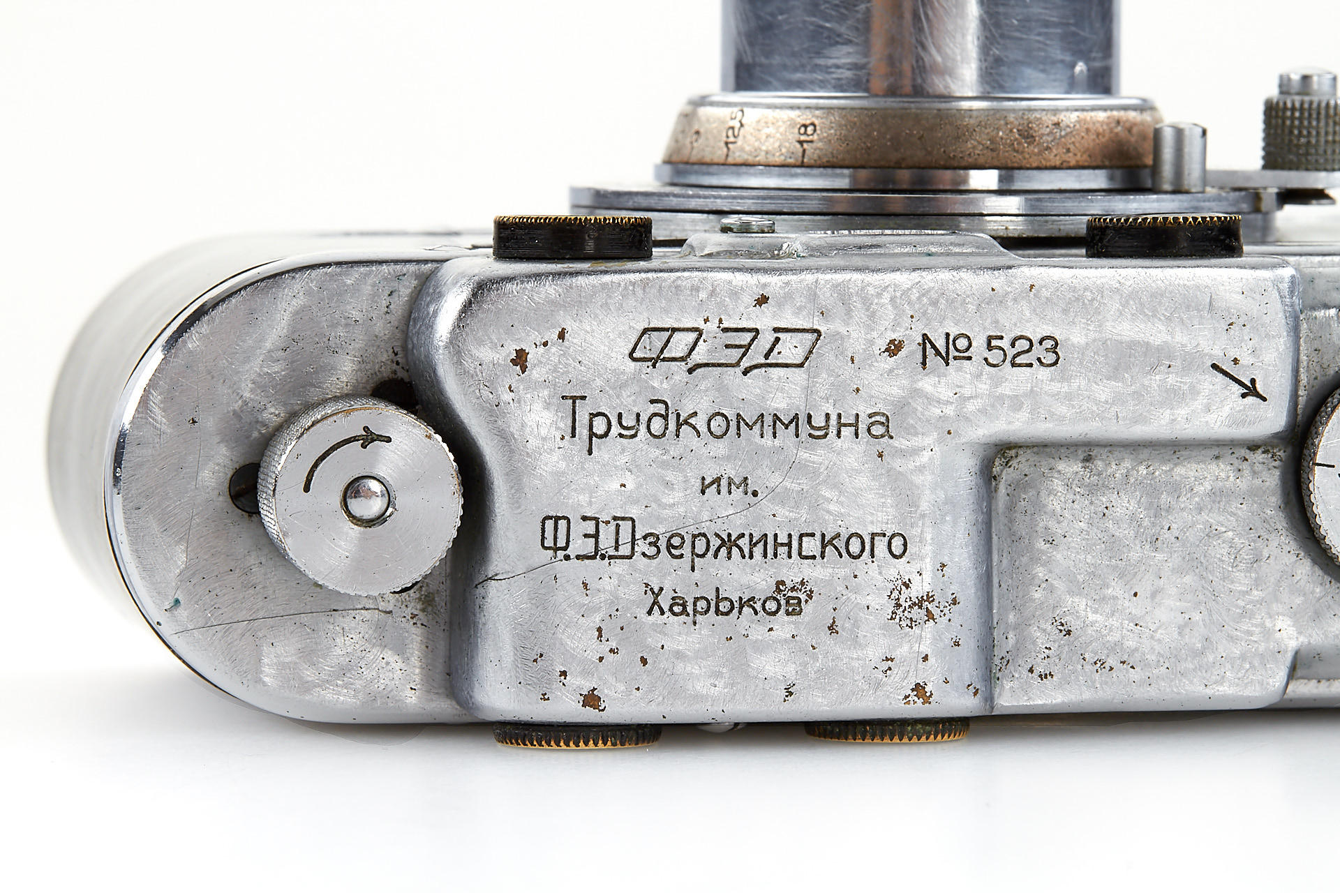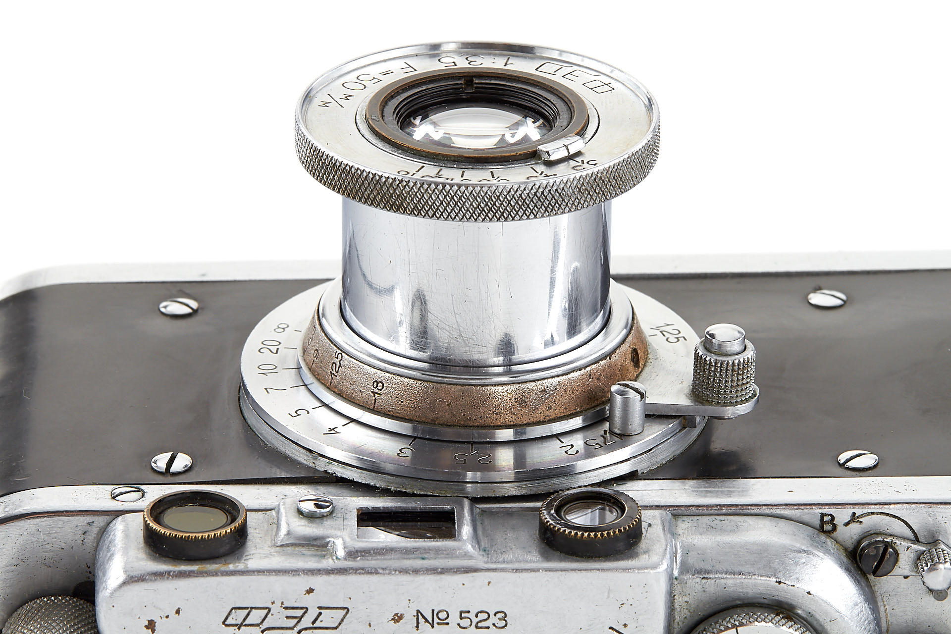 very early and rare Fed I, the third version with typical sings of machining process visible under the chrome finish, and unique, fine vulcanite covering without the texture known from the later cameras and Leicas, in very good condition, with matching Fed 3.5/50mm (stamped on the mounting flange with the camera number 523, DOF scale ring finished in brass), matching lens cap and worn early leather case