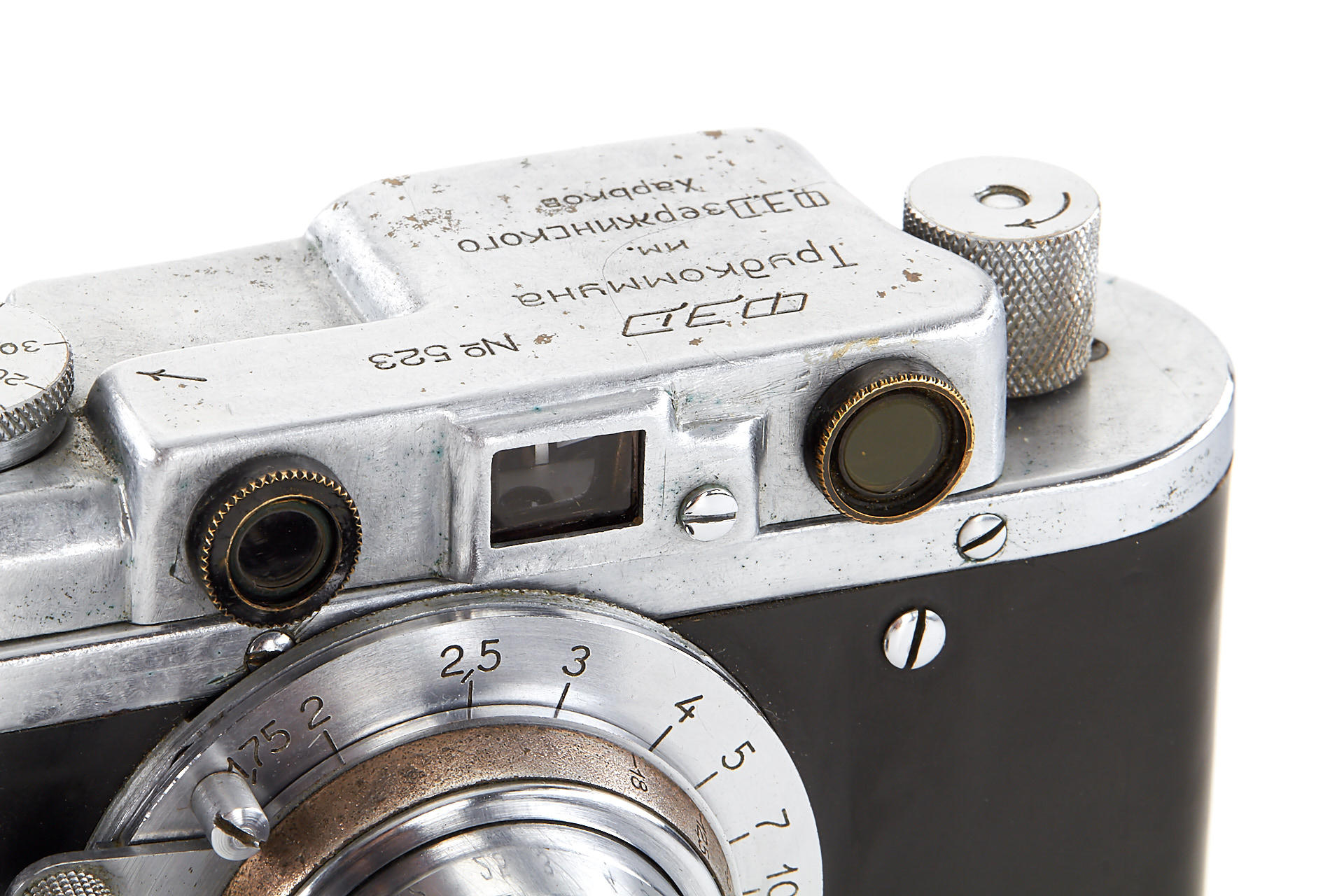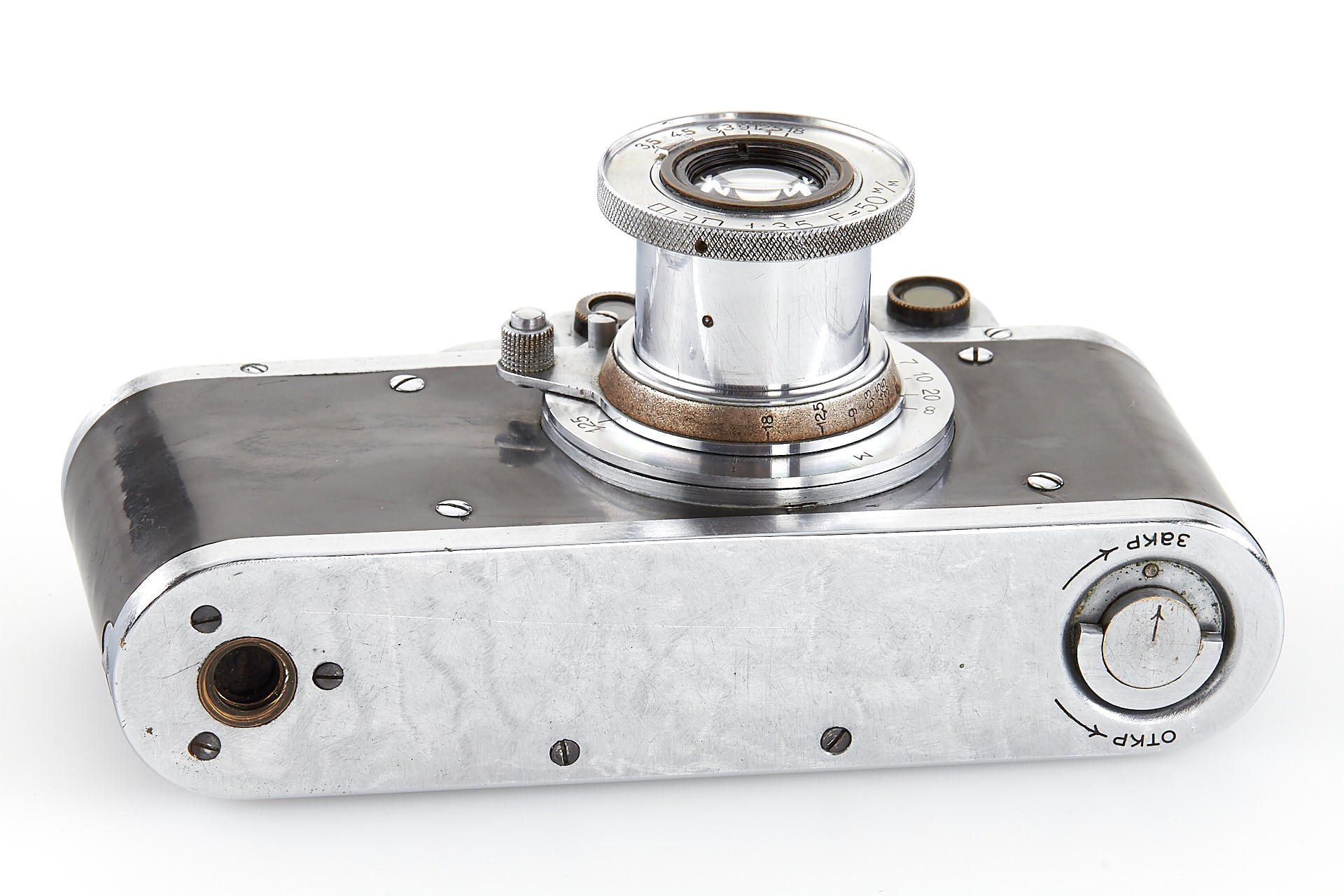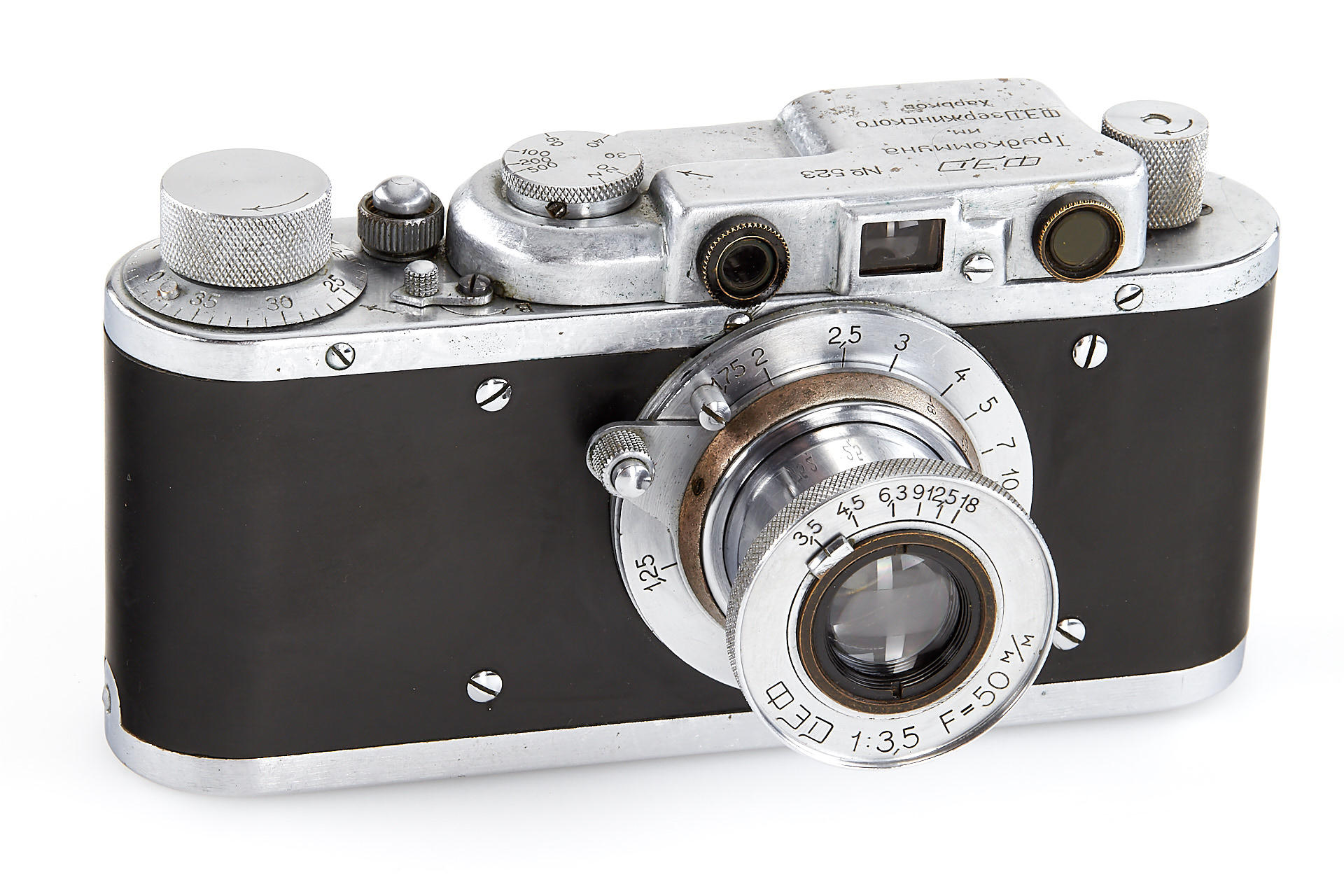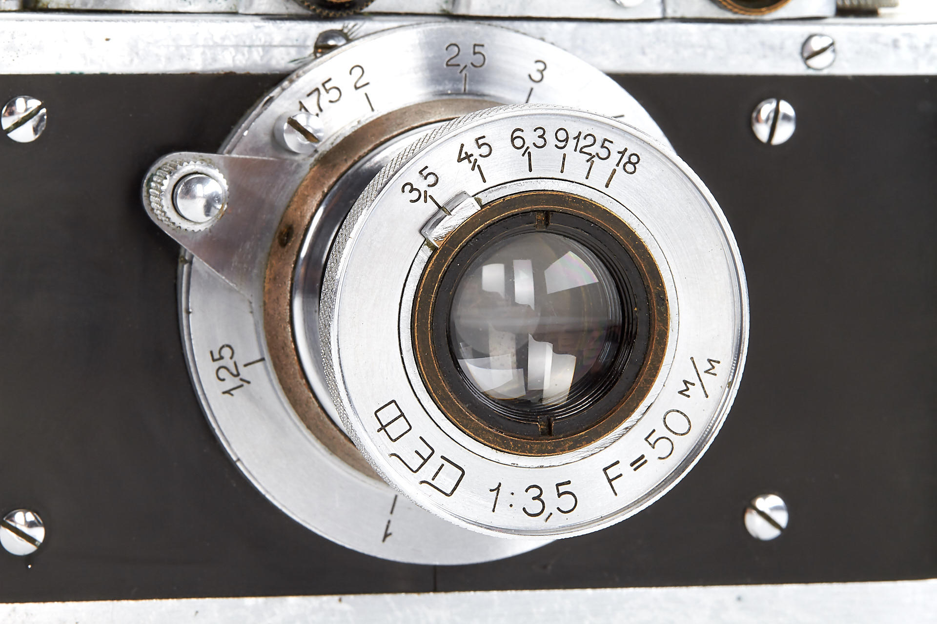 very early and rare Fed I, the third version with typical sings of machining process visible under the chrome finish, and unique, fine vulcanite covering without the texture known from the later cameras and Leicas, in very good condition, with matching Fed 3.5/50mm (stamped on the mounting flange with the camera number 523, DOF scale ring finished in brass), matching lens cap and worn early leather case