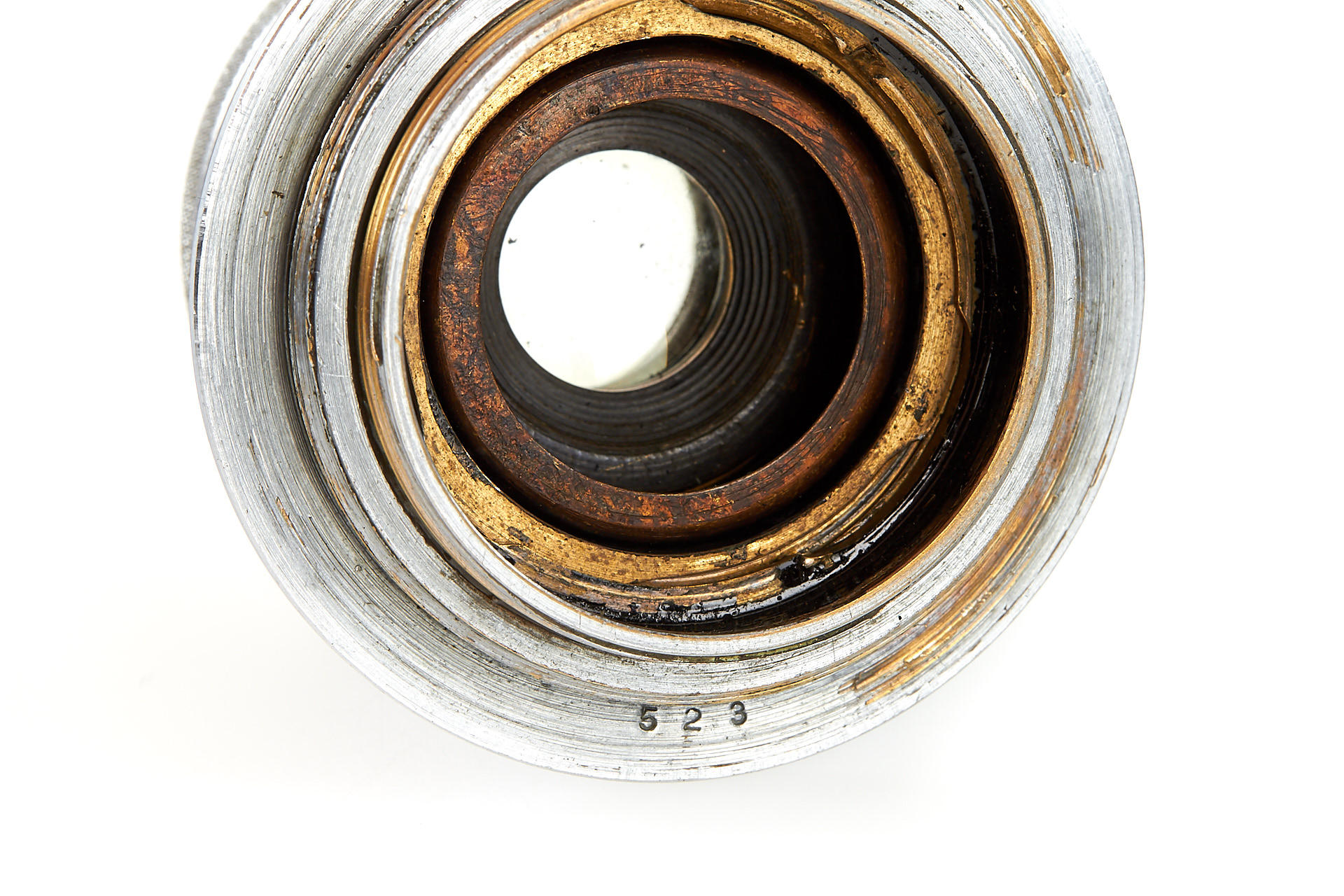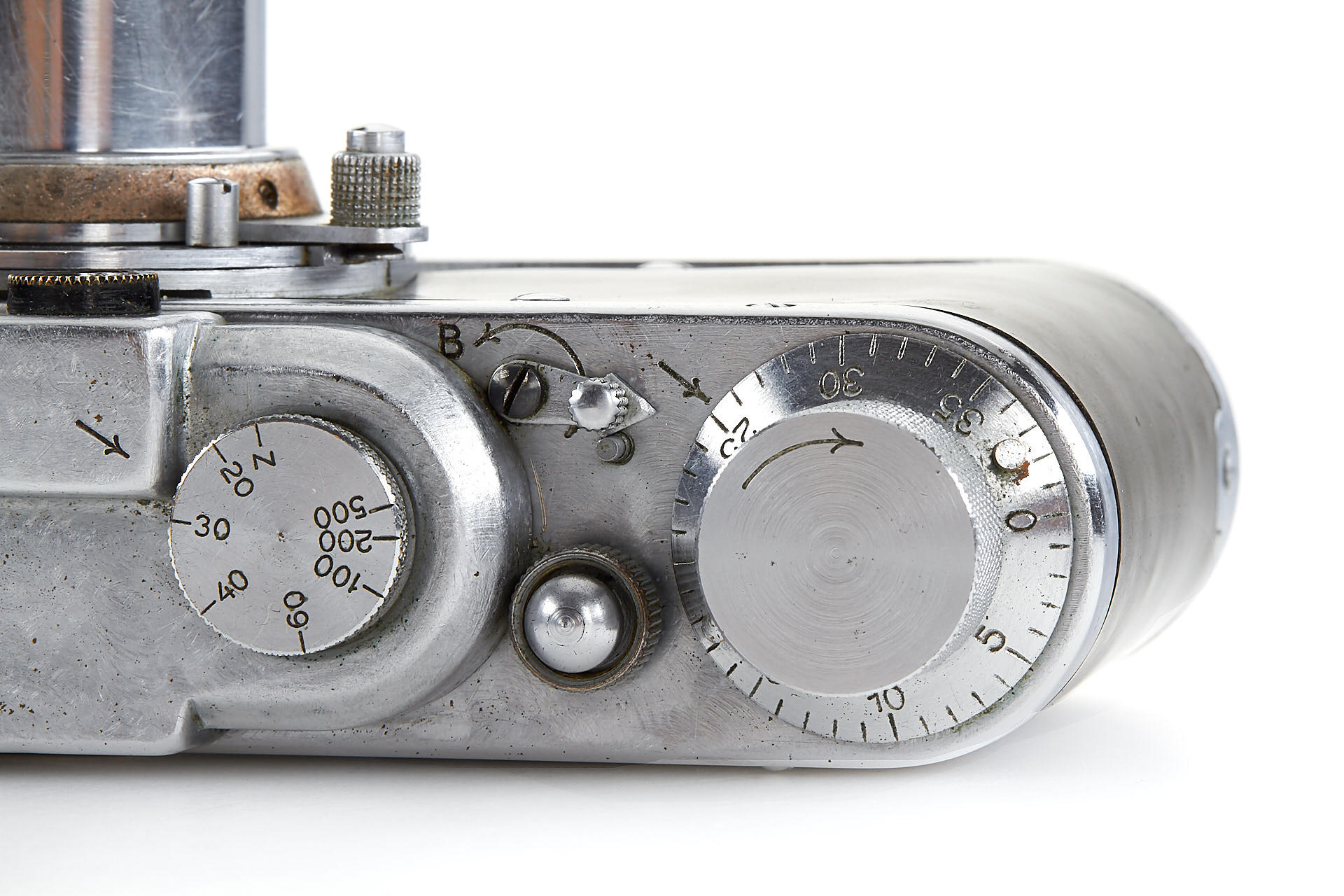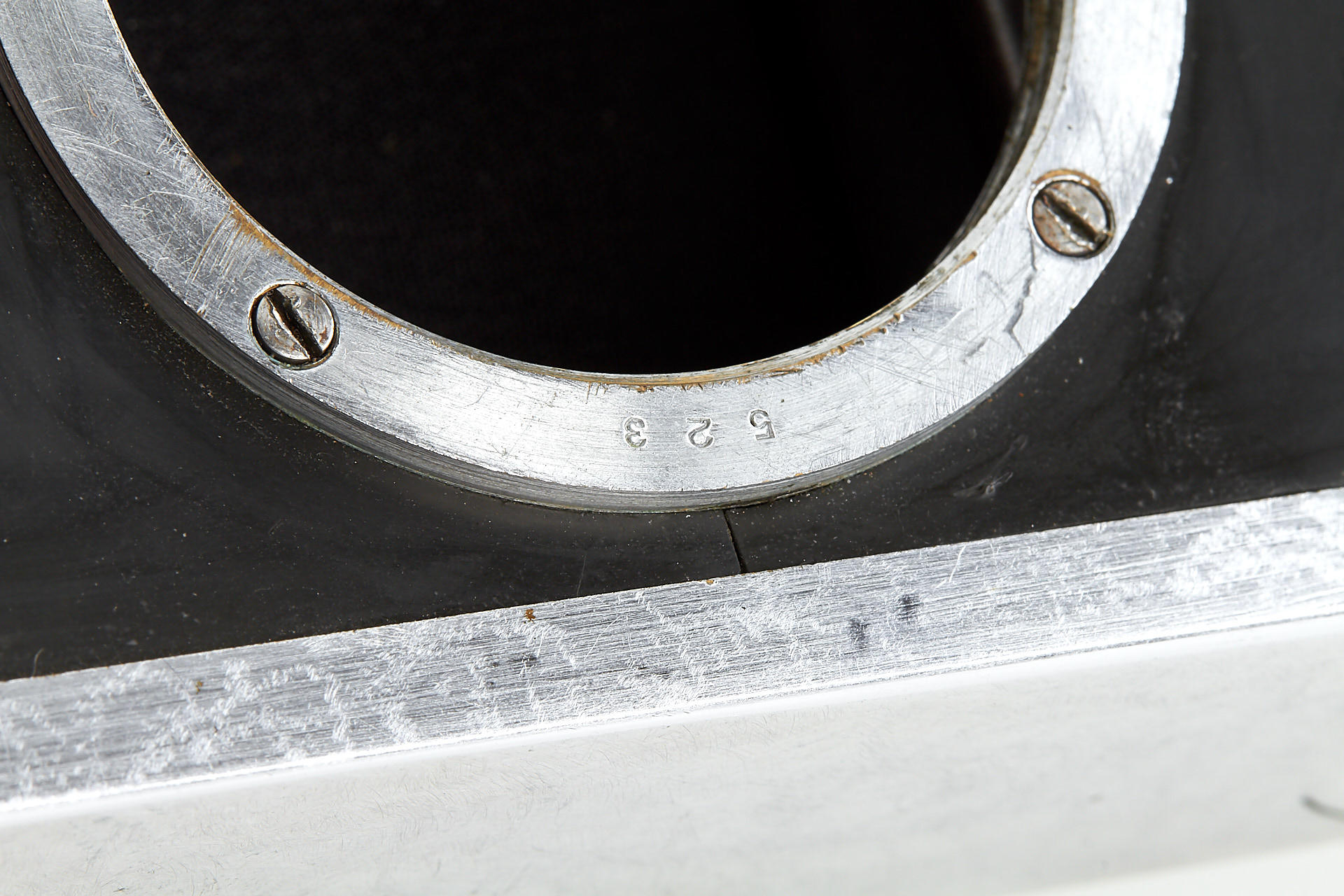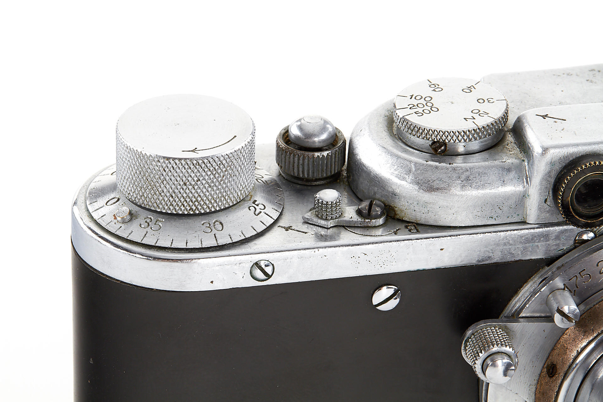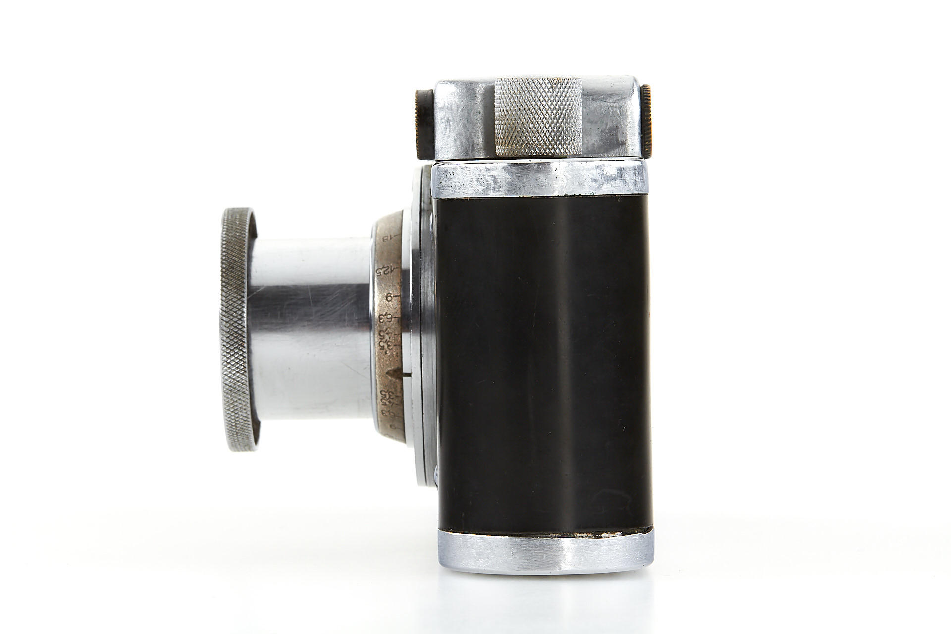 very early and rare Fed I, the third version with typical sings of machining process visible under the chrome finish, and unique, fine vulcanite covering without the texture known from the later cameras and Leicas, in very good condition, with matching Fed 3.5/50mm (stamped on the mounting flange with the camera number 523, DOF scale ring finished in brass), matching lens cap and worn early leather case
