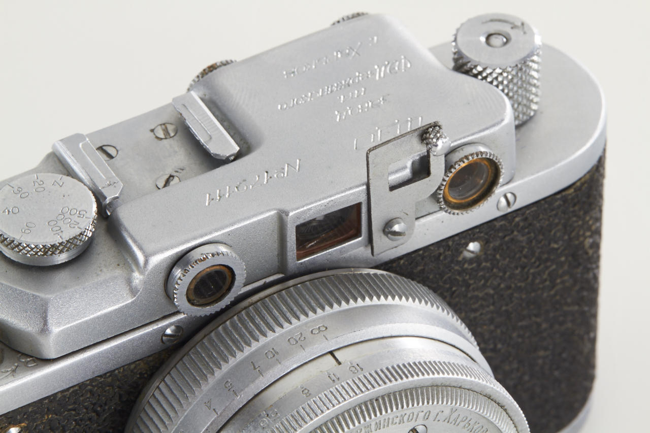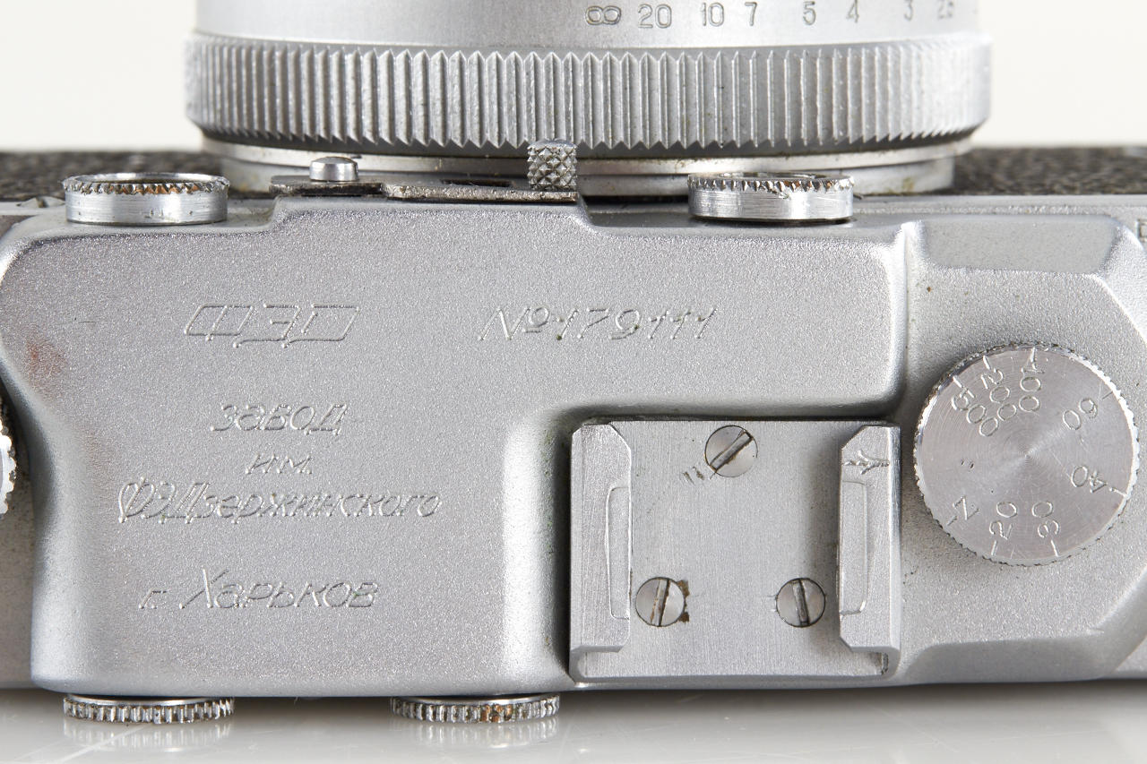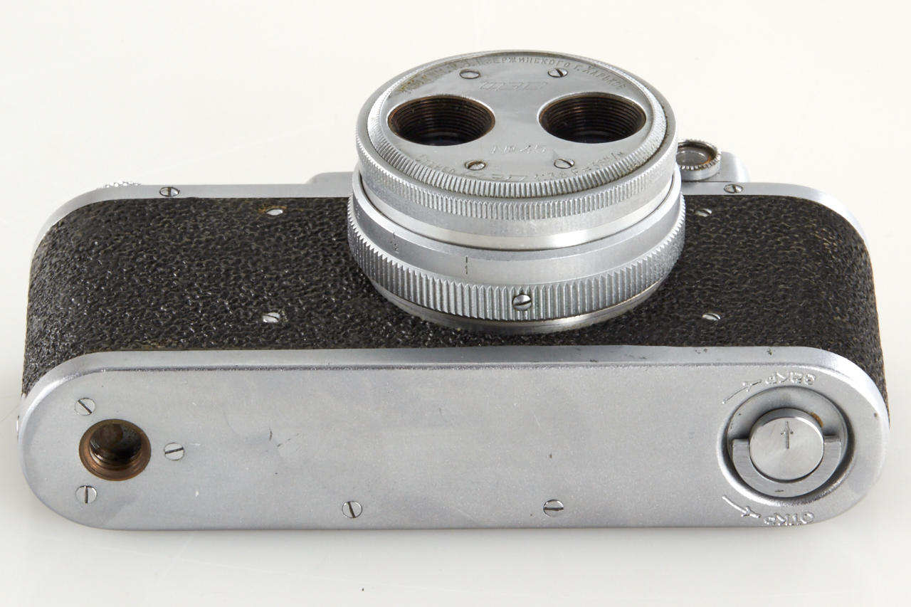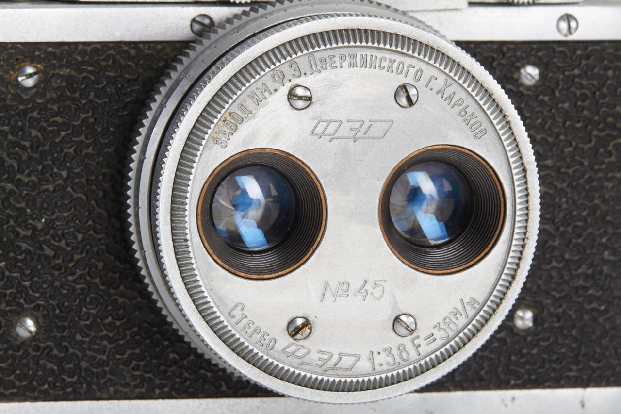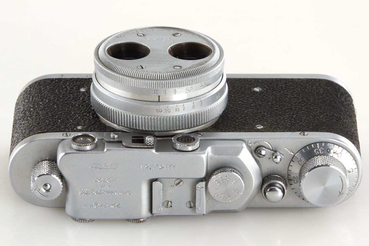rare FED Ie 'Berdsk' built in Siberia in 1946 with FED Stereo lens 3.8/38mm no.45, camera with 'swinging mask' for stereo exposures
