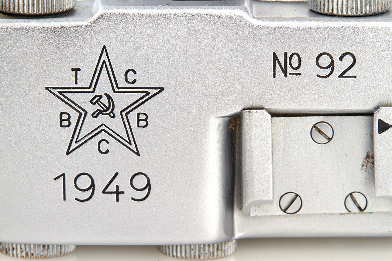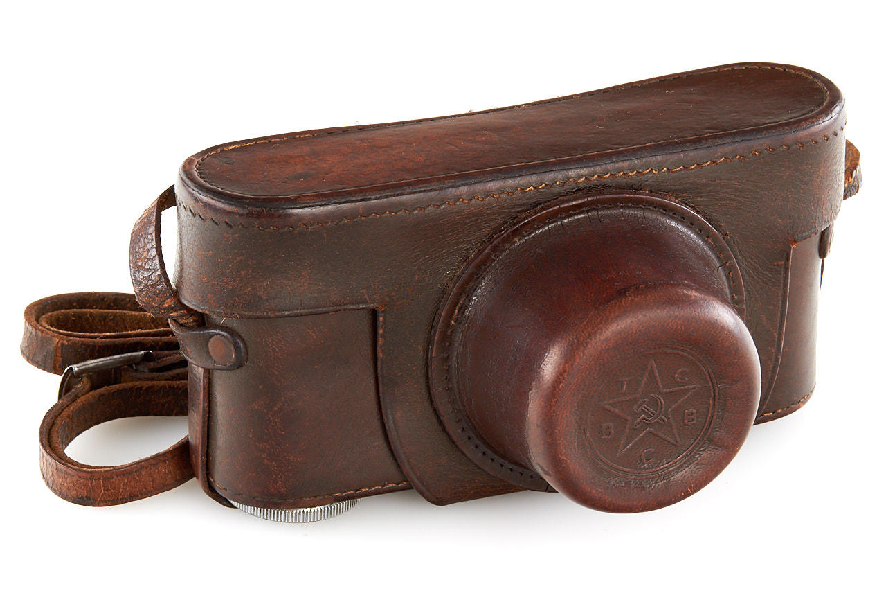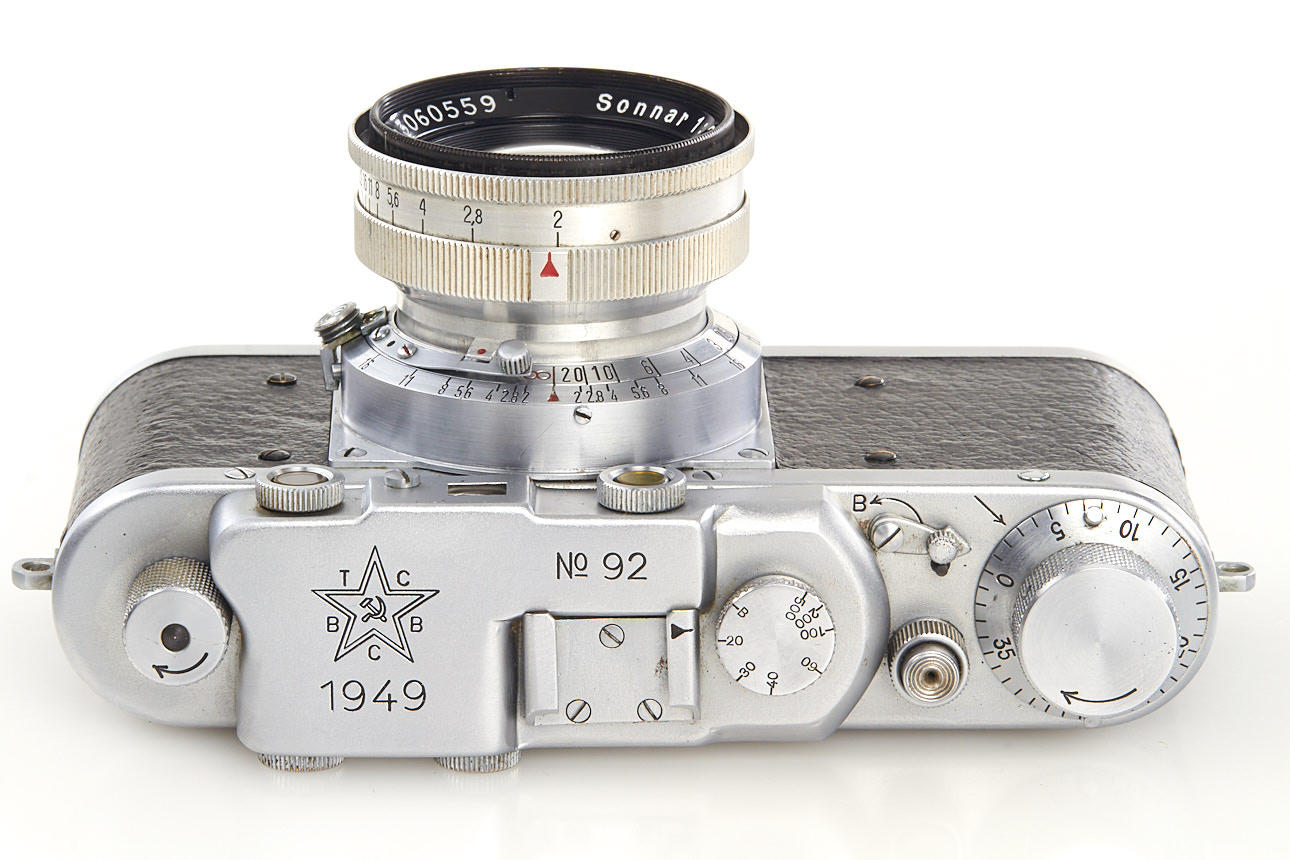 rare Russian Leica copy with Contax bayonet, the camera bears no maker's symbols, the TSVVS means Topographic Service of the Army Air Force, with matching Sonnar 2/5cm T no.3060559, in beautiful original condition and perfect working order, with very rare original lens cap 'TSVVS' and ever-ready case