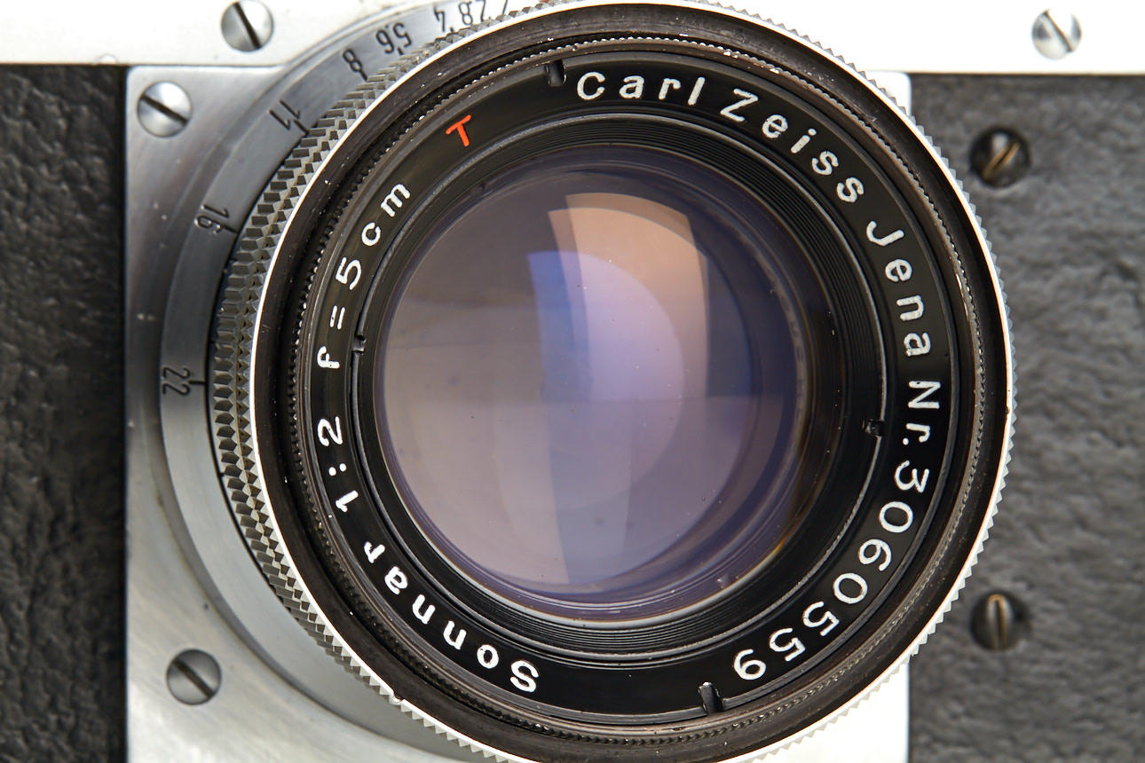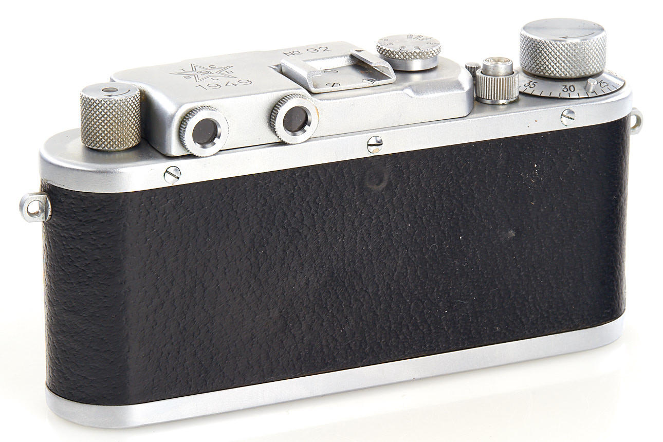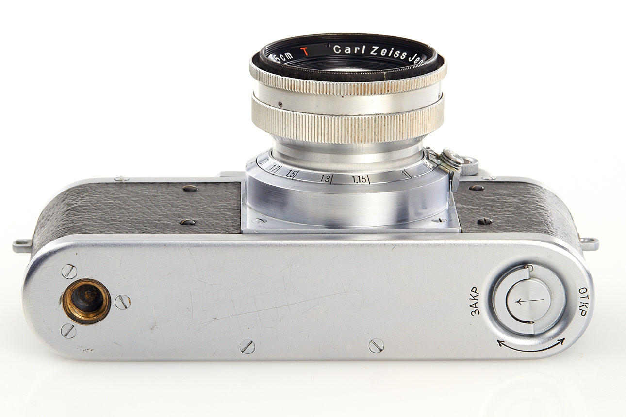 rare Russian Leica copy with Contax bayonet, the camera bears no maker's symbols, the TSVVS means Topographic Service of the Army Air Force, with matching Sonnar 2/5cm T no.3060559, in beautiful original condition and perfect working order, with very rare original lens cap 'TSVVS' and ever-ready case
