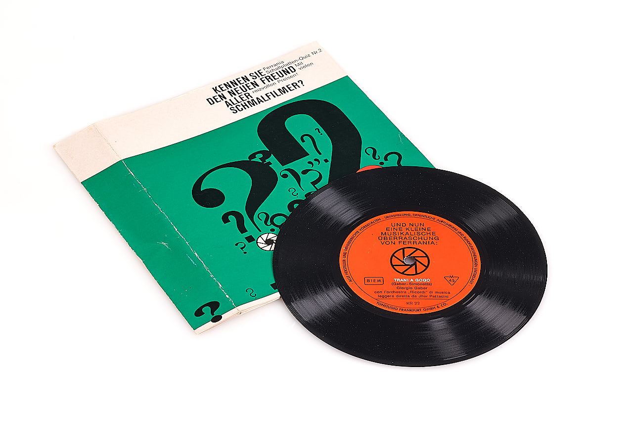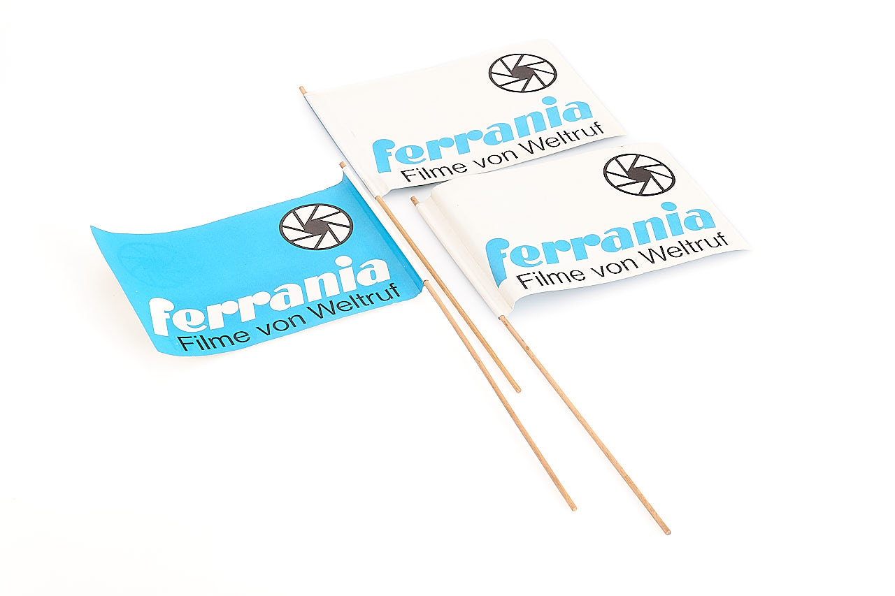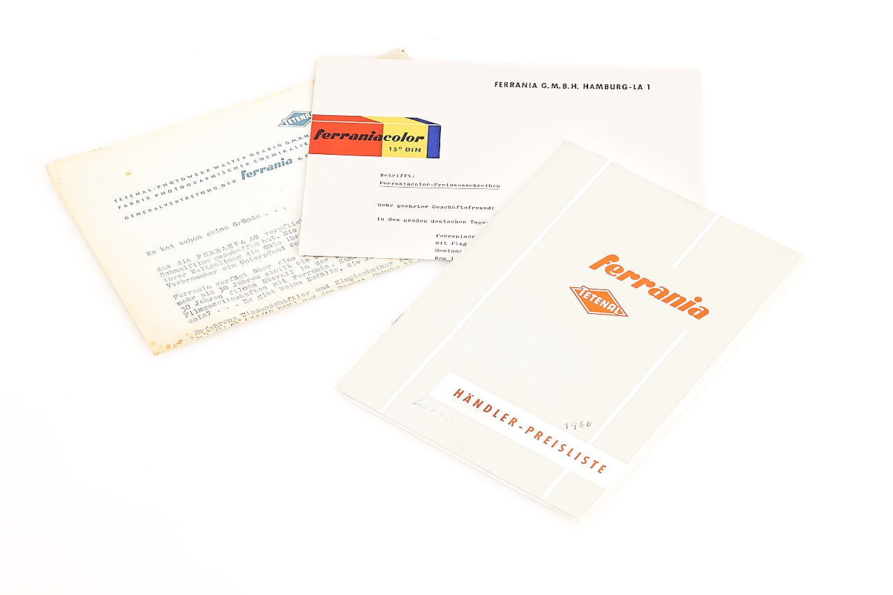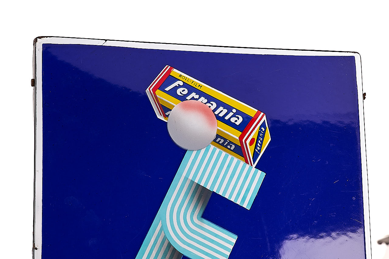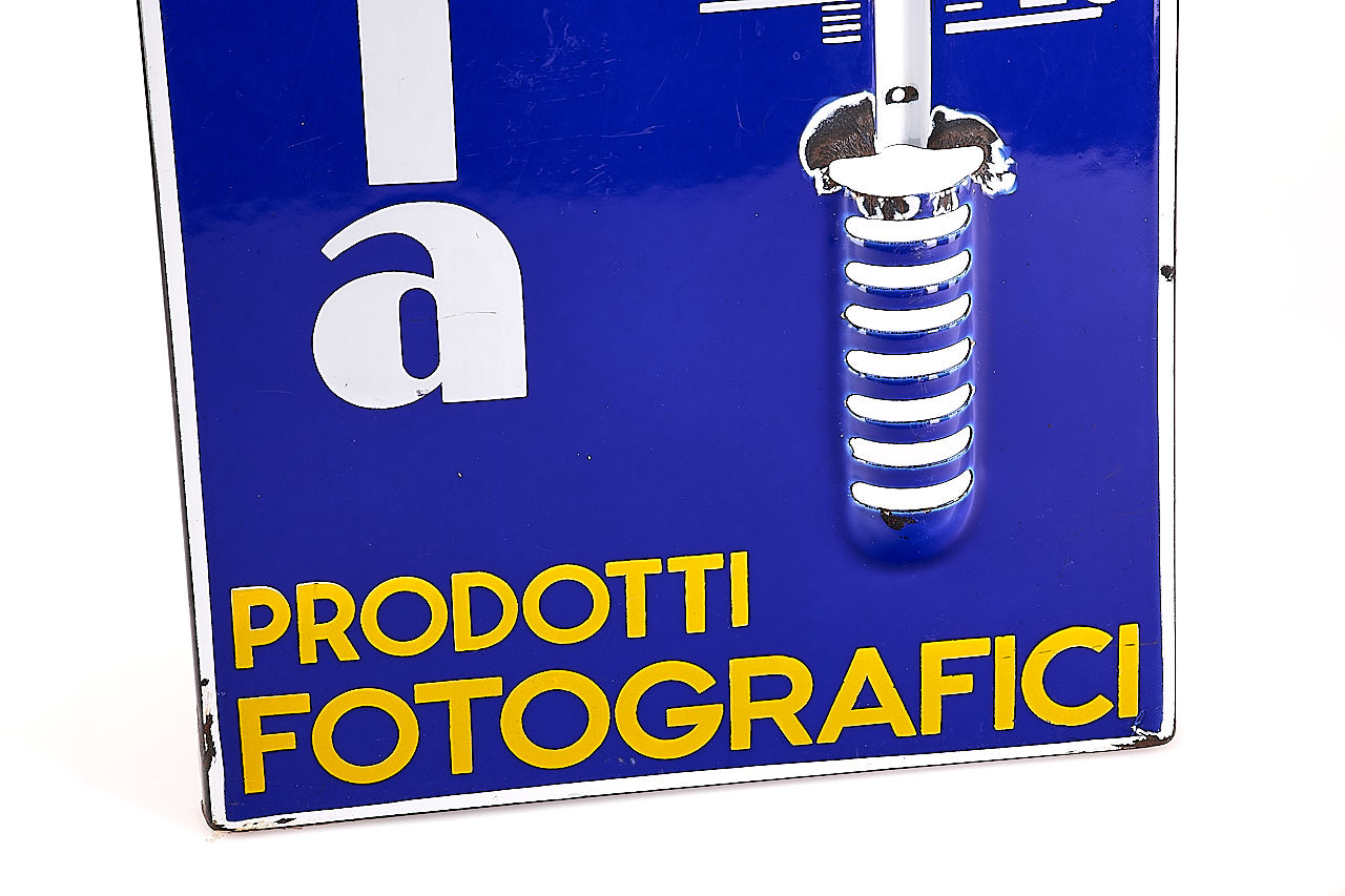 Attractive classic Ferrania advertising sign for the Italian market, 30x98cm enamel in very good condition, only showing some traces of corrosion, the thermometer is missing, together with German brochures, 3x flags and an interesting advertising vinyl.