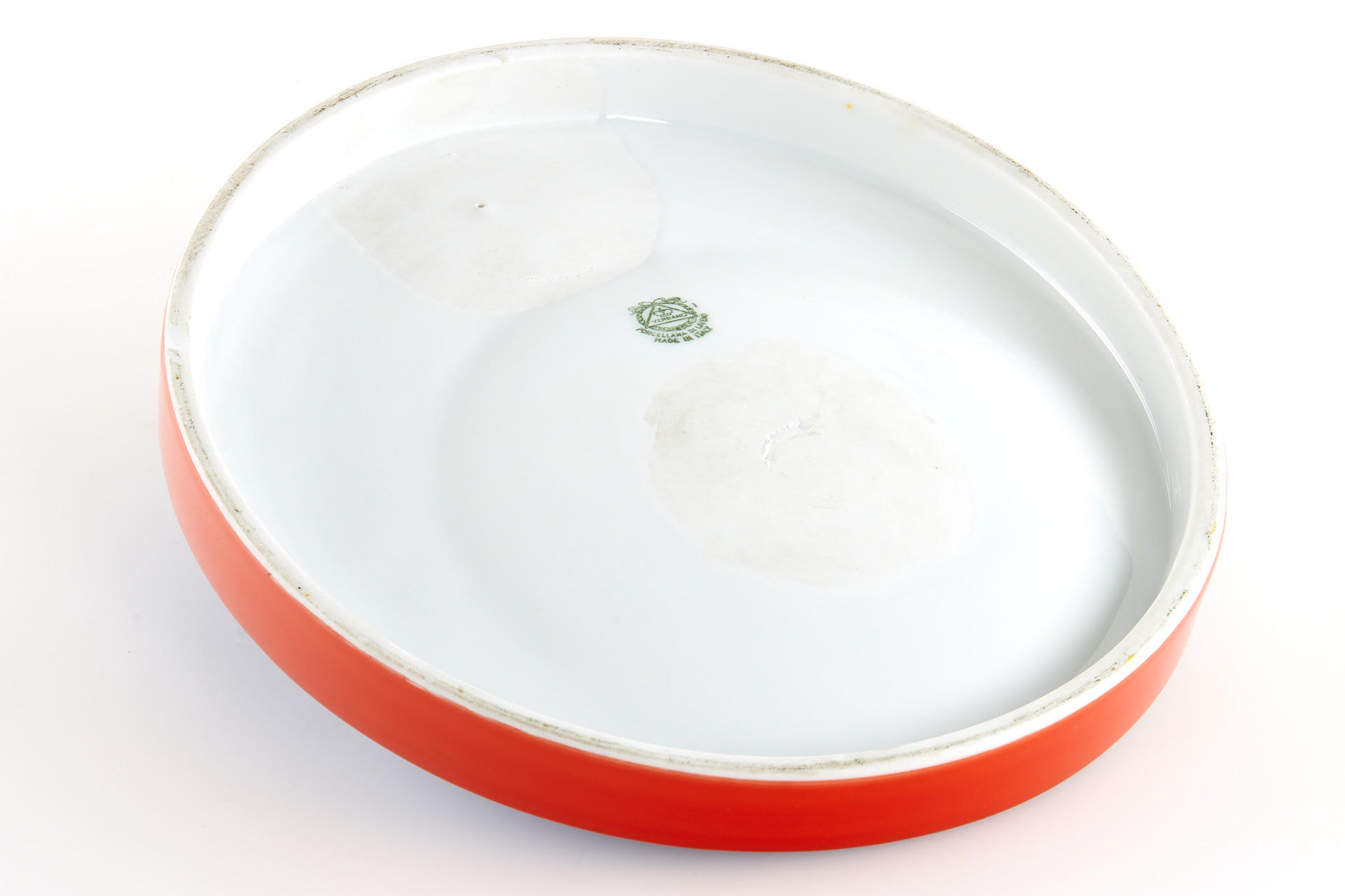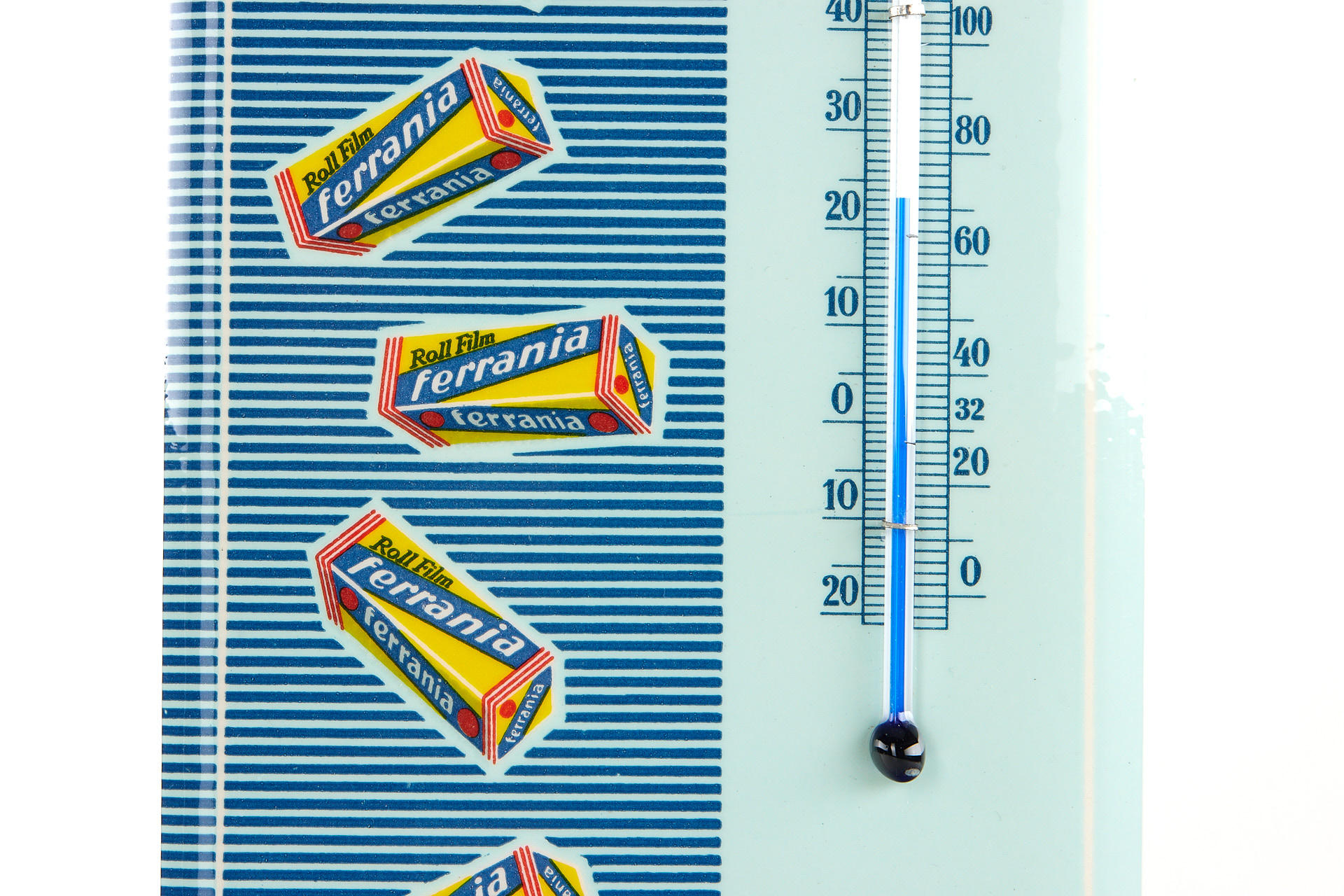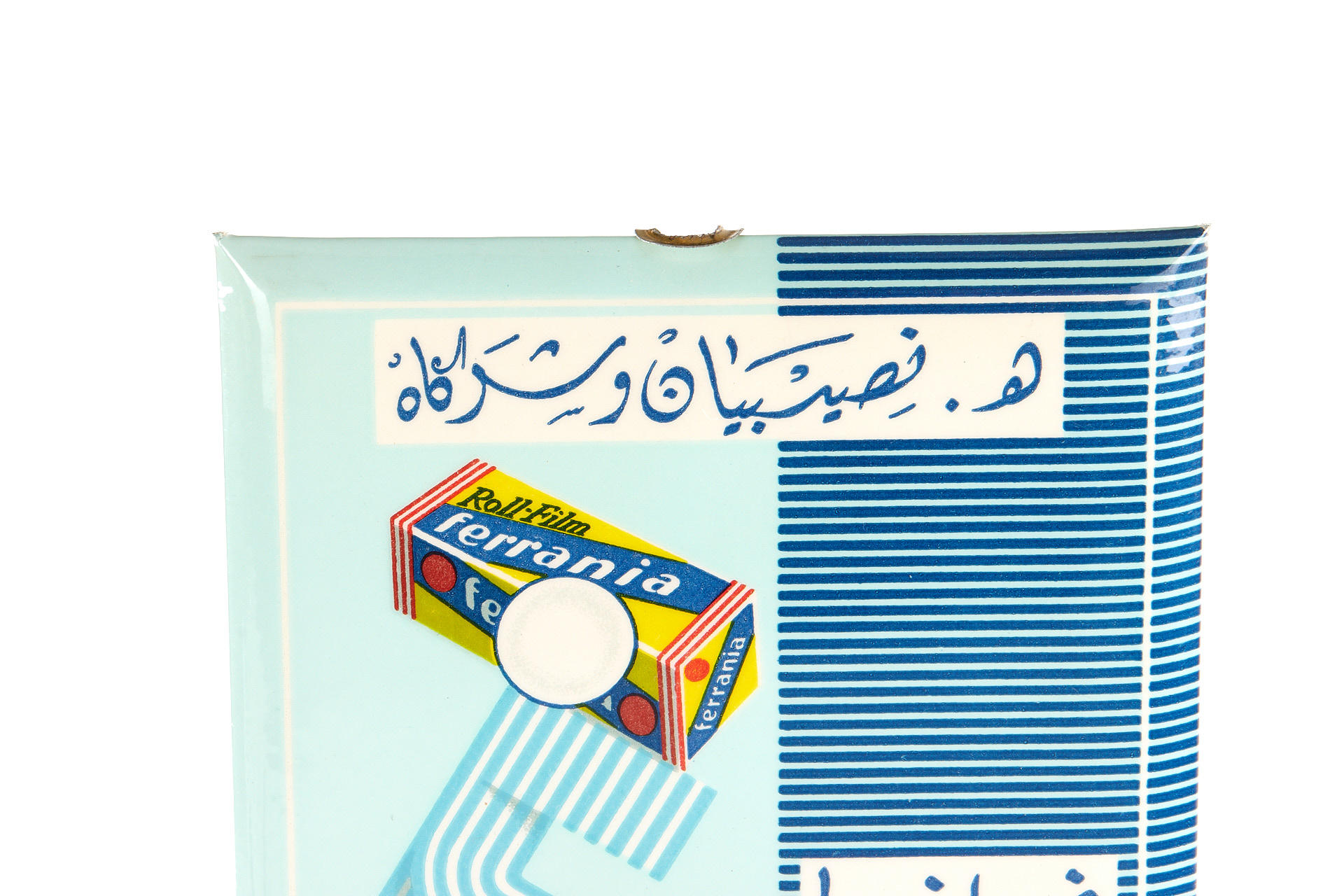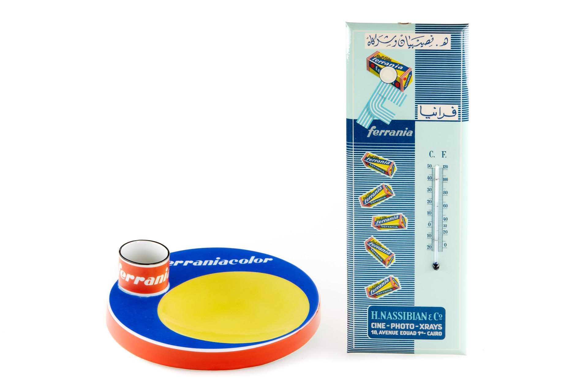 An interesting Egyptian dealer sign with thermometer, c.12x32cm, together with ceramic coin tray (c.21cm in diameter), both in near-mint condition