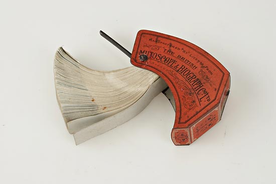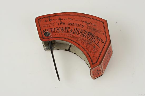 British Patent, 1898, November 3, No.23,158. Henry W. Short, The Filoscope, manufactured by license from the Mutoscope & Biograph Syndicate, Ltd., c. 1900, the red and black lithographed tin toy printed "Henry W. Short, Inventor & Patentee, London, Made in England", with brass lever which when turned causes 159 paper strips with 3/4 x 1" halftone photographs of a horse race at the track to flick giving the illusion of motion. The first paper strip printed "Kinetic Photograph giving the effect of living motion. To accomplish this a series of 190 instantaneous photographs are taken in rapid succession at the rate of about 20 per second".