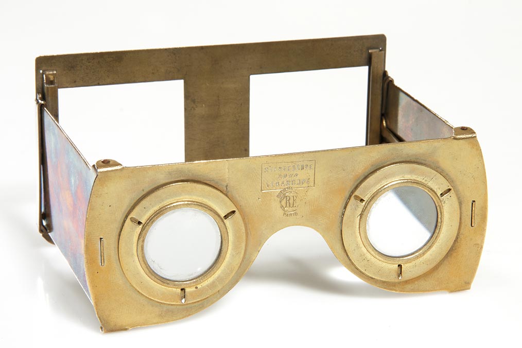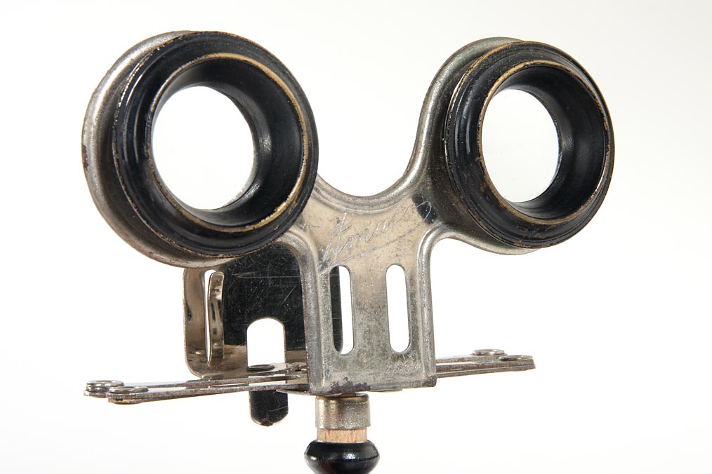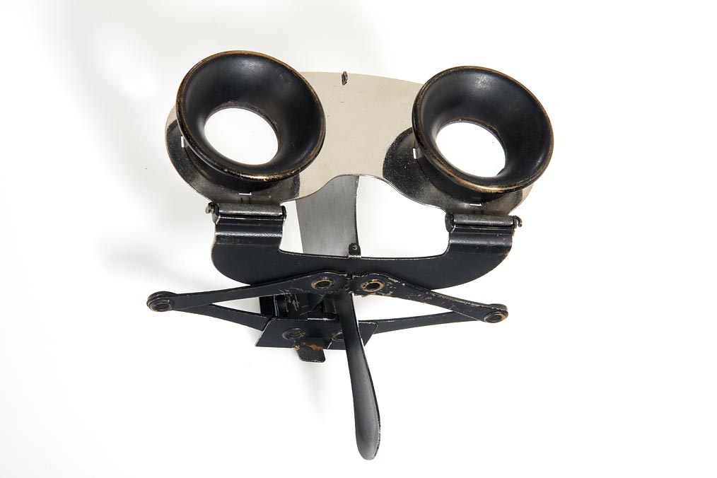 compilation of four folding viewers made of metal, (1) extremely rare Verascope viewer made entirely of brass, complete and in good condition, (2) 'Amato' viewer made of chrome plated tin, oculars and handle made of black painted wood, some wear, (3, 4) two Fitaskop viewers of different sizes, the smaller one with chrome plated front, the bigger one shows some wear. (4)