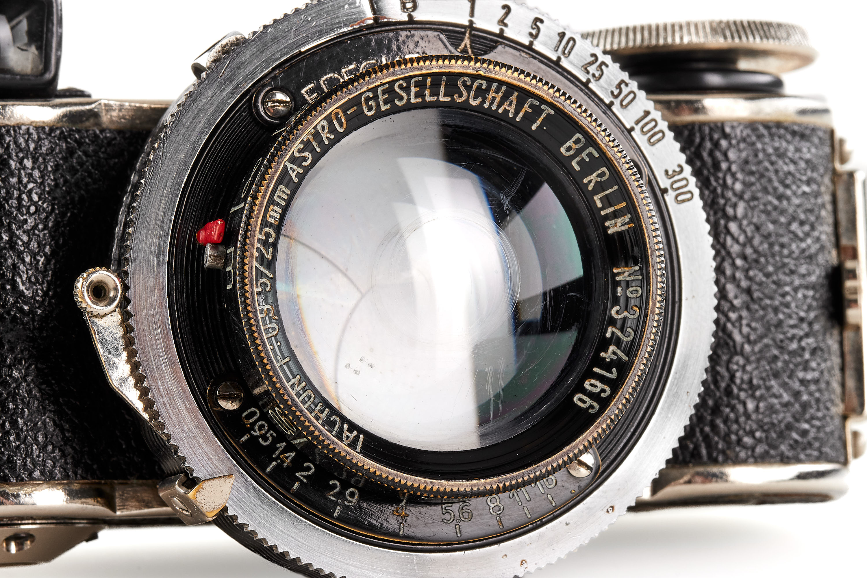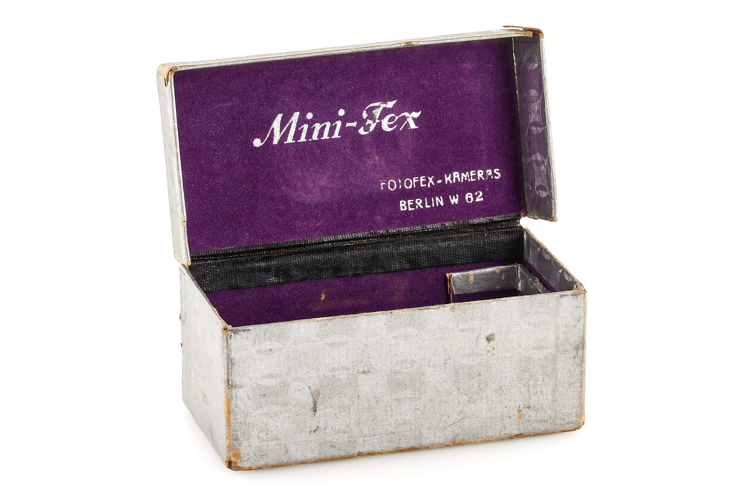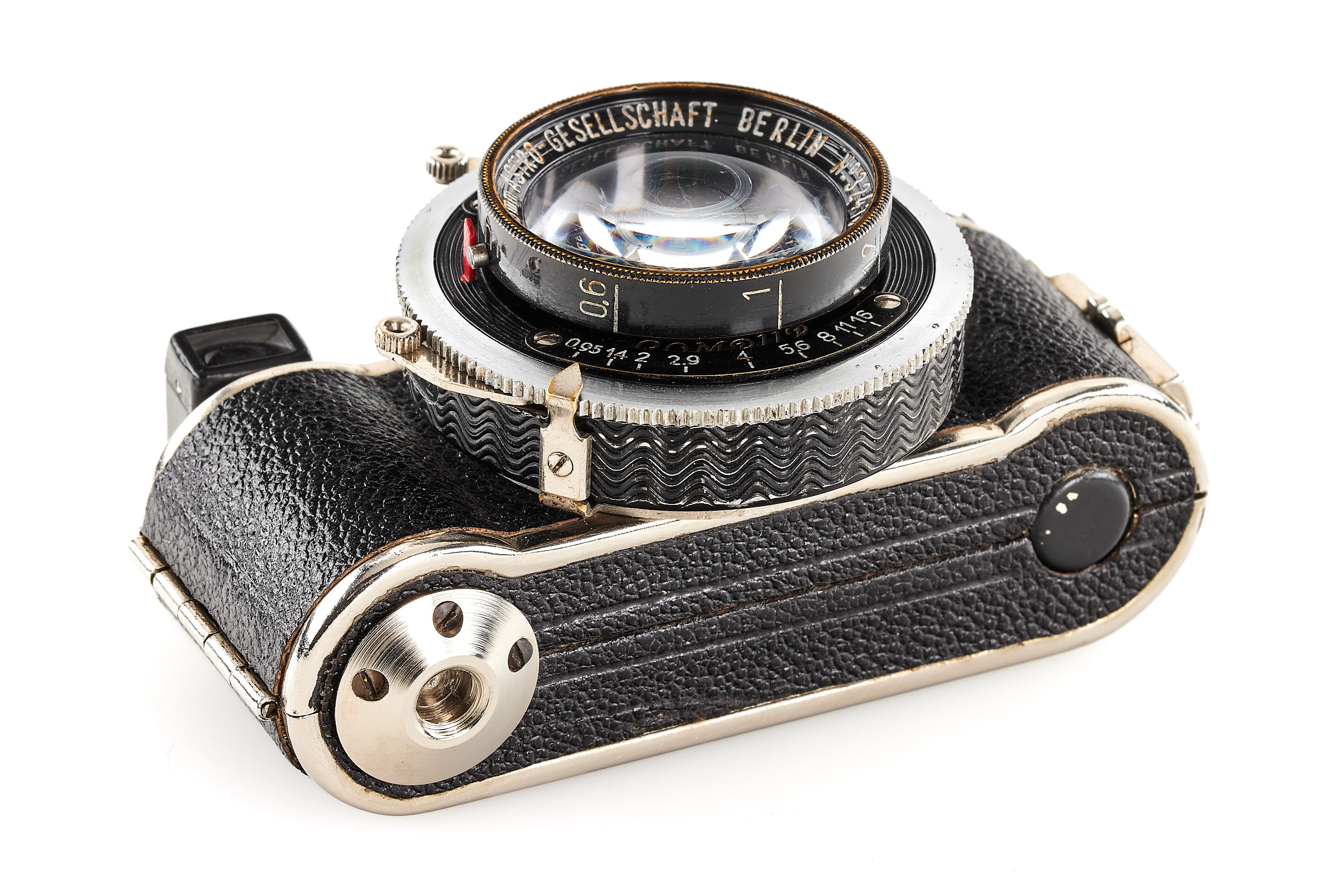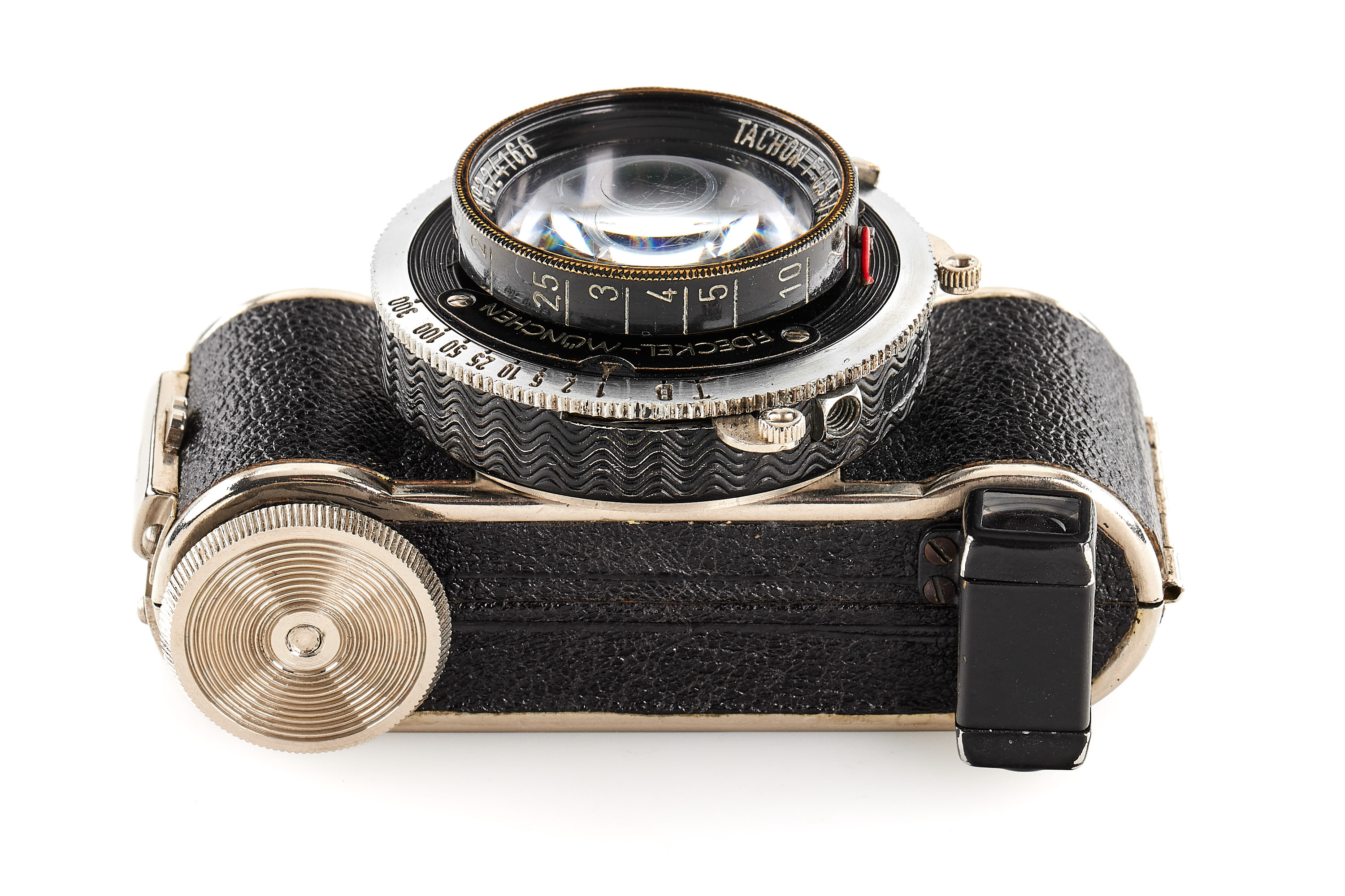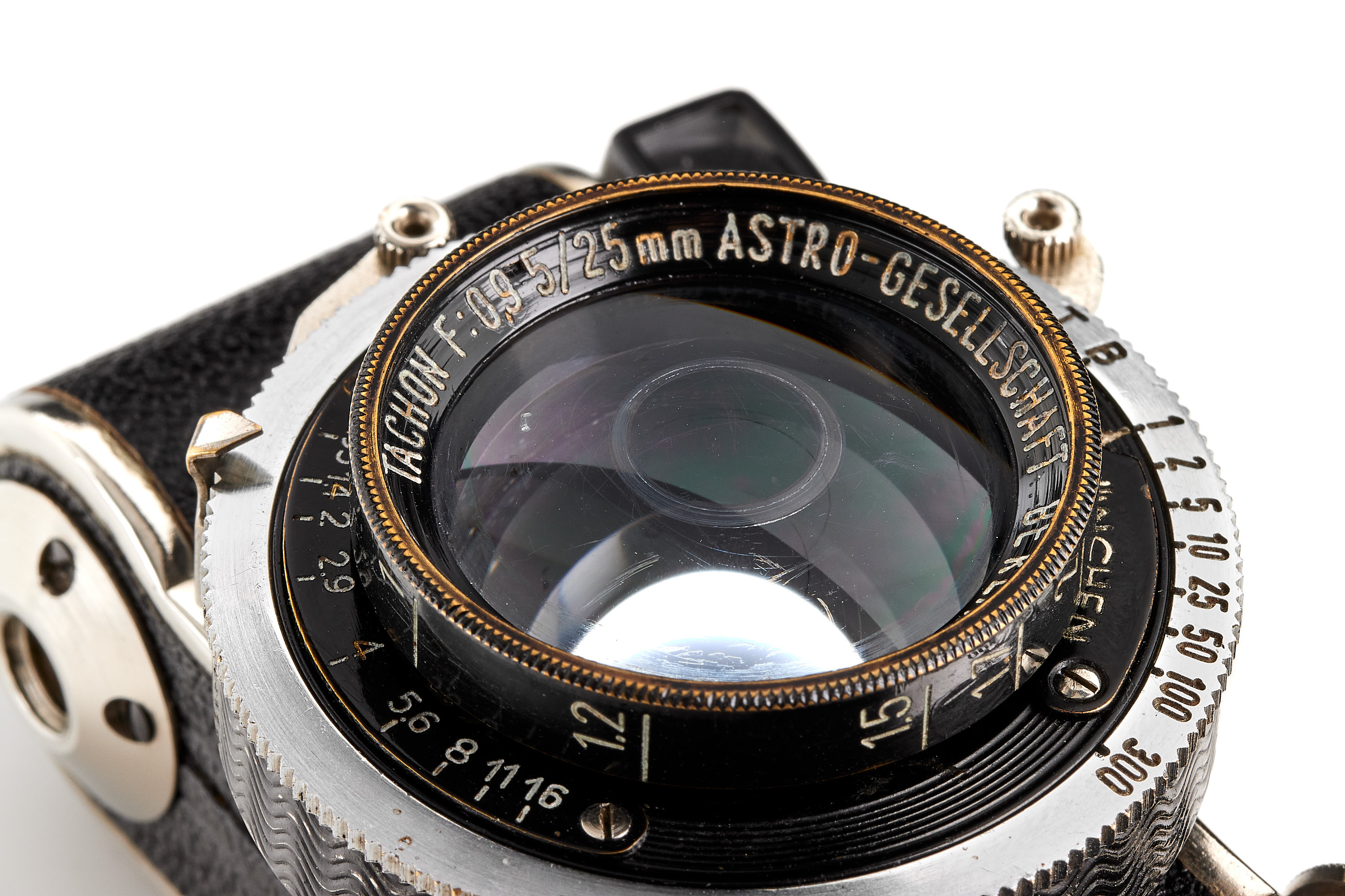 Subminiature camera for 36 exposures 13x18mm on 16mm film, in mint, original condition and working order, with extremely rare ultra-fast Astro-Berlin Tachon 0.95/25mm no.324166 in F. Deckel shutter, optics showing some scratches, with rare maker's box.