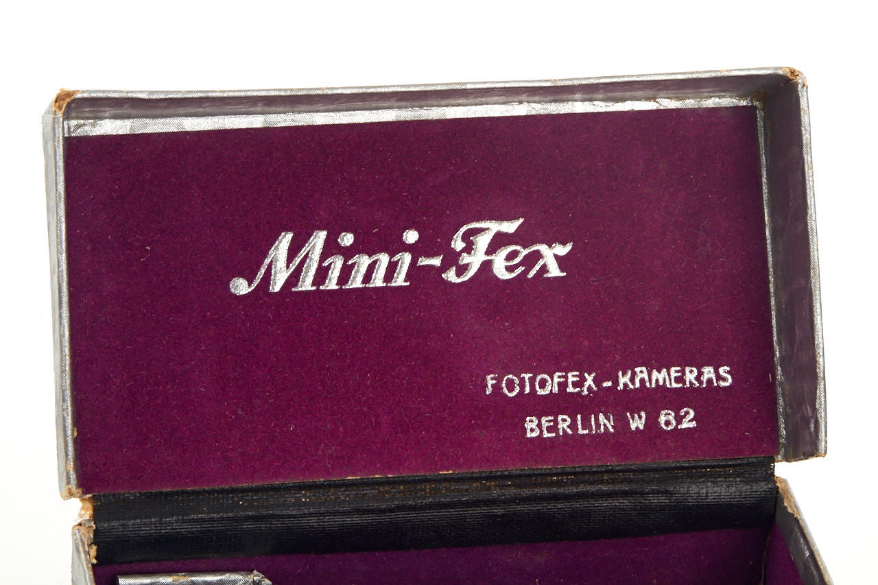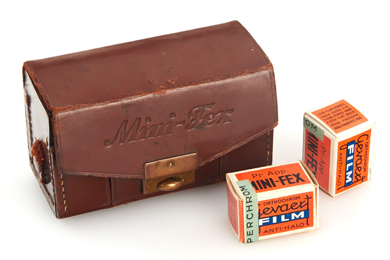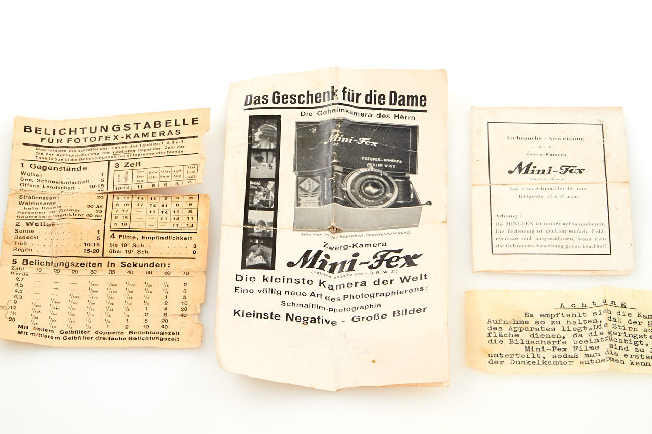 rare camera with fast Astro-Berlin Astrar 2.7/27mm no.16487 in Compur shutter, in excellent original condition - very special with original silver maker's box, two unused Gevaert Mini-Fex films, original Mini-Fex brochure with sales prices (the price for the Mini-Fex with Vidar lens was 45 Mark, the offered camera with the Astro Astrar was 155 Mark !), other original papers, rare brown leather case