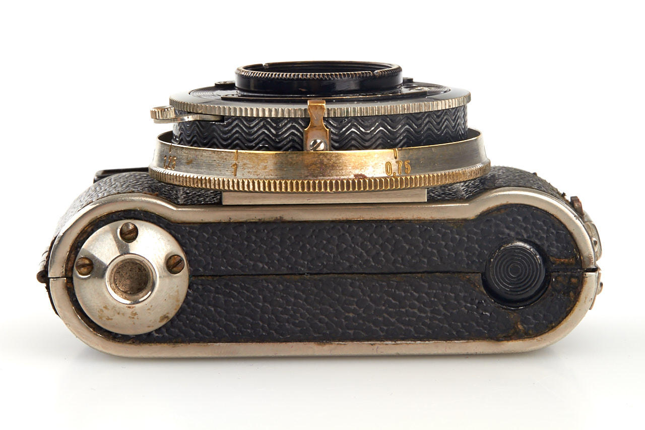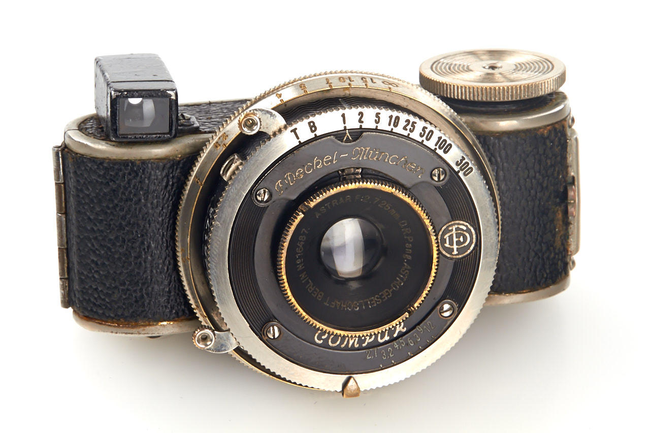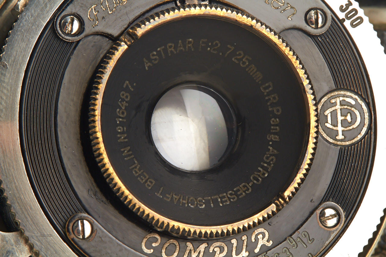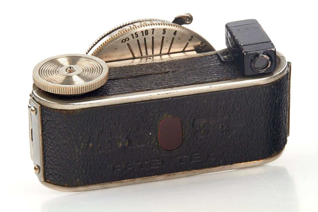 rare camera with fast Astro-Berlin Astrar 2.7/27mm no.16487 in Compur shutter, in excellent original condition - very special with original silver maker's box, two unused Gevaert Mini-Fex films, original Mini-Fex brochure with sales prices (the price for the Mini-Fex with Vidar lens was 45 Mark, the offered camera with the Astro Astrar was 155 Mark !), other original papers, rare brown leather case